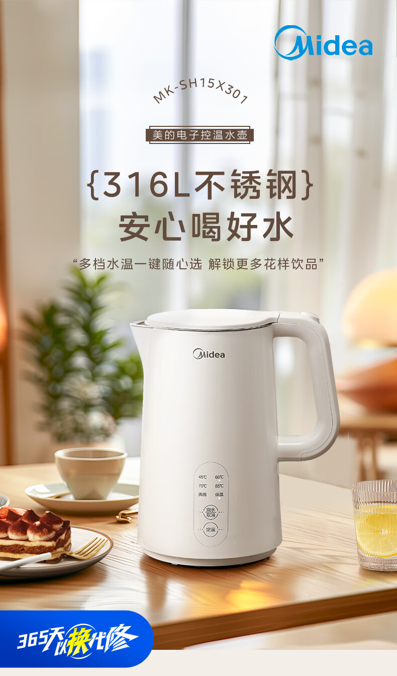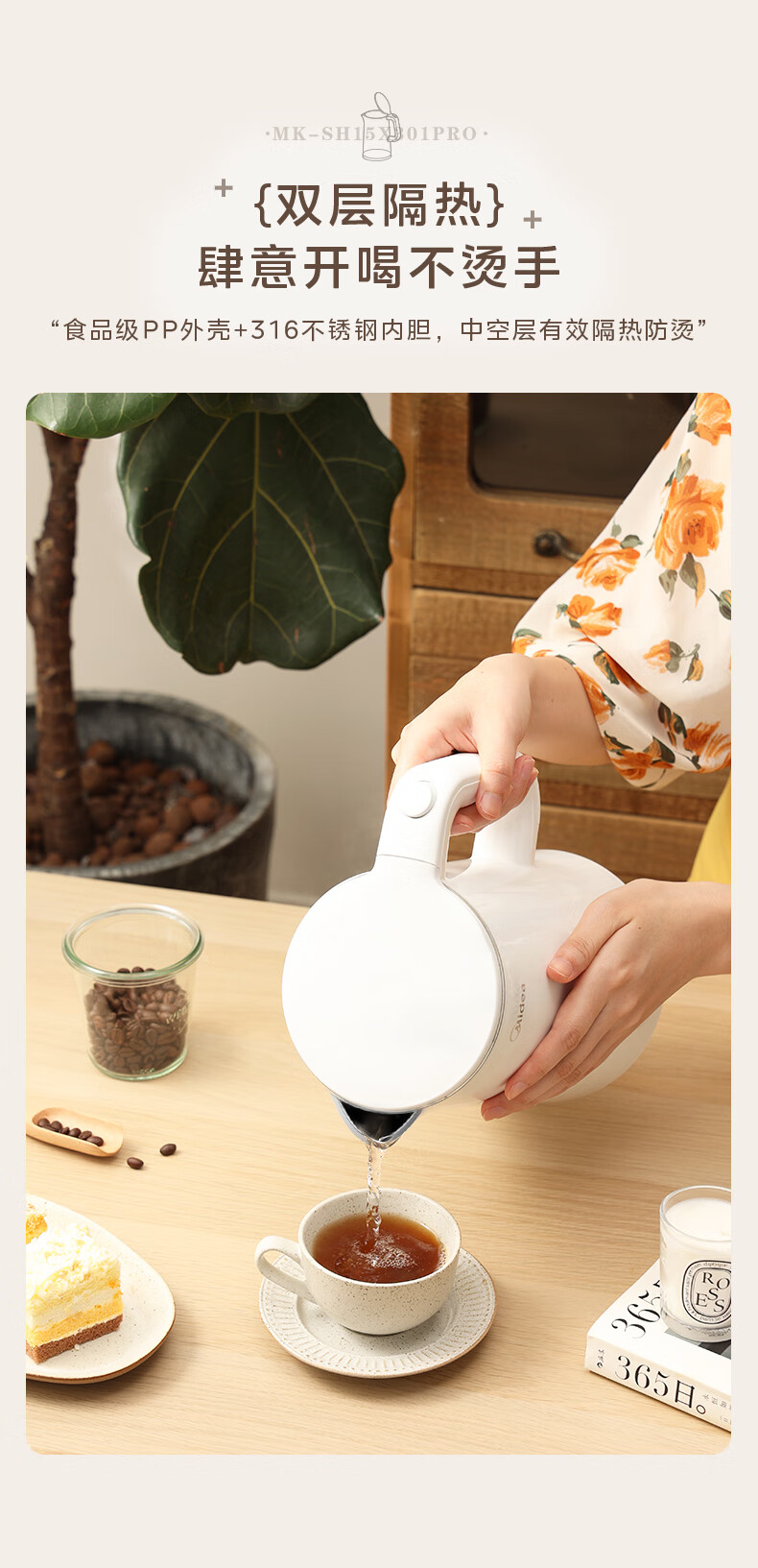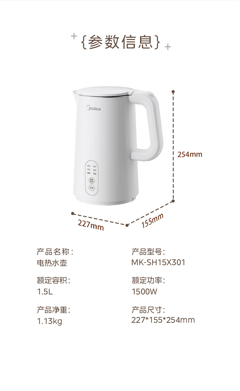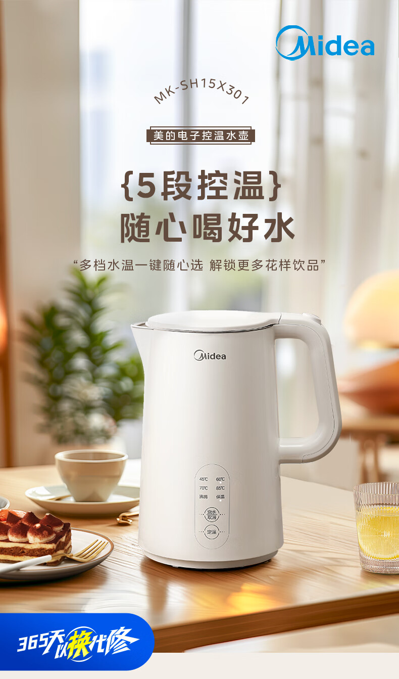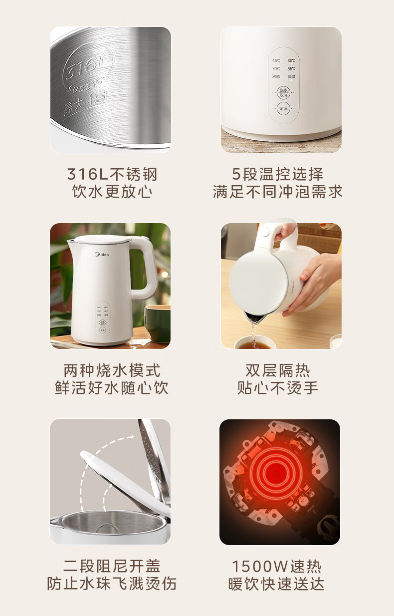 美的(Midea) 电热水壶 热水壶 家用大容量不锈钢烧水壶双层防烫 一体无缝内胆电水壶开水壶 1.5L 【304不锈钢恒温保温一体】-最新款