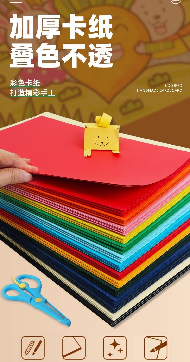 A4彩色卡纸8K4开A3手工硬卡纸折纸儿童彩纸小学生幼儿园专用黑白色加厚A5红黄绿剪纸大张24色卡纸 10色各2张共20张//加厚加硬卡纸 A4(210*297mm)