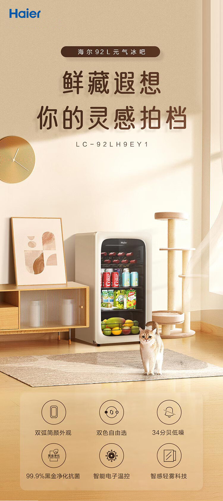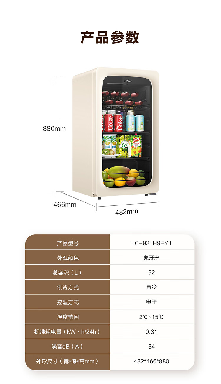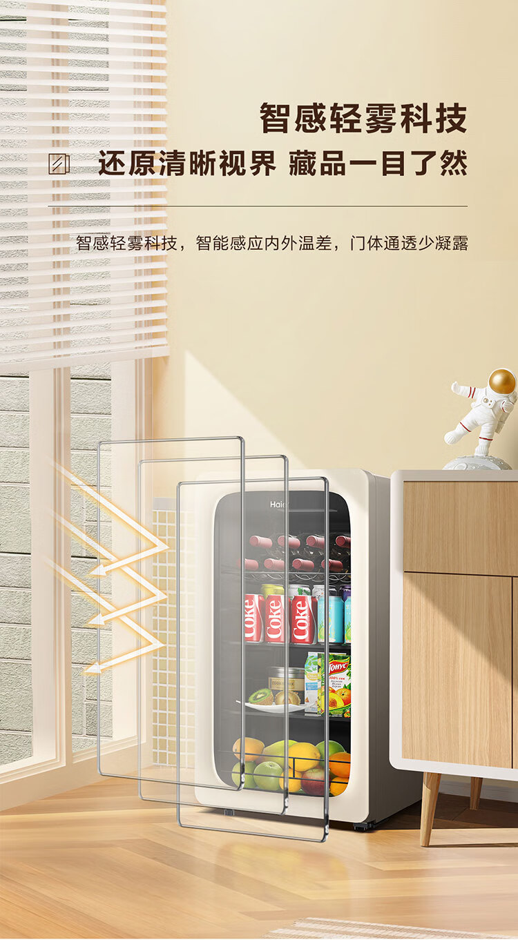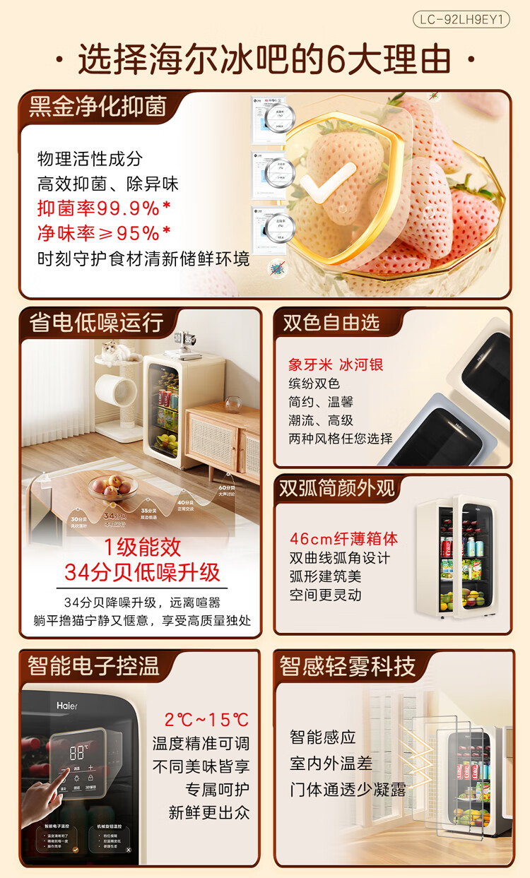 海尔(Haier)92升元气冰吧家用 客厅茶叶冷藏柜保鲜柜办公室小冰箱小型迷你饮料水果展示柜LC-92LH9EY1国家补贴