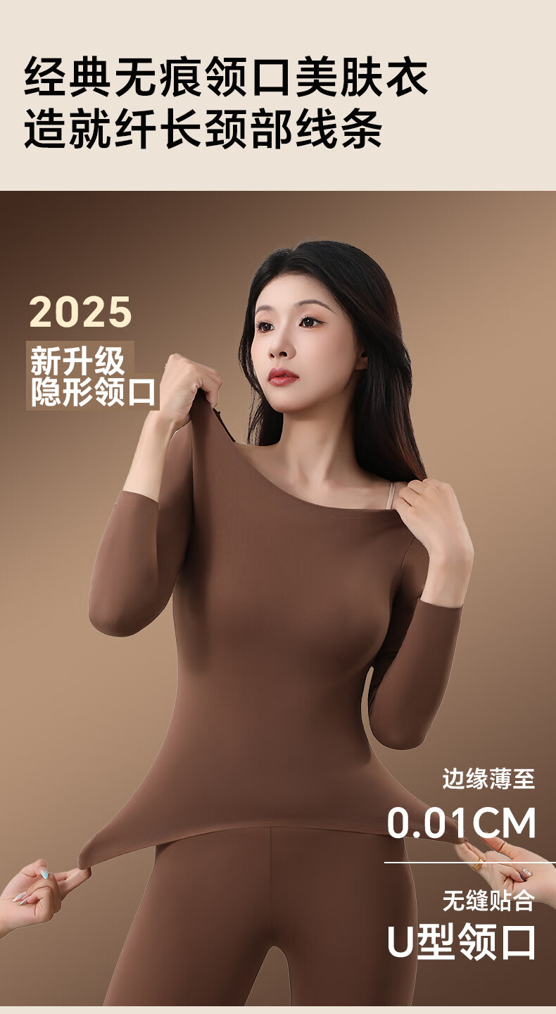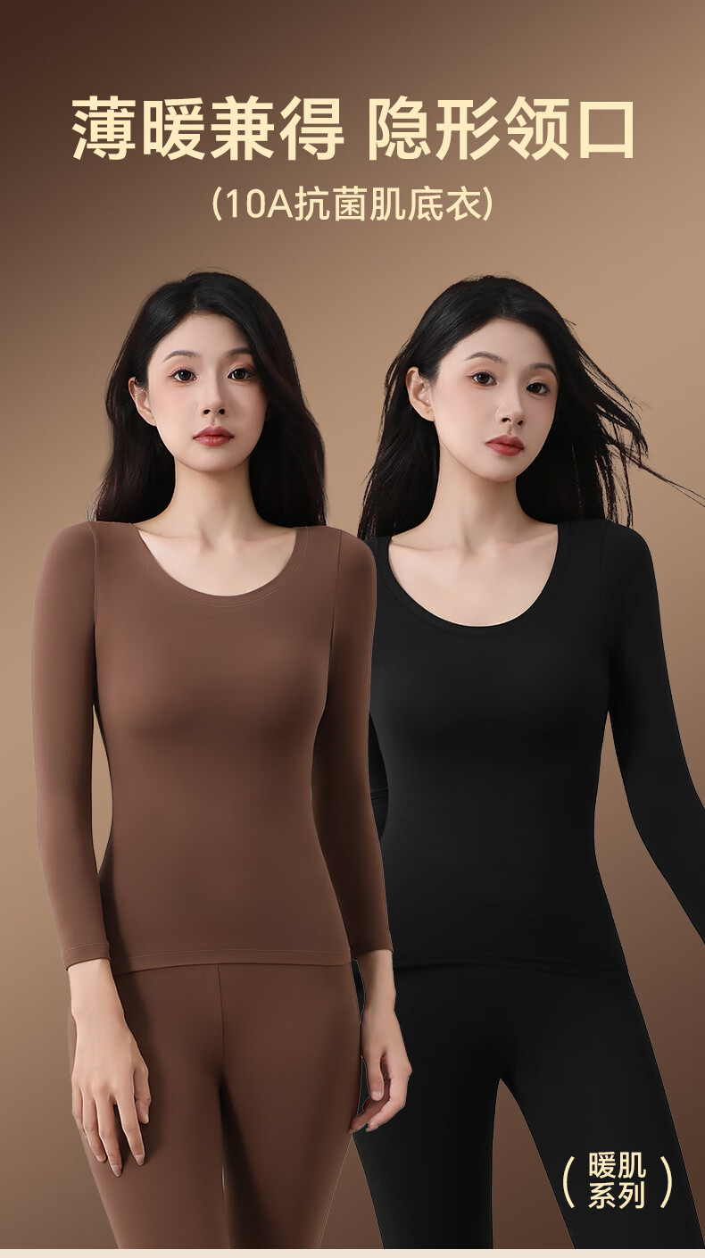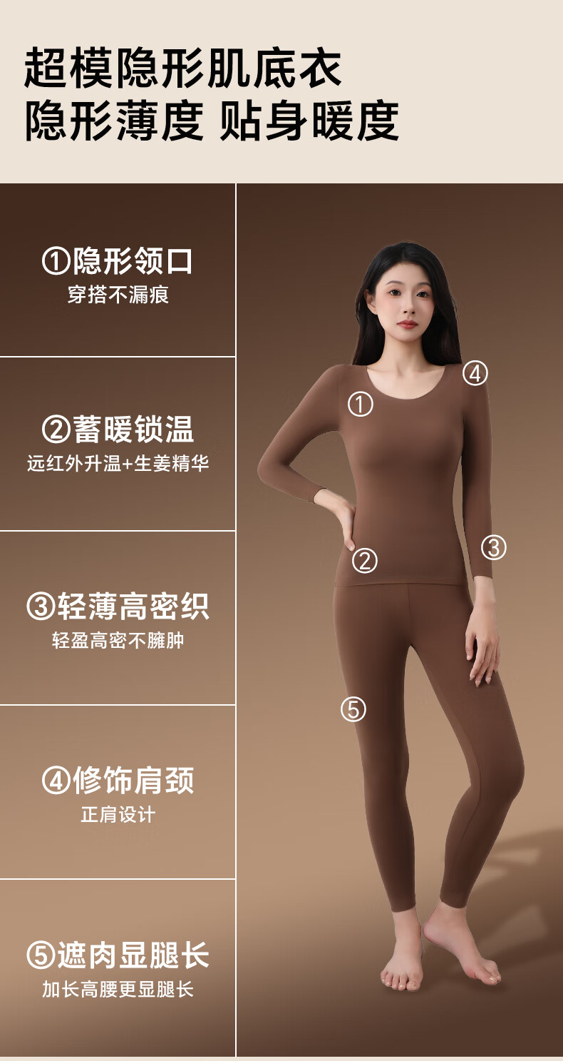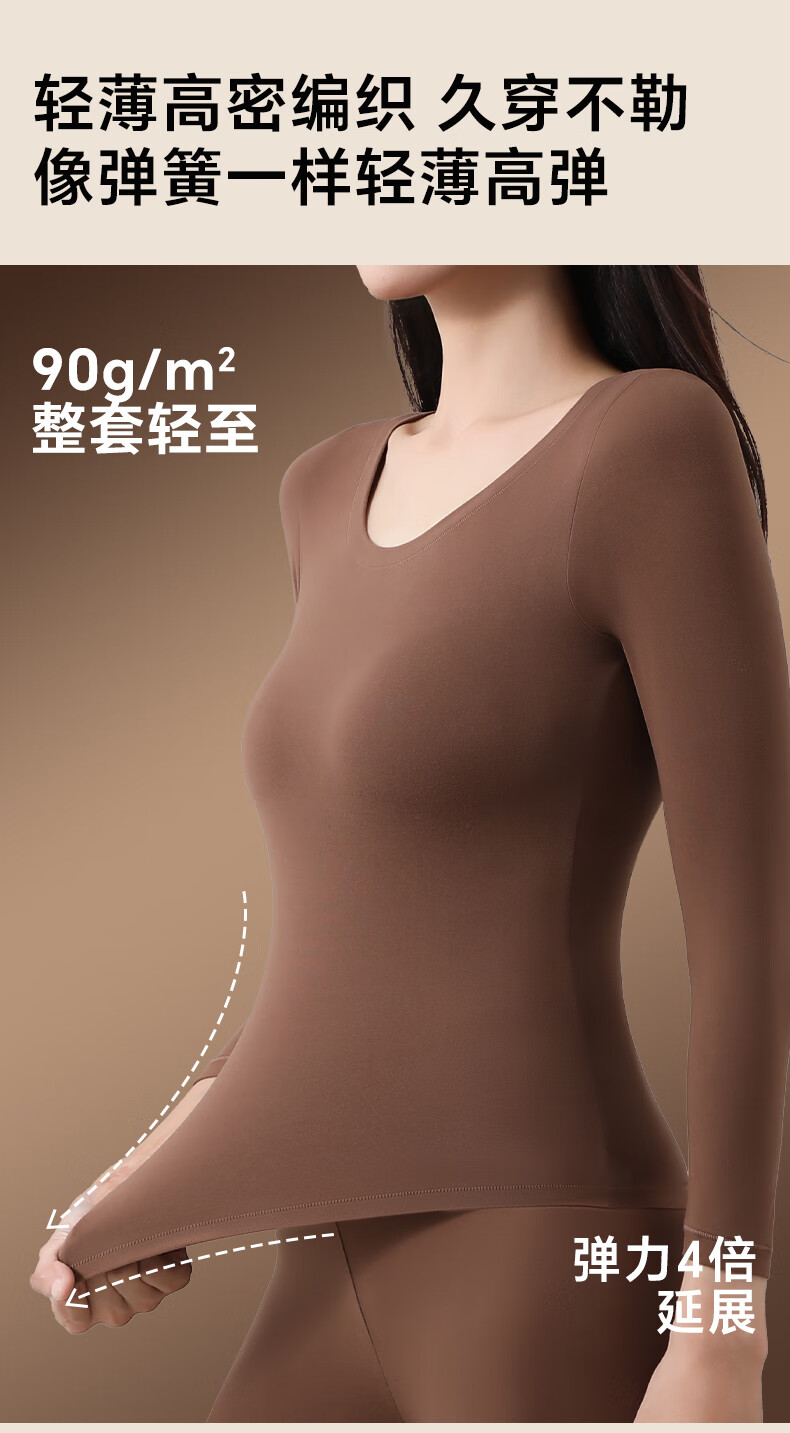 ROVO超薄保暖内衣女亲肤防静电隐形肌底美肤衣发热孕秋衣秋裤套装 可可棕+粉底肤【10A抗菌 适用于5℃~15℃】 L【适用于90-120斤】