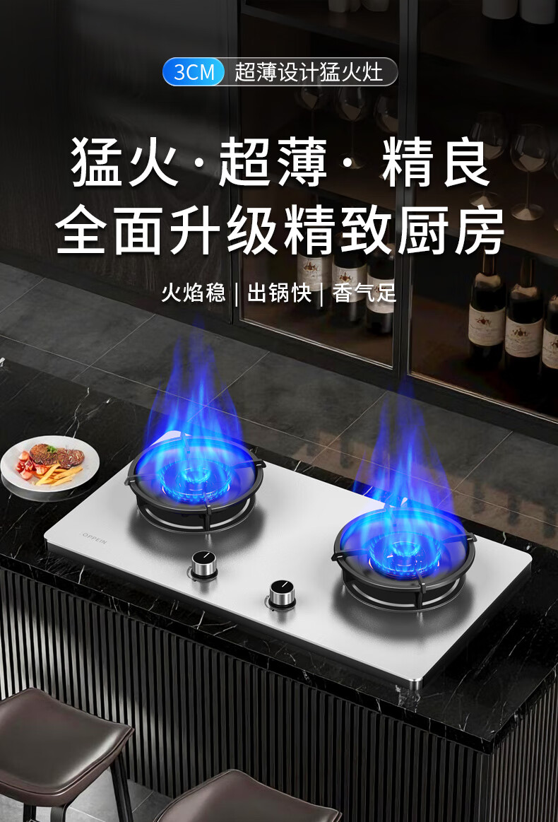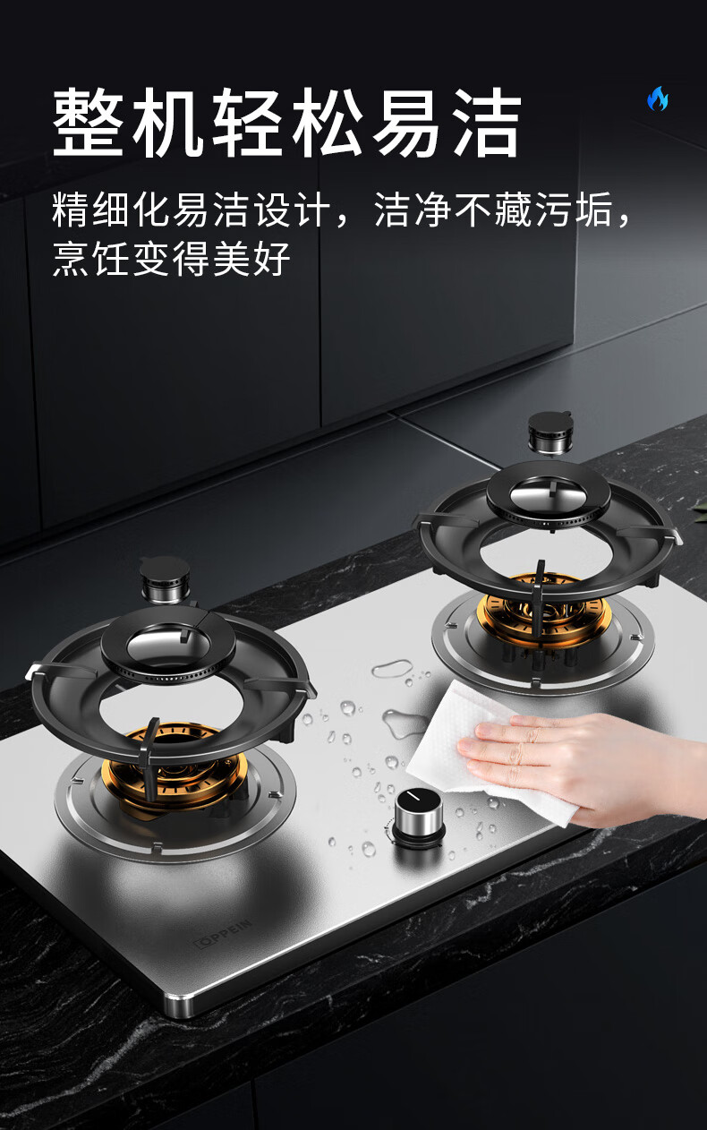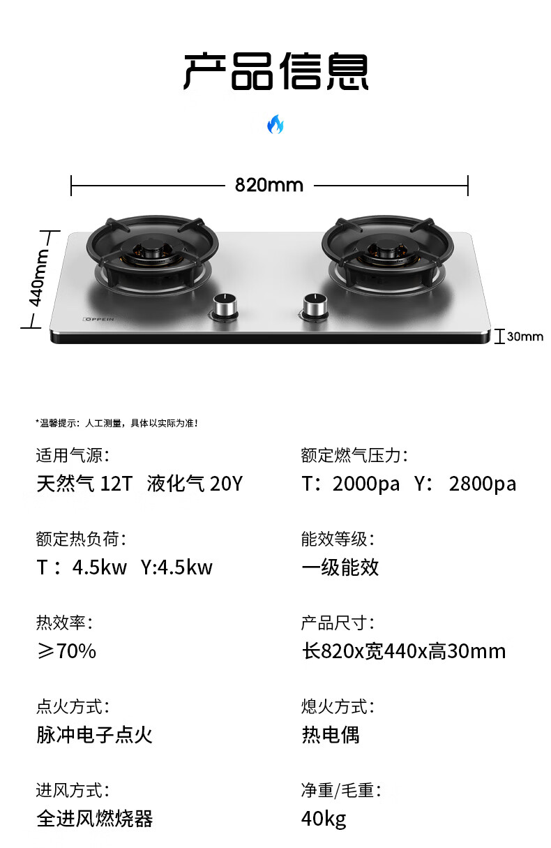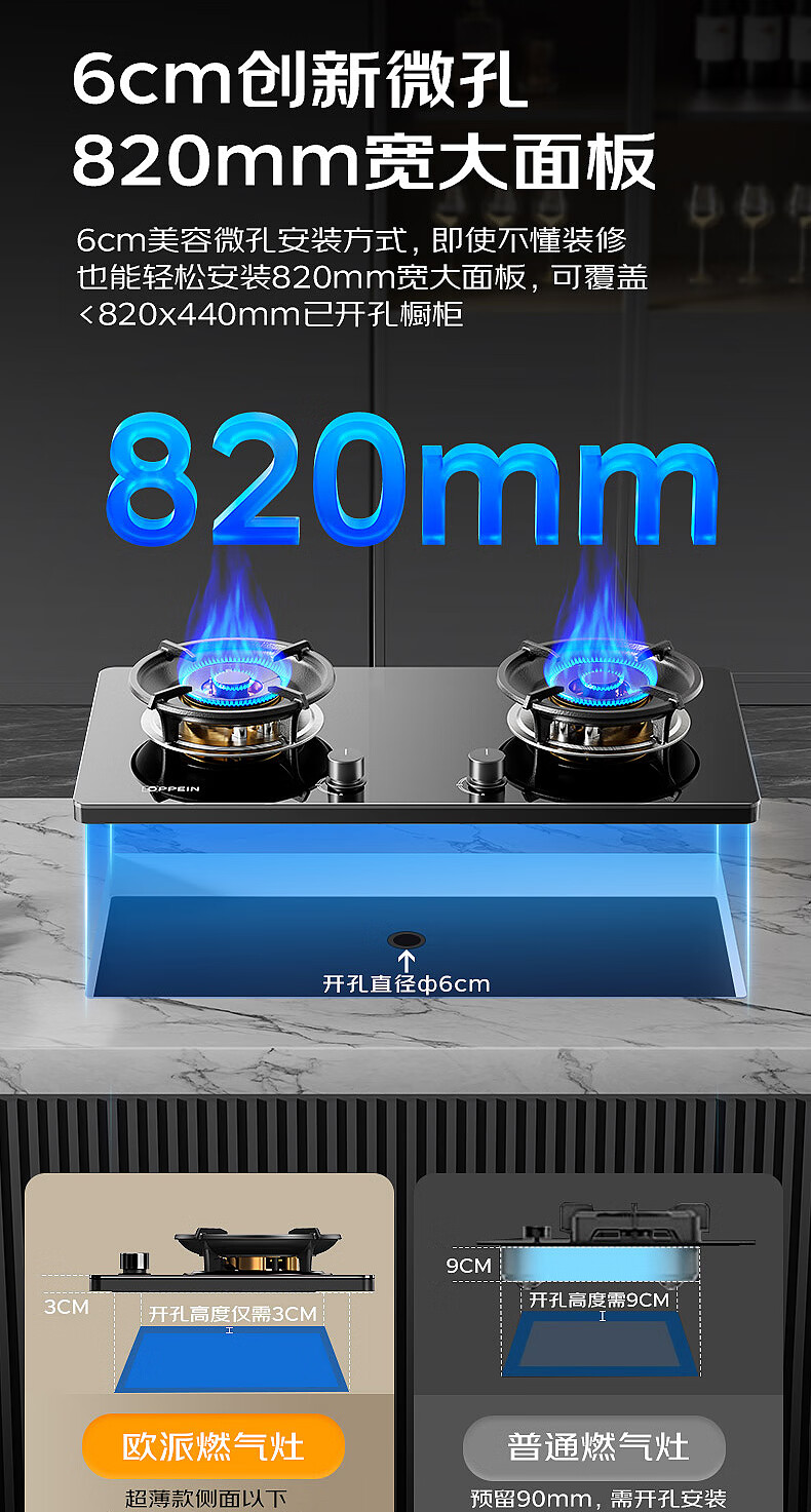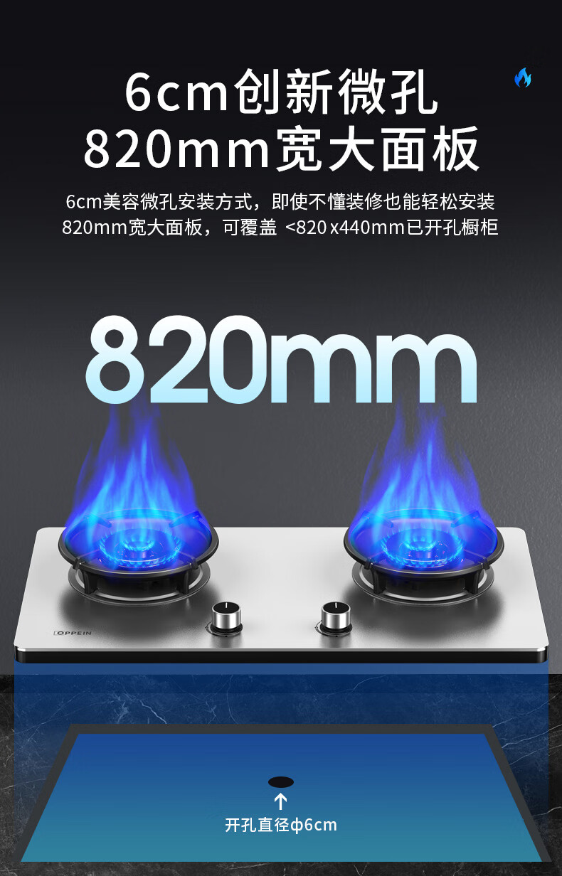 欧派(OPPEIN)家用燃气灶70%热效率钢化玻璃不锈钢猛火灶20大面板超薄一体式微孔安装免扩孔 一级能效 黑晶玻璃【70%热效率】820面板超薄一体式 液化气20Y