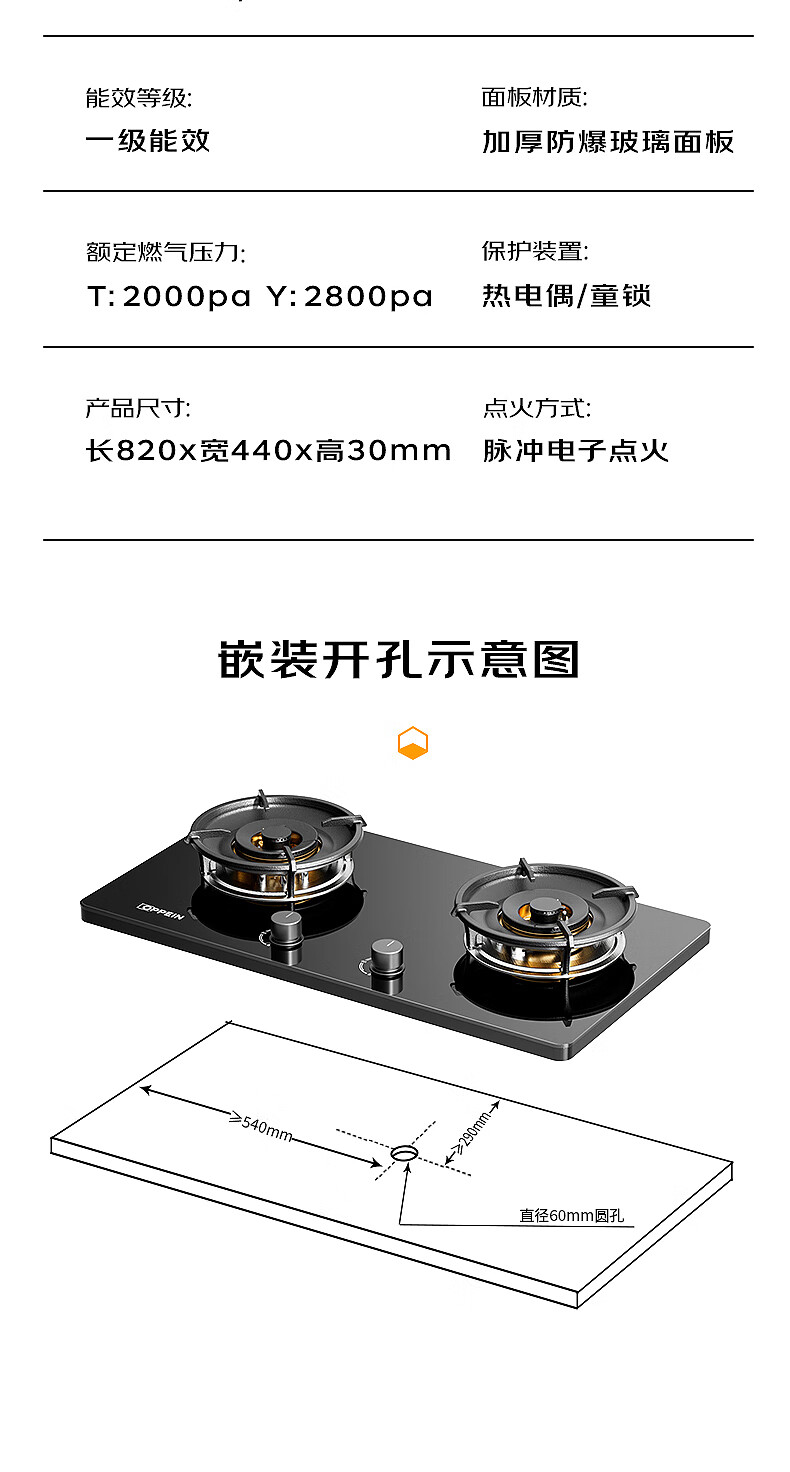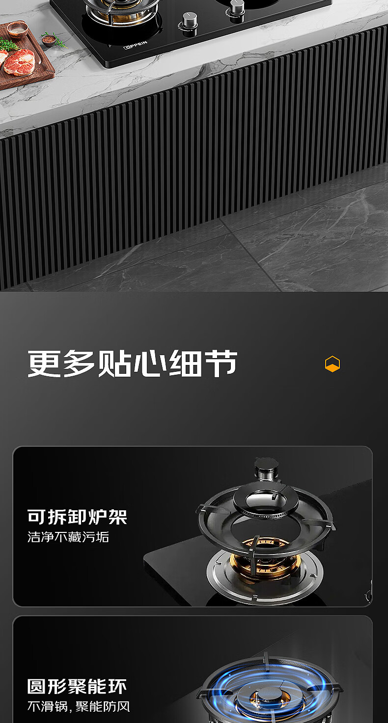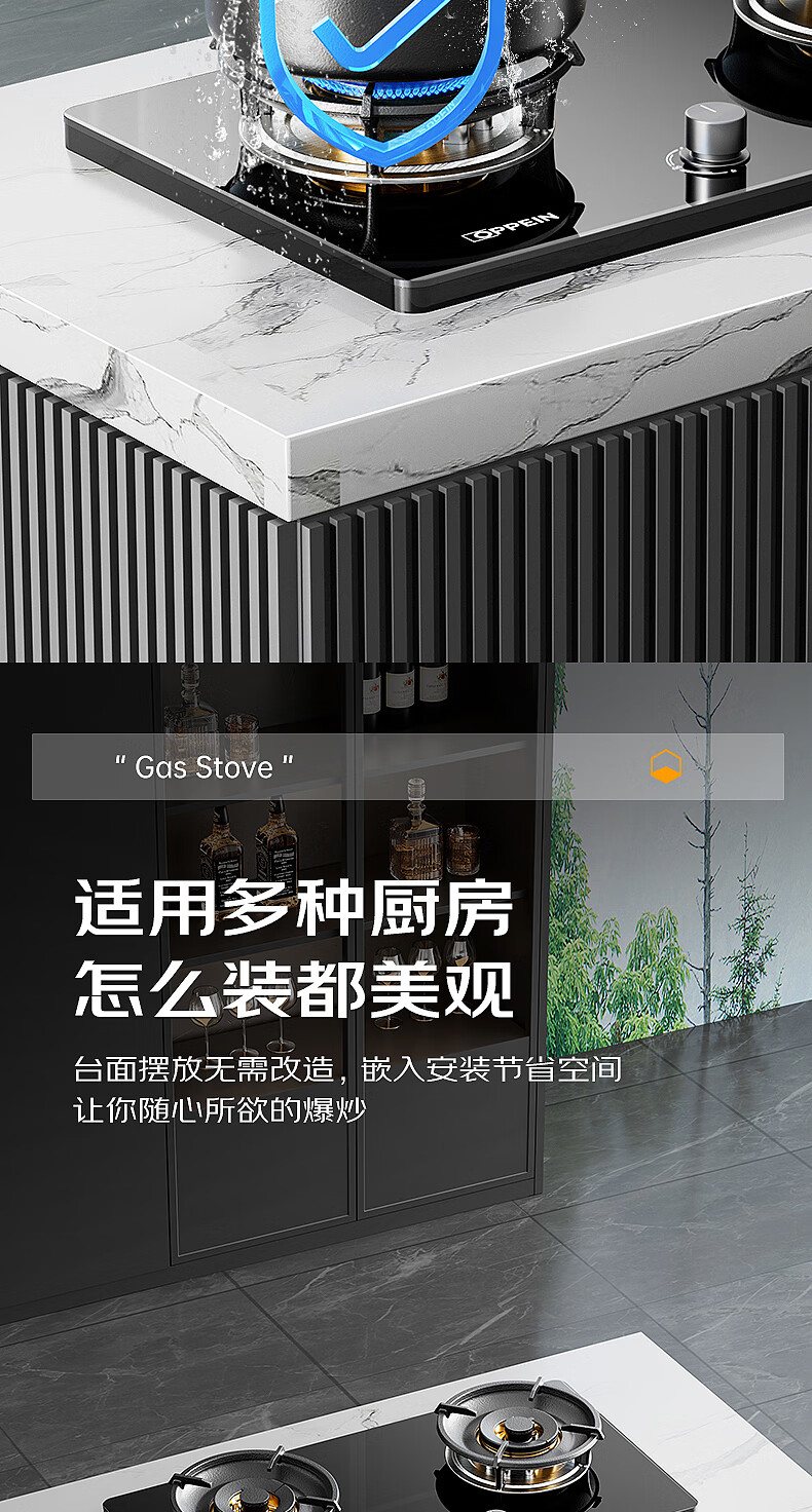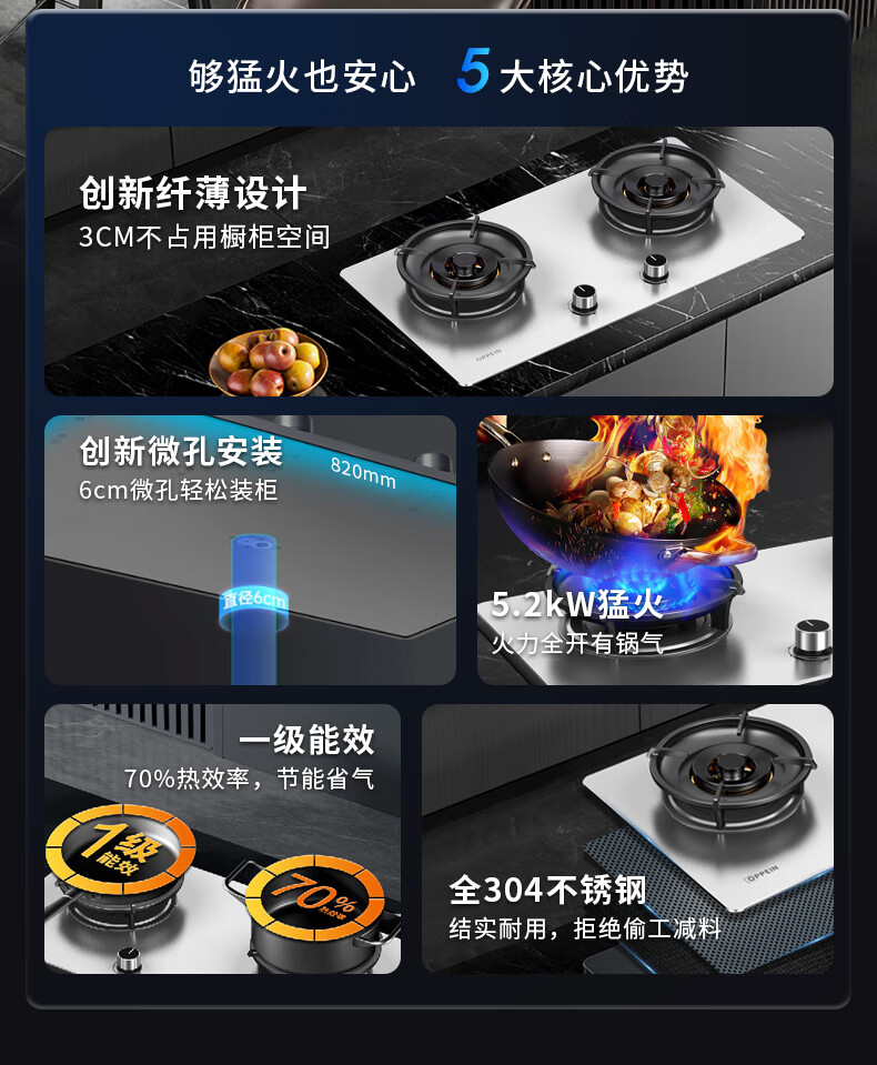 欧派(OPPEIN)家用燃气灶70%热效率钢化玻璃不锈钢猛火灶20大面板超薄一体式微孔安装免扩孔 一级能效 黑晶玻璃【70%热效率】820面板超薄一体式 液化气20Y