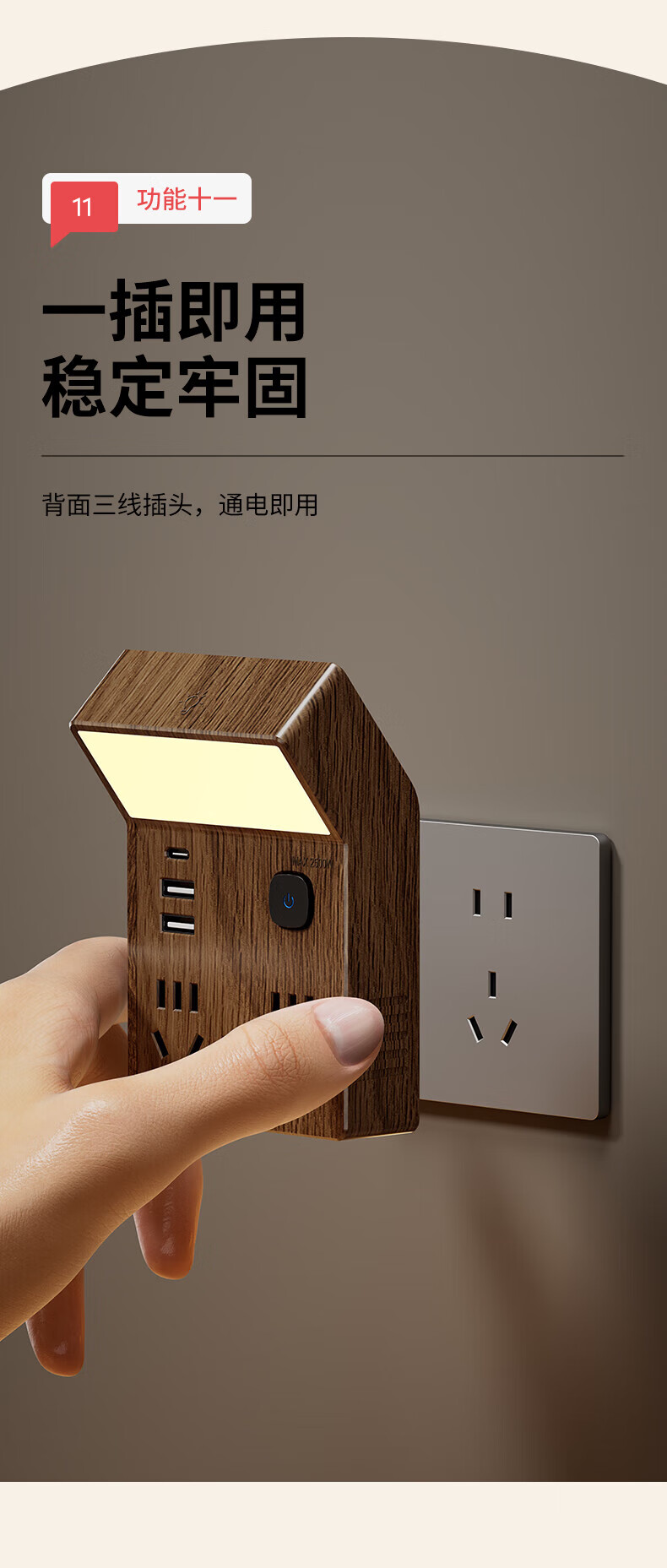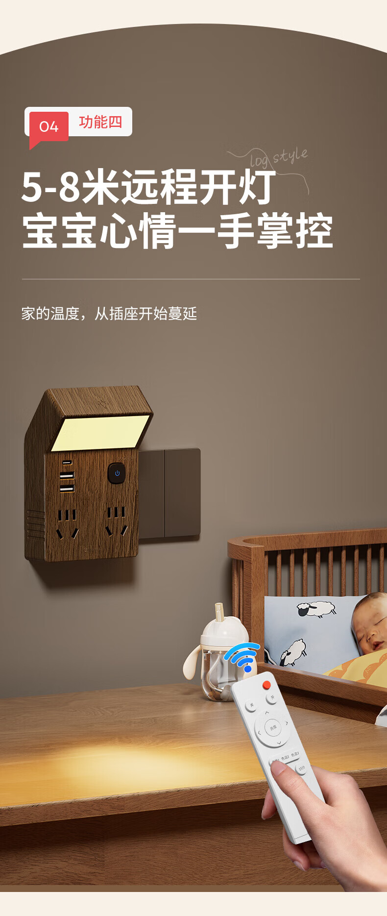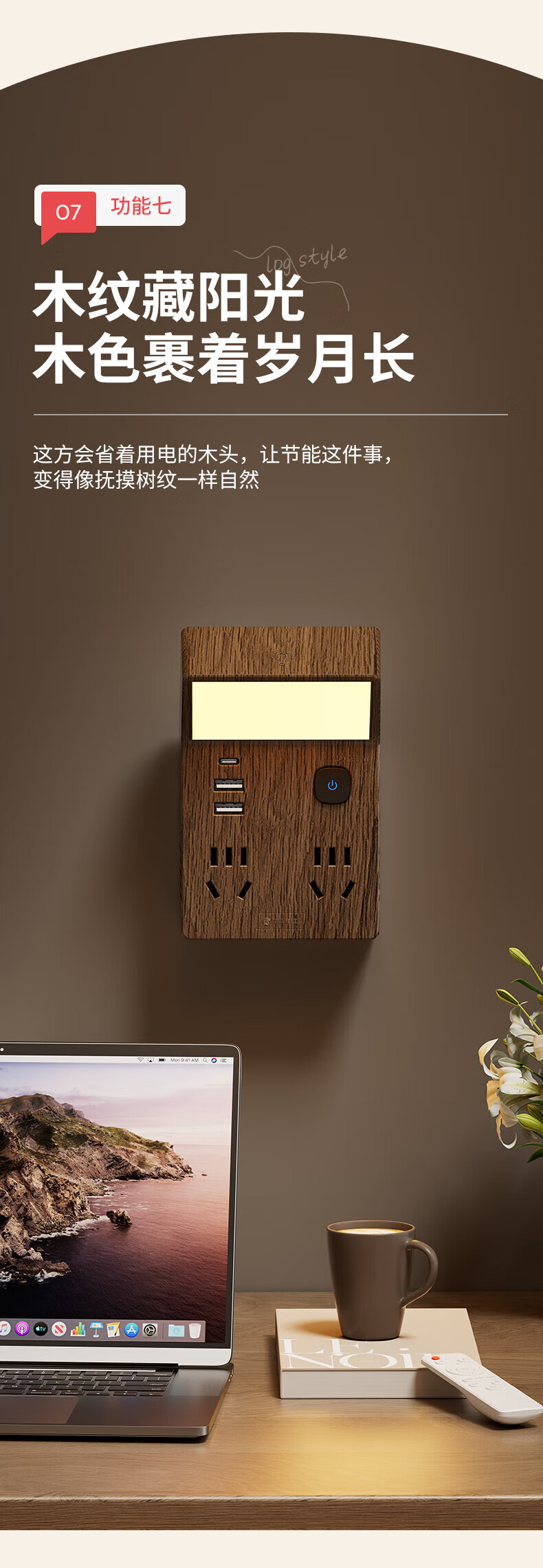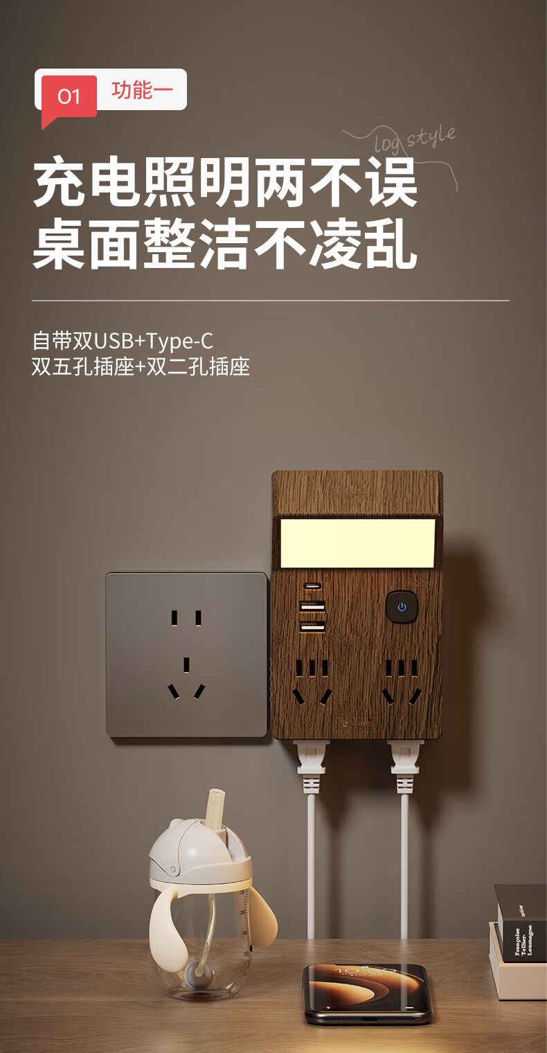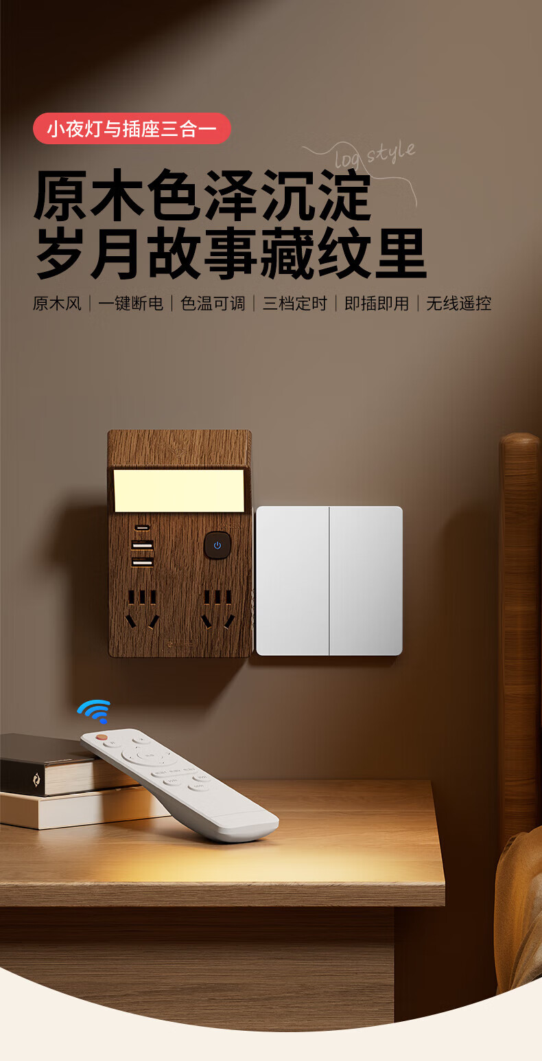 国际电工遥控照明灯床头书桌复古86型一转四多功能扩展插座直插式转换插头 【木纹】一转四带灯扩展插座
