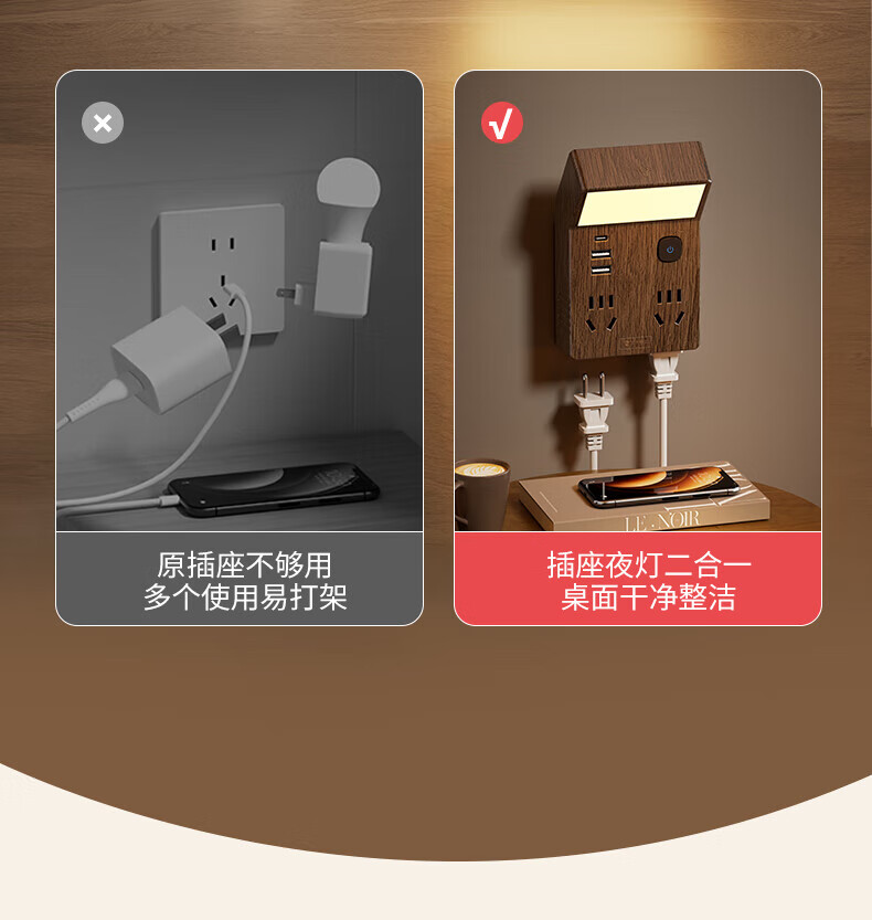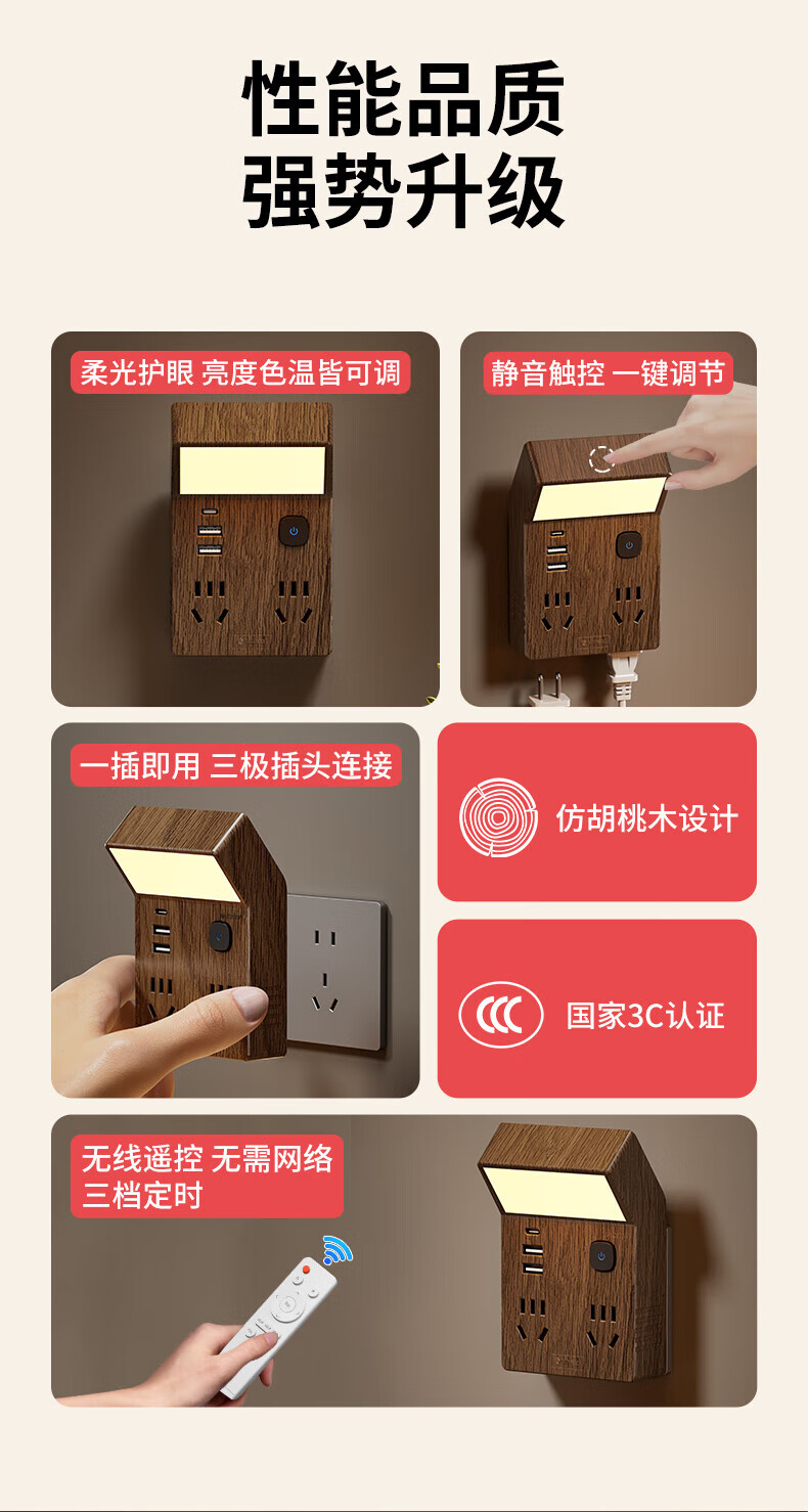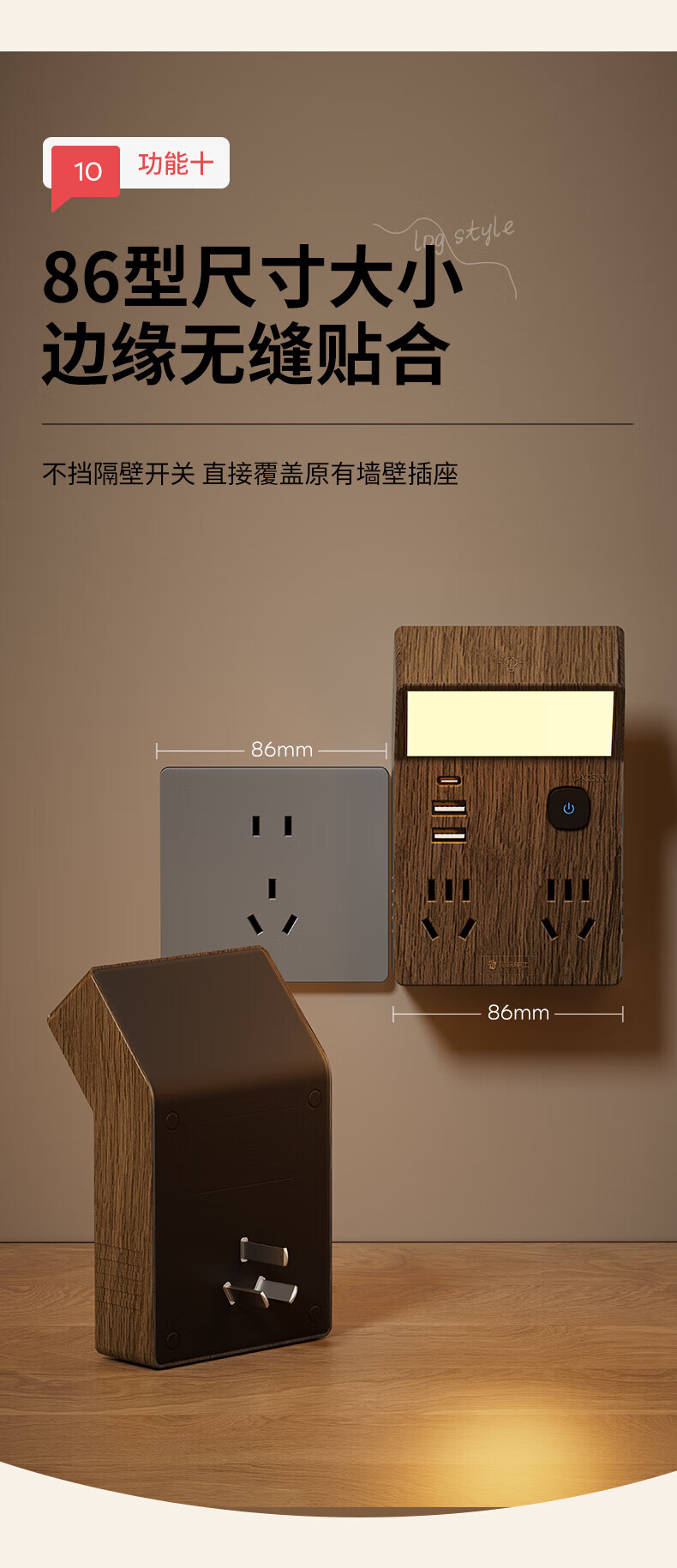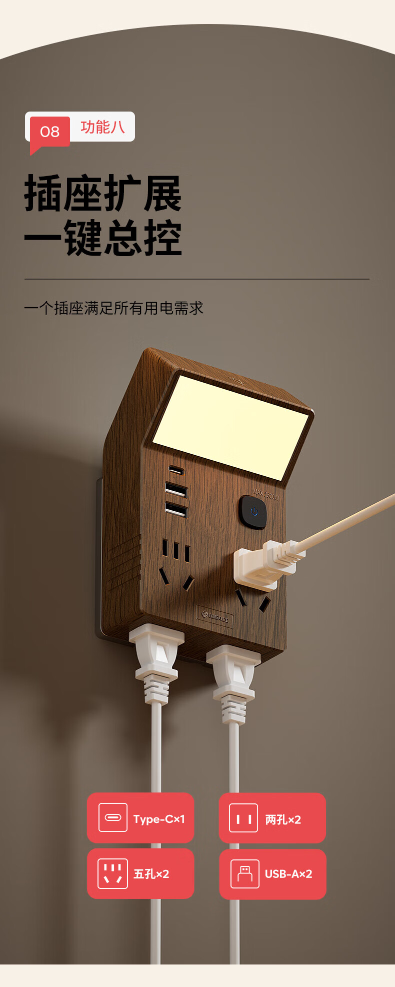 国际电工遥控照明灯床头书桌复古86型一转四多功能扩展插座直插式转换插头 【木纹】一转四带灯扩展插座