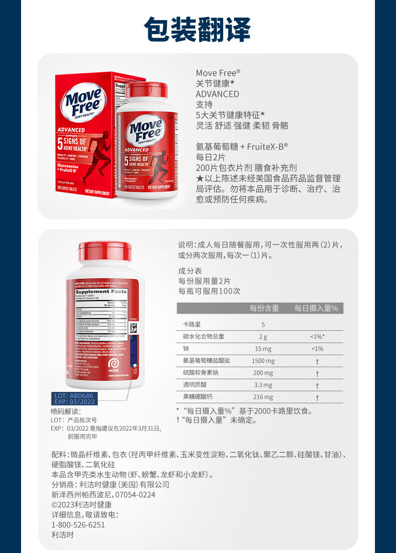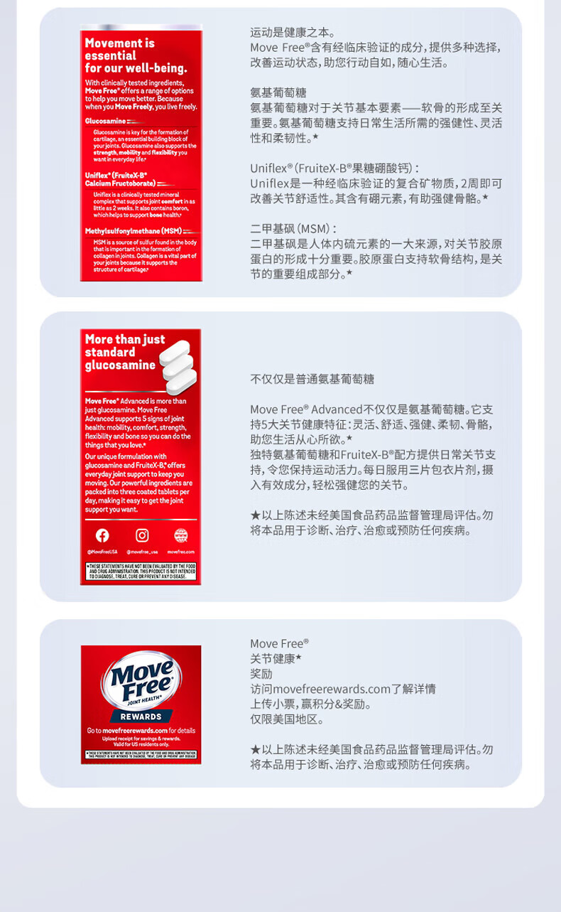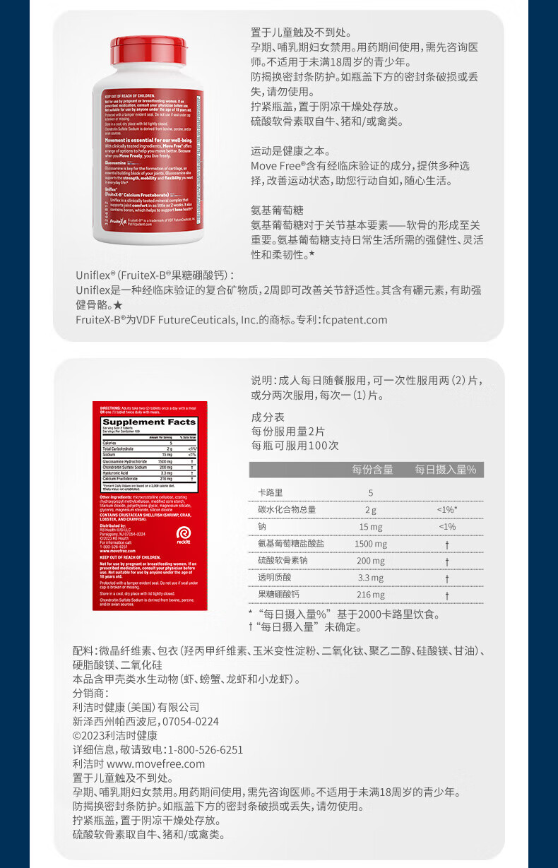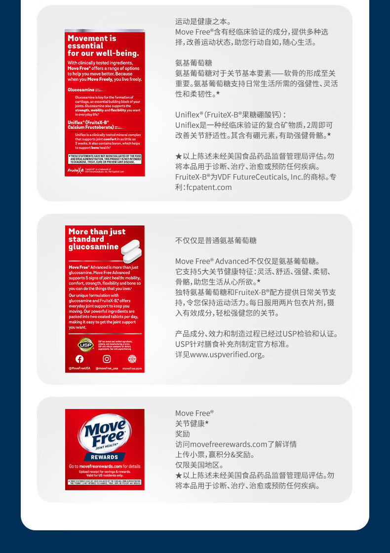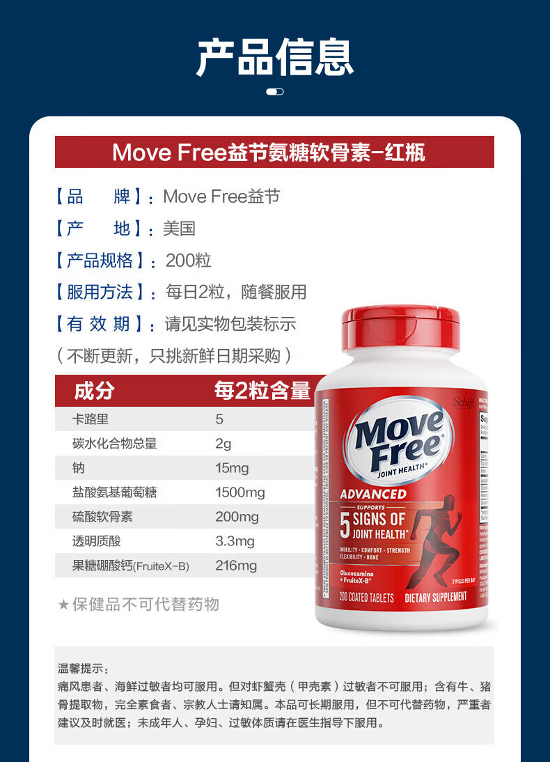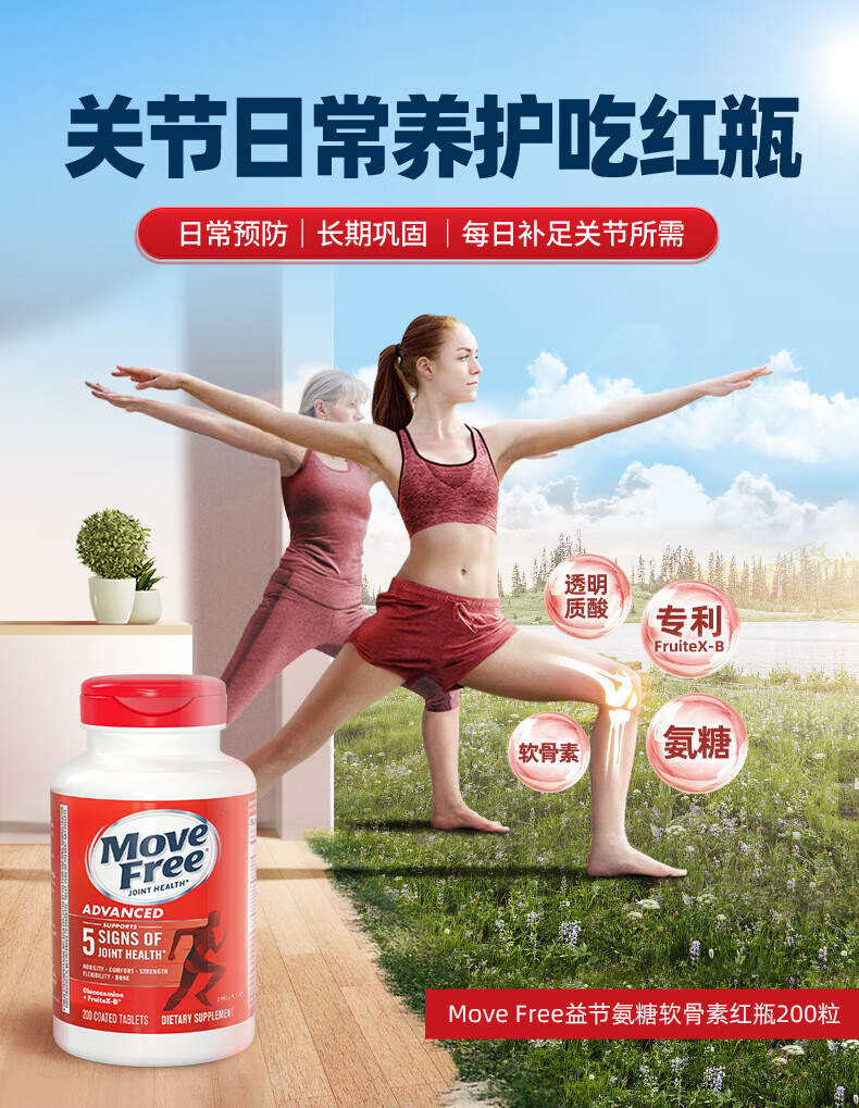 Move Free益节红瓶氨糖软骨素200粒 美国原装进口维骨力 成人中老年 护关节 【足量氨糖】养护红瓶200粒大瓶装