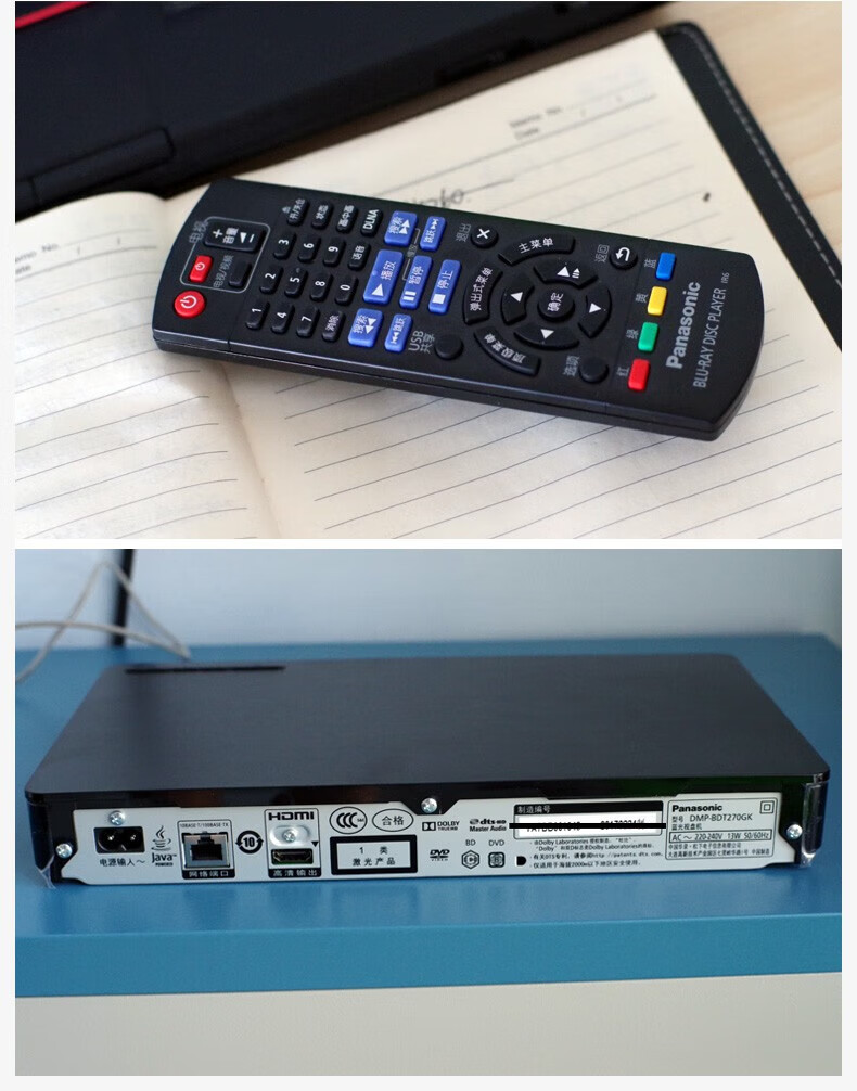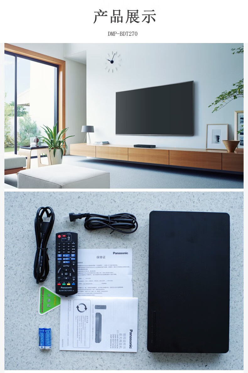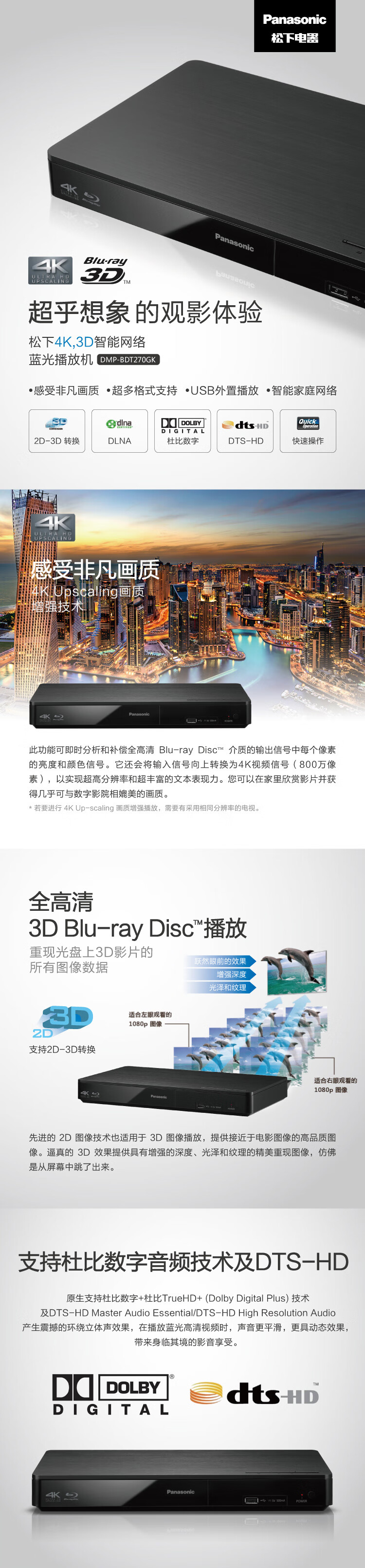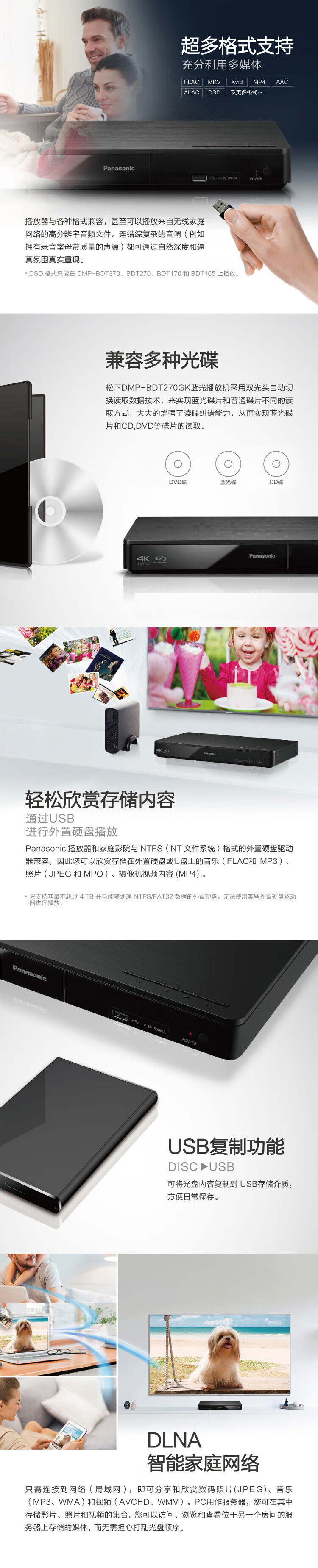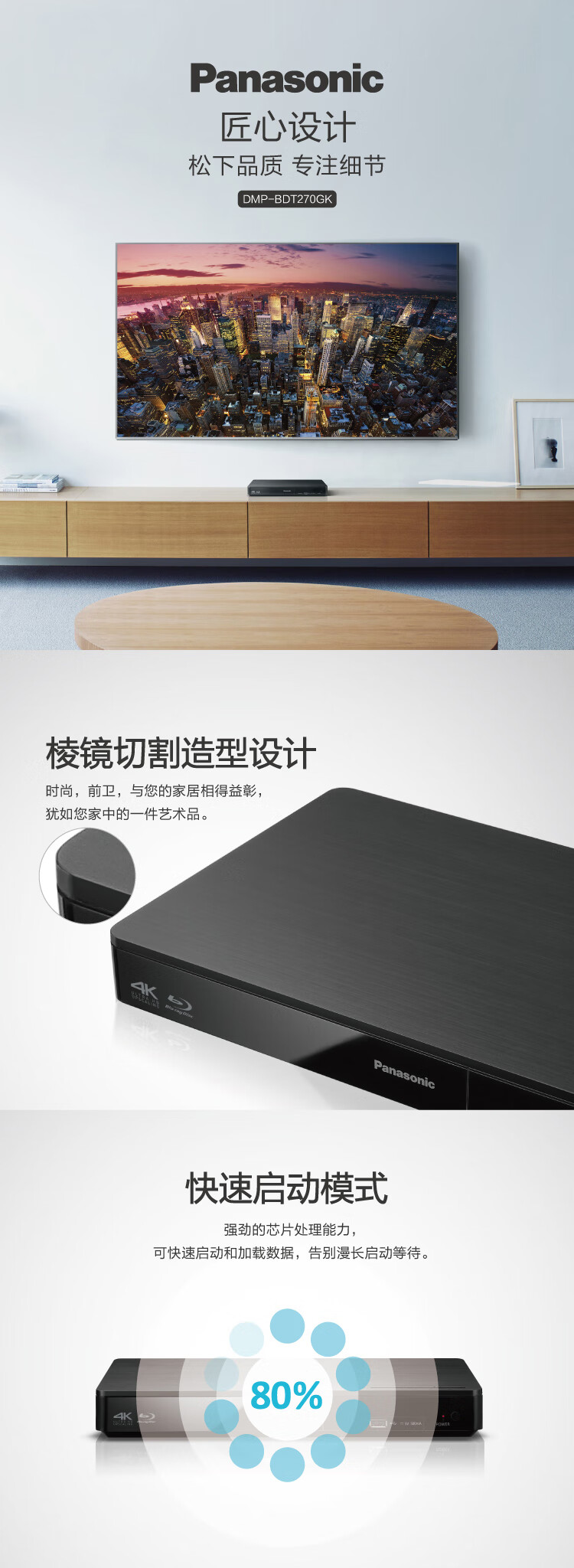 松下(Panasonic)BDT270 3D高清蓝光DVD播放机 支持USB播放 支持网络视频 播放机4k倍线技术 智能家庭网络 CD播放器 DMP-BDT270GK黑色