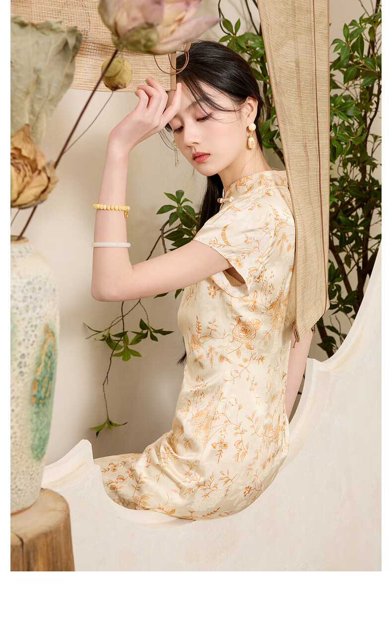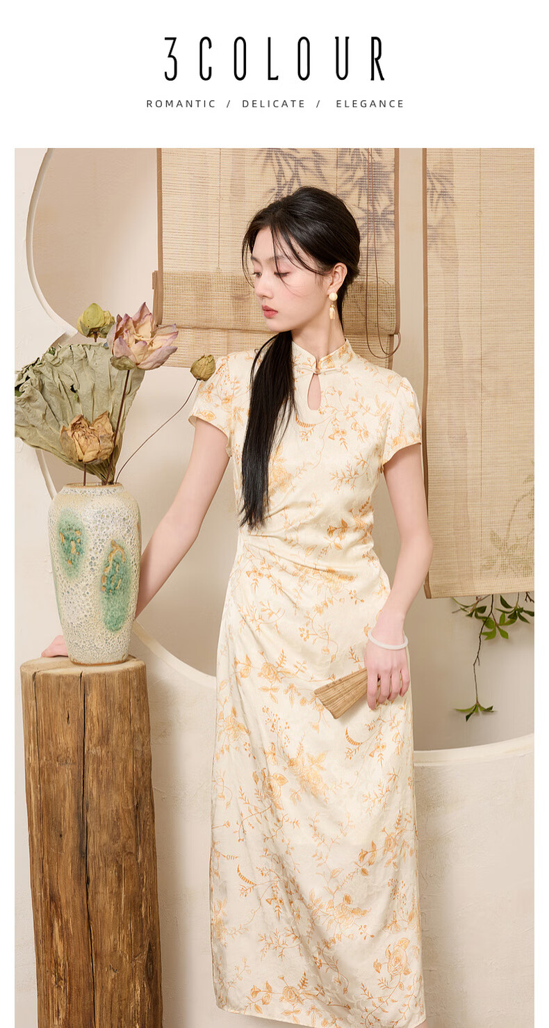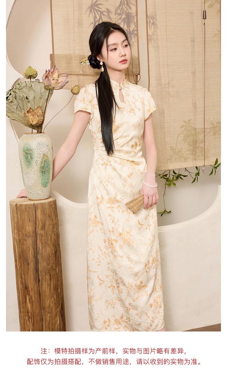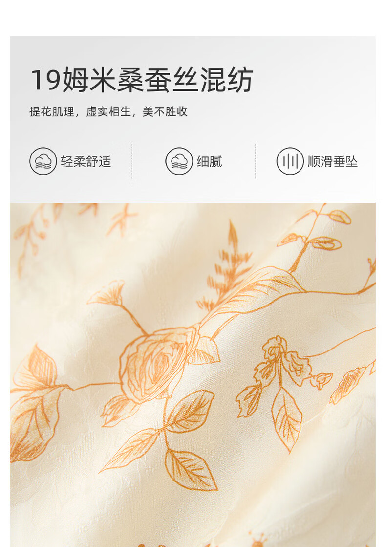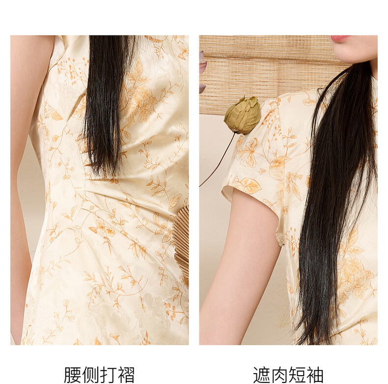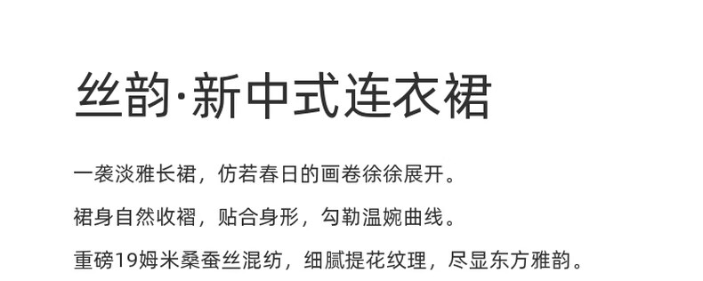 三彩2025春季新款桑蚕丝连衣裙提花旗袍领收腰A字裙长裙M