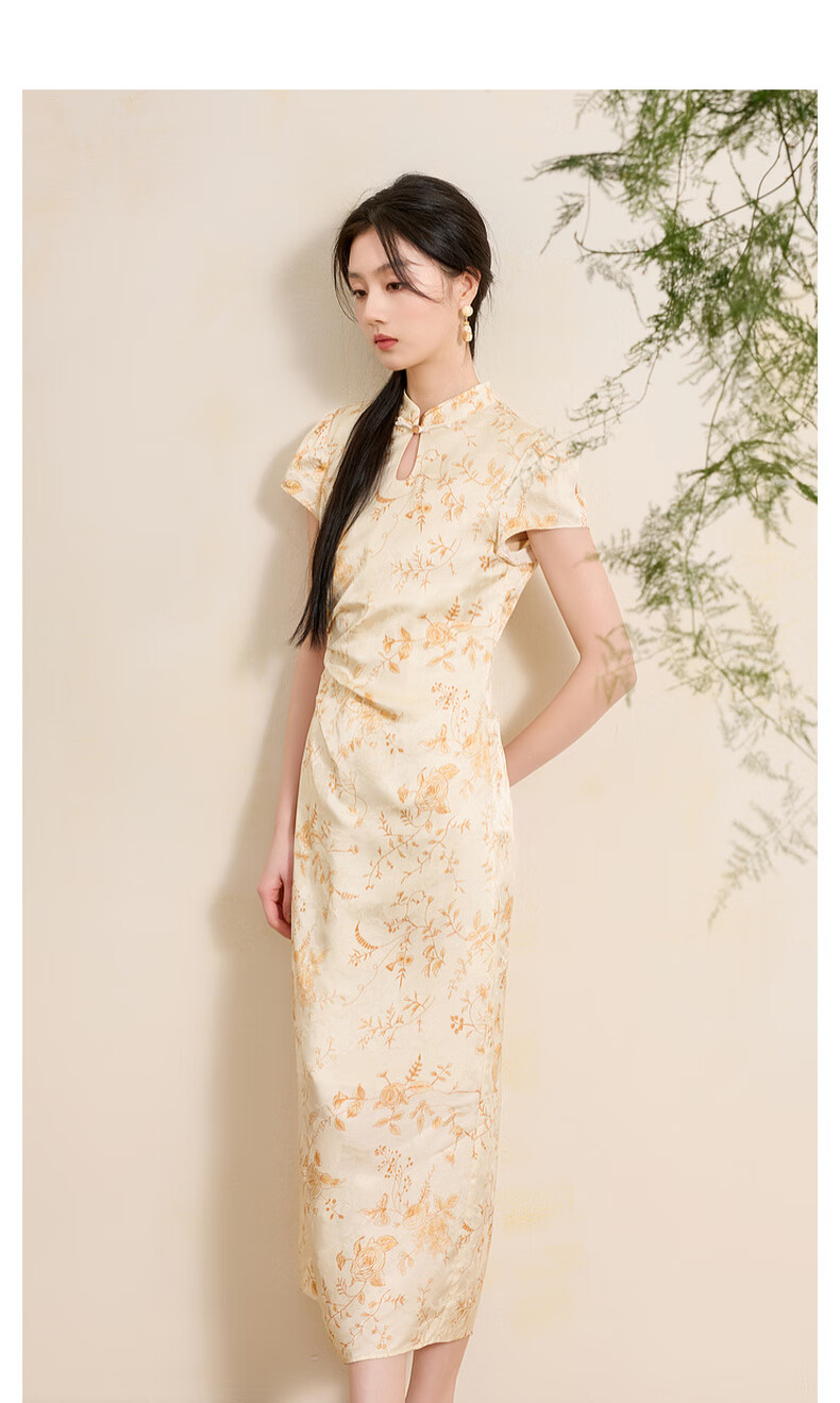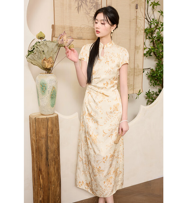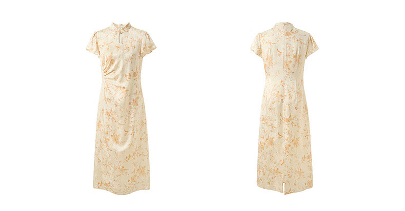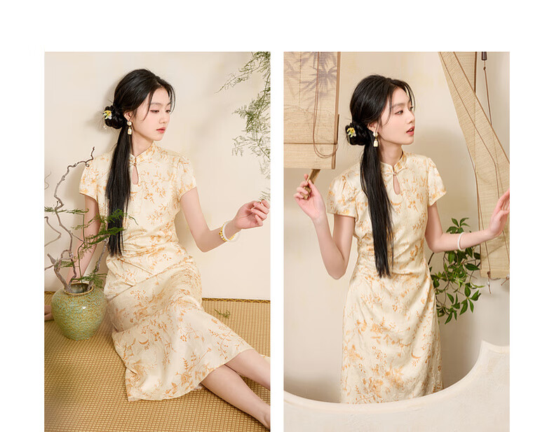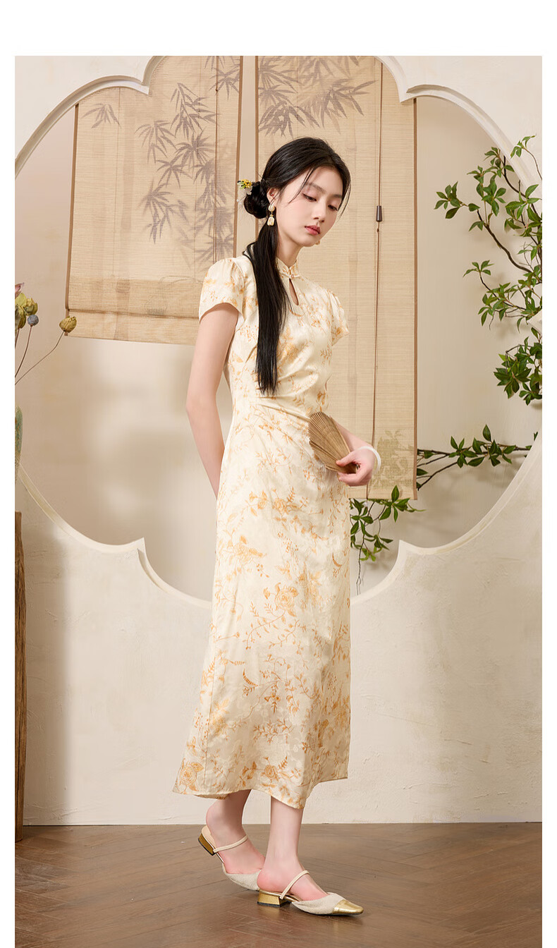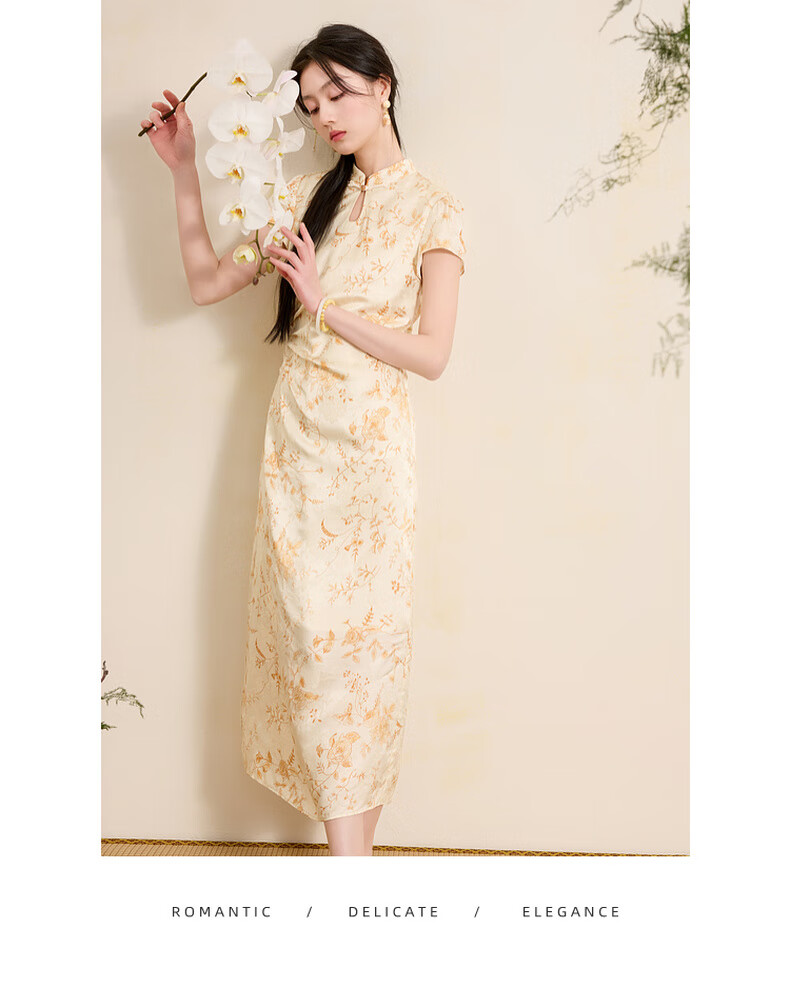 三彩2025春季新款桑蚕丝连衣裙提花旗袍领收腰A字裙长裙M