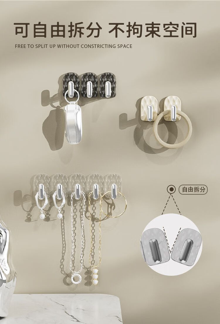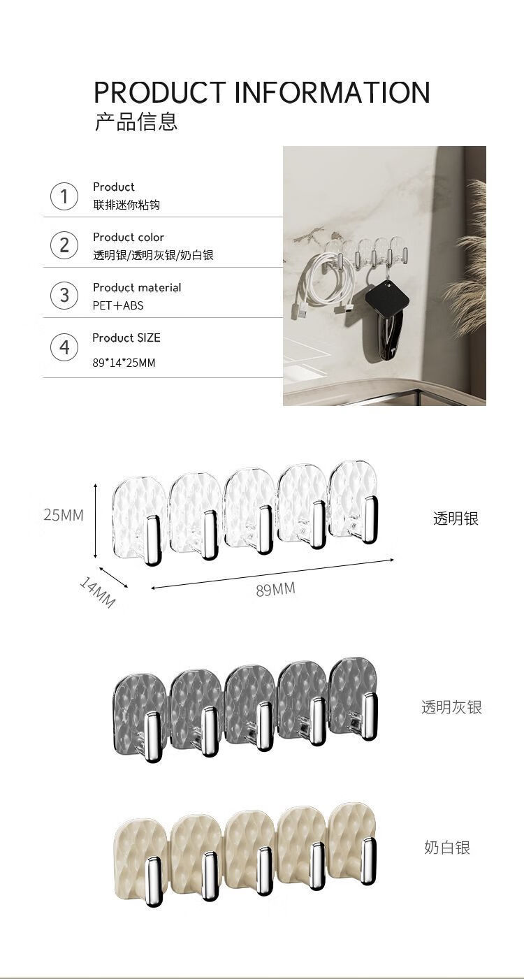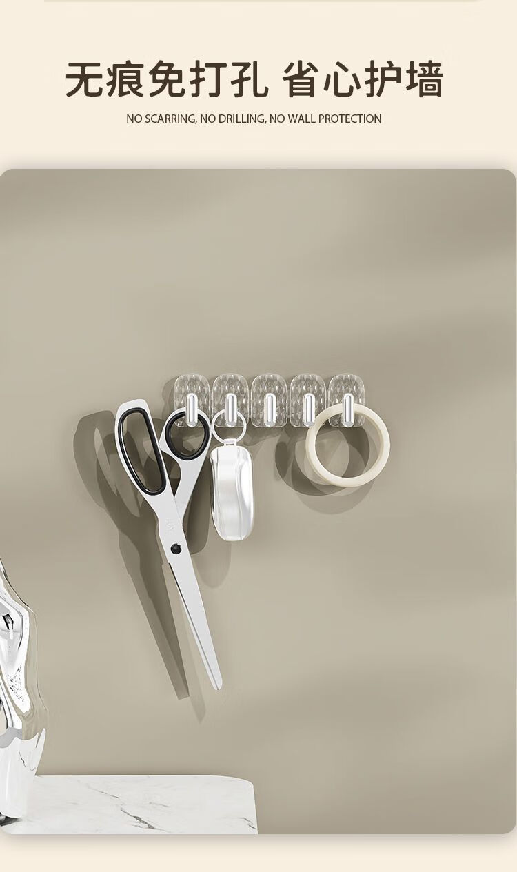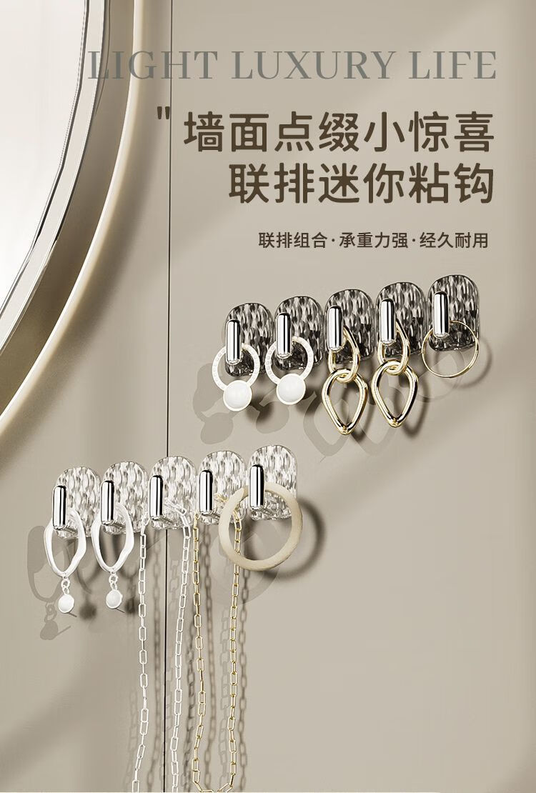 优品卫迷你无痕连排挂多功能粘胶卫生间镜柜门后首饰粘贴壁挂小钩免打孔 连排强承重 透明银二排共十钩