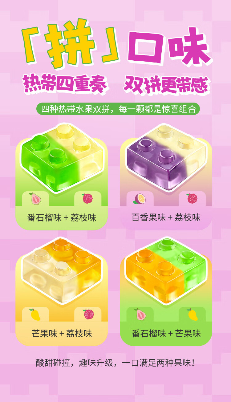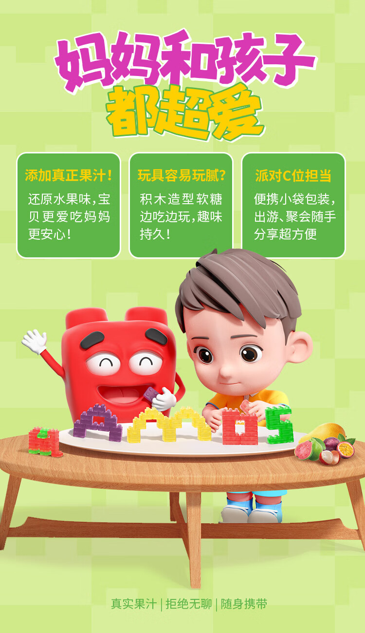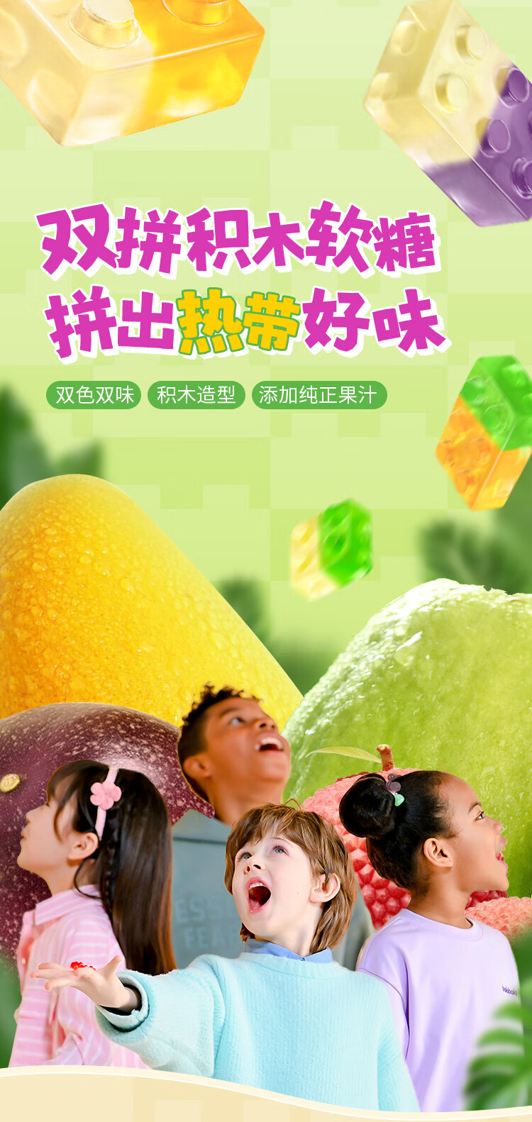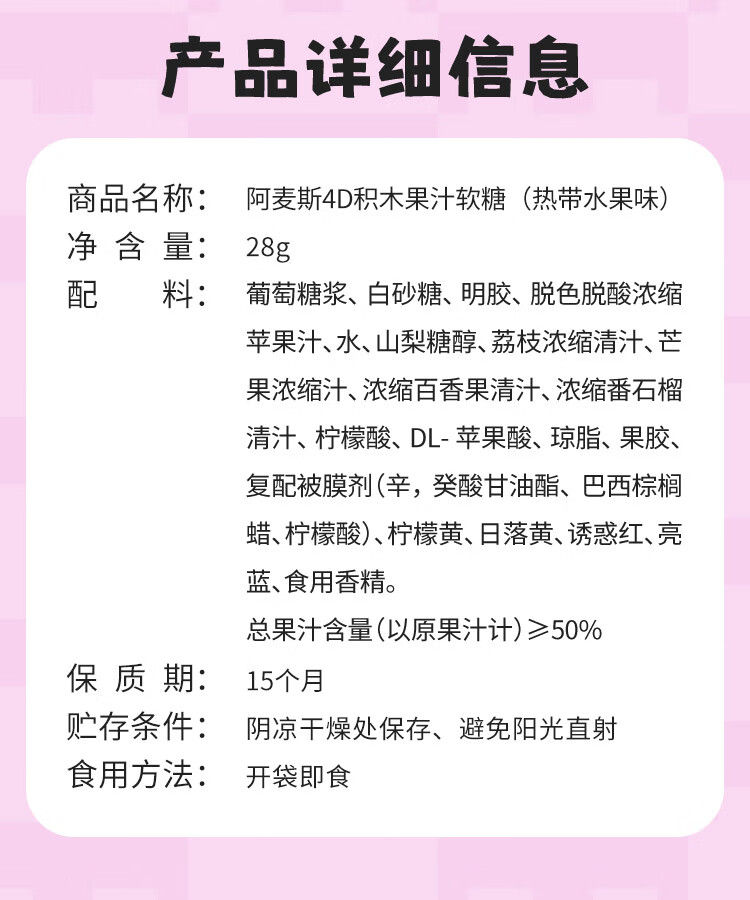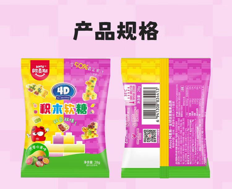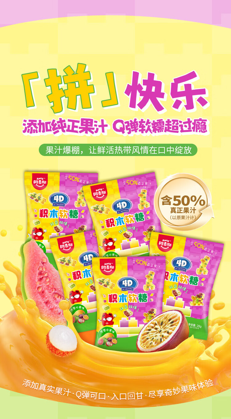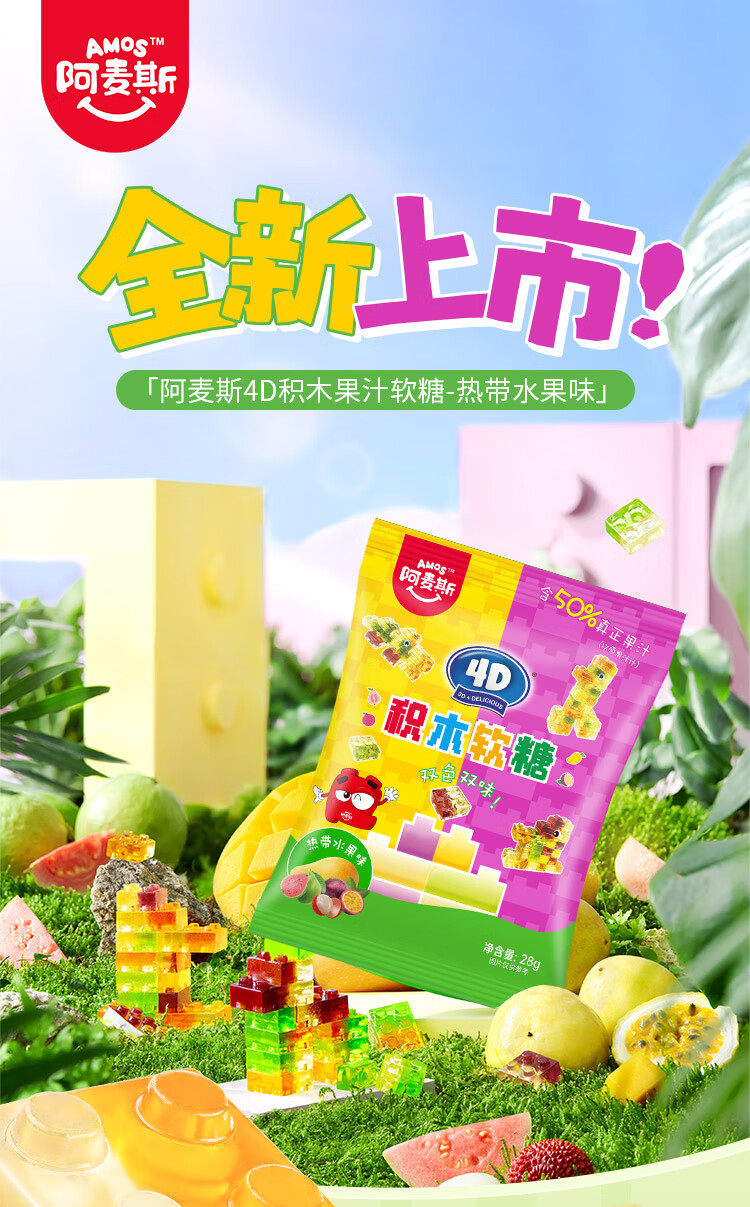 阿麦斯(amos)4D积木果汁软糖 50%果汁橡皮糖水果味爆汁夹心 休闲零食儿童便携 【4D积木】热带水果味 28g*5