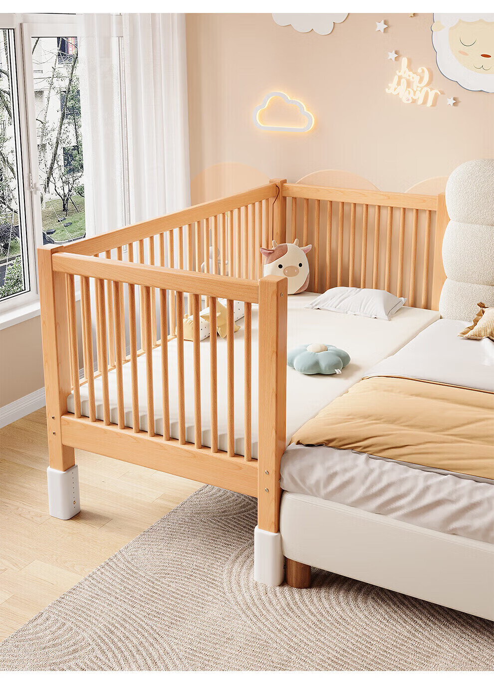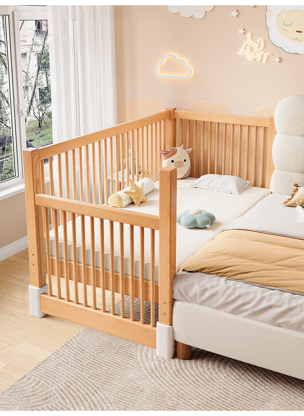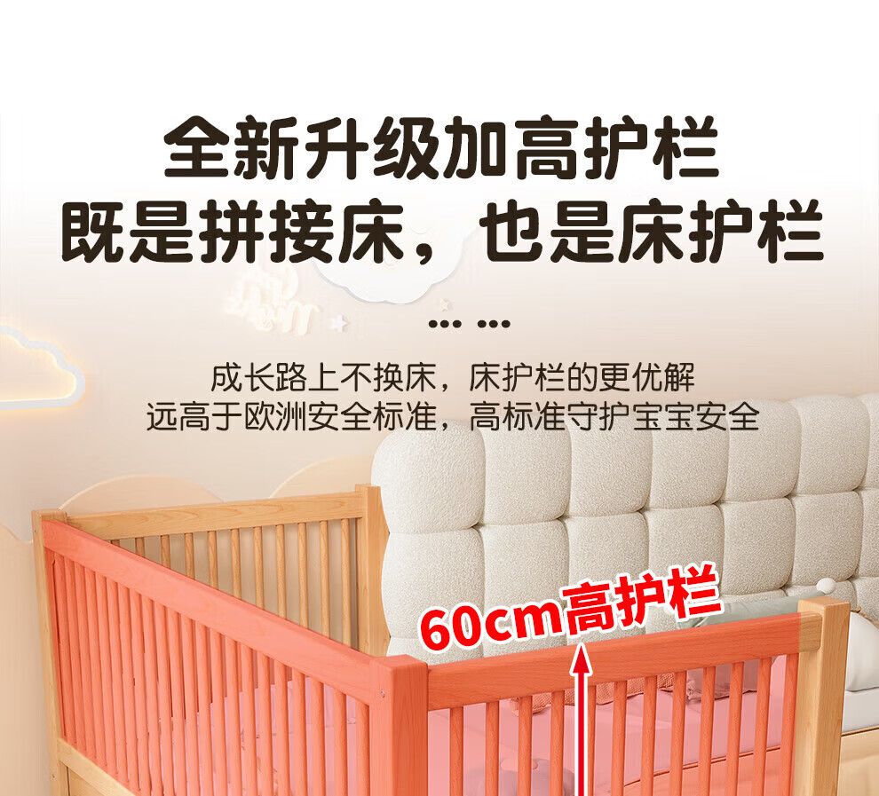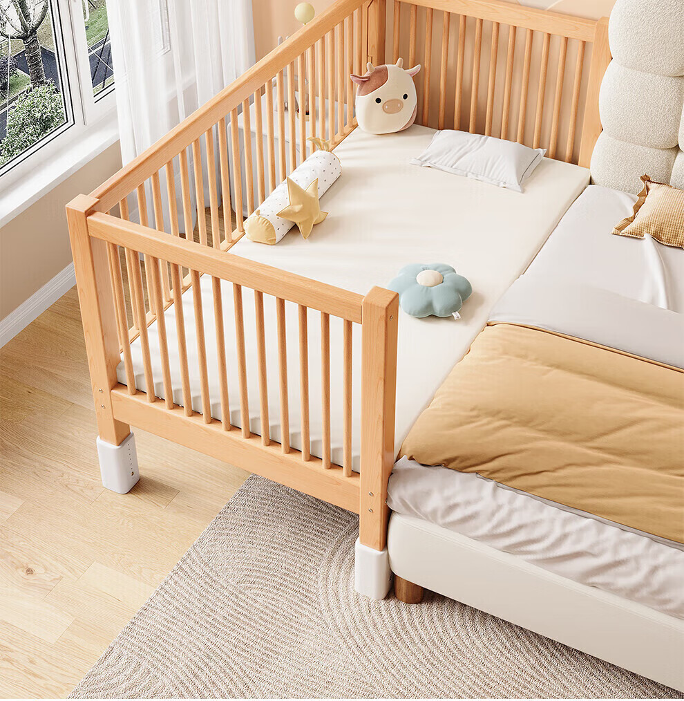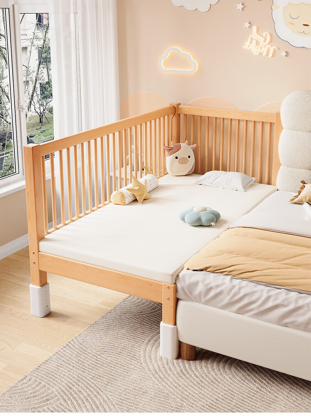秋莹可升降榉木拼接床实木儿童床婴儿床加宽拼接大床小孩床边床拼接床 三护栏+5cm椰棕床垫(高度可调节) 可升降长200宽60高35【60护栏】