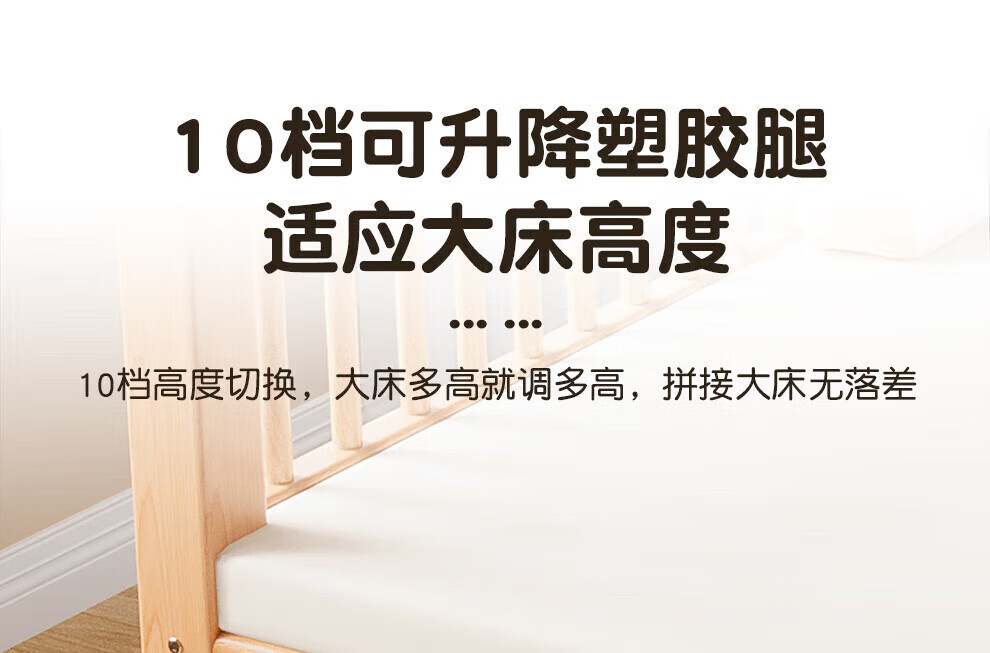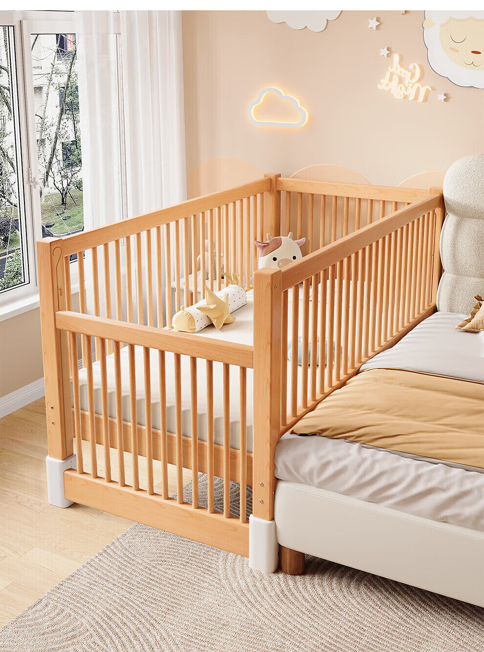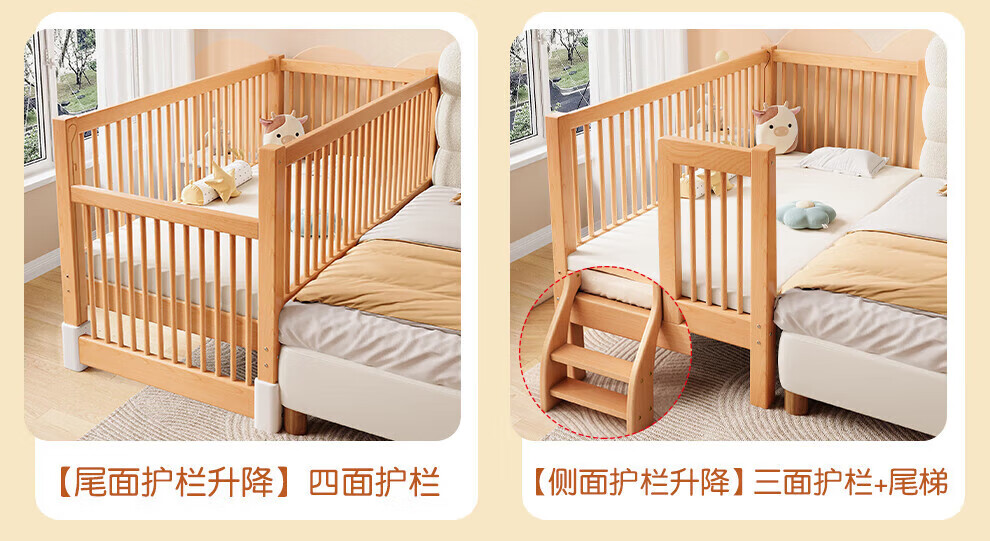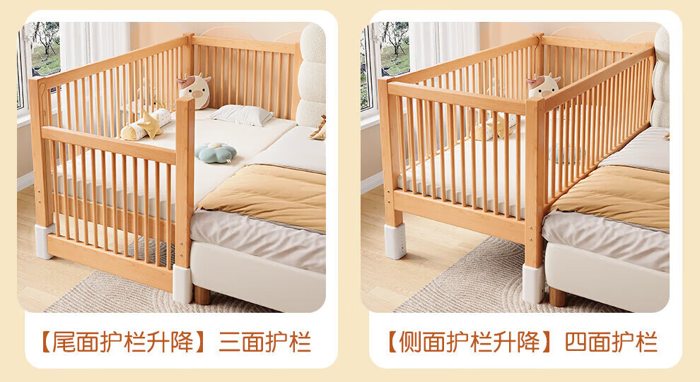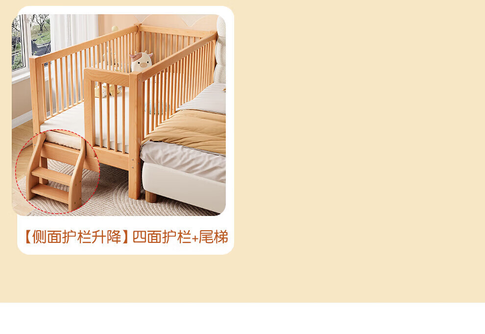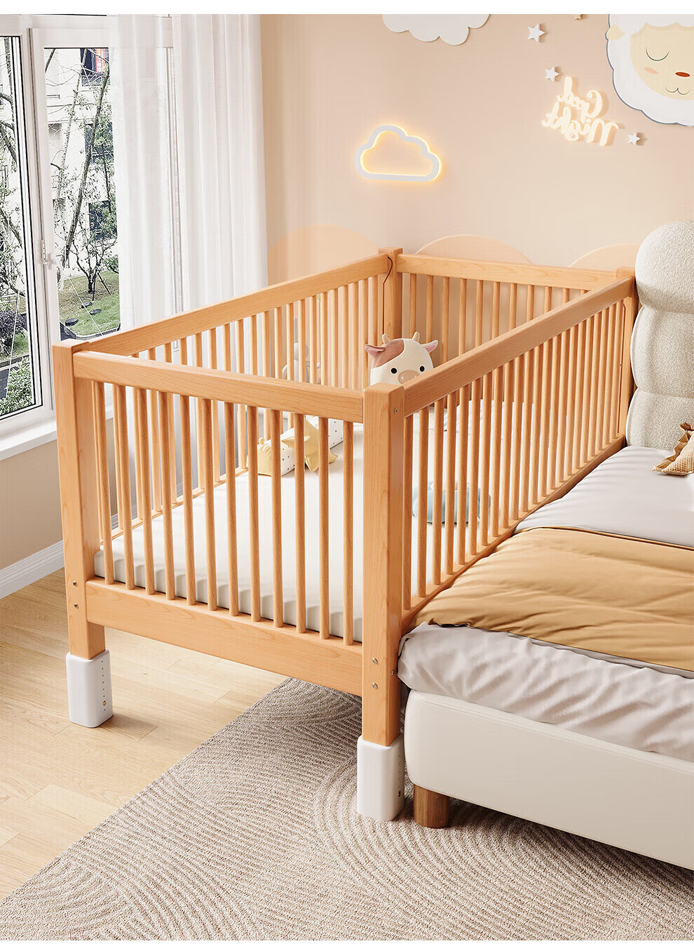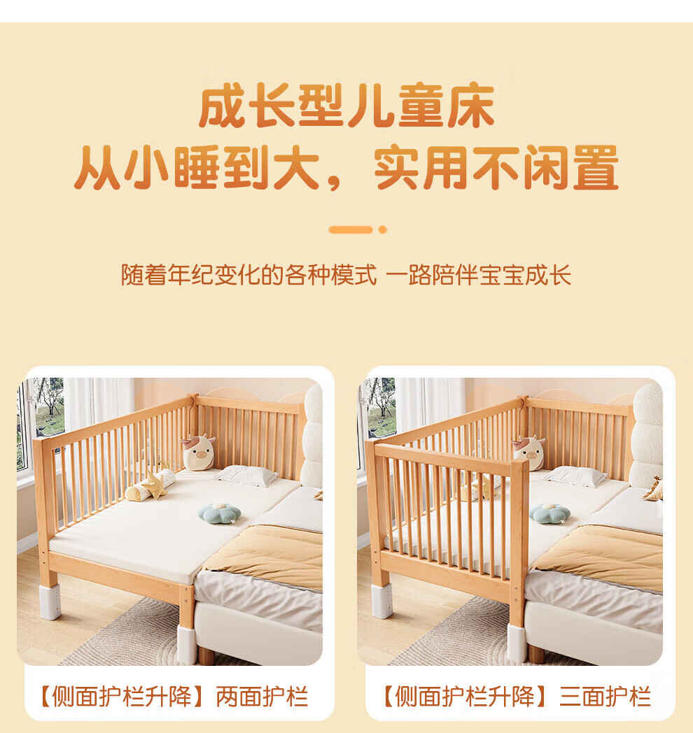 秋莹可升降榉木拼接床实木儿童床婴儿床加宽拼接大床小孩床边床拼接床 三护栏+5cm椰棕床垫(高度可调节) 可升降长200宽60高35【60护栏】
