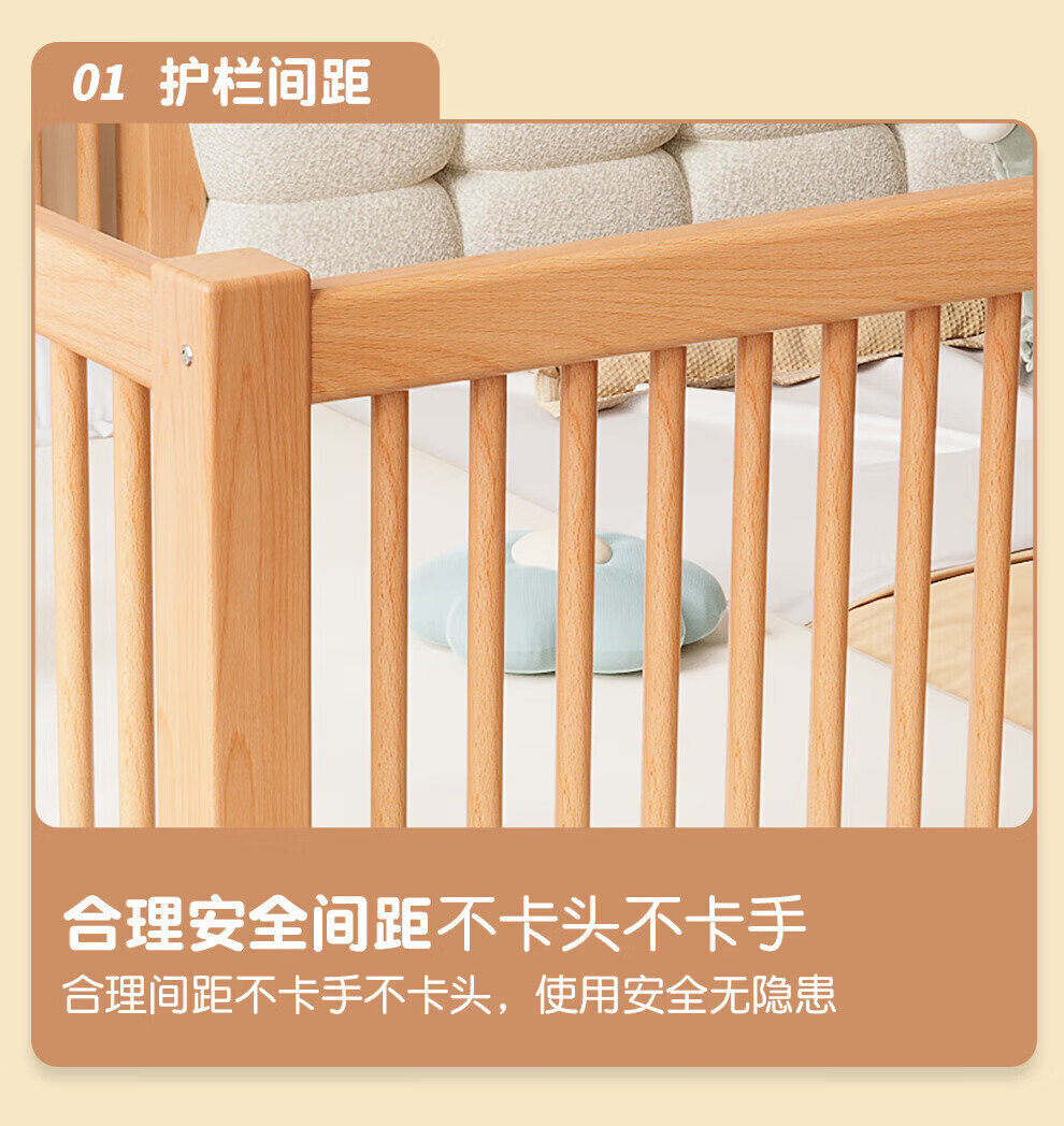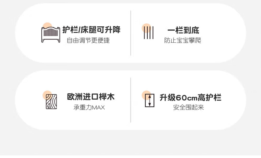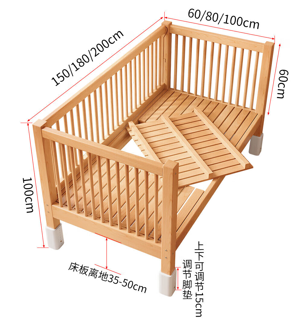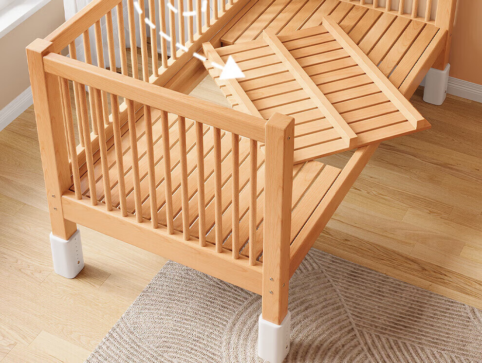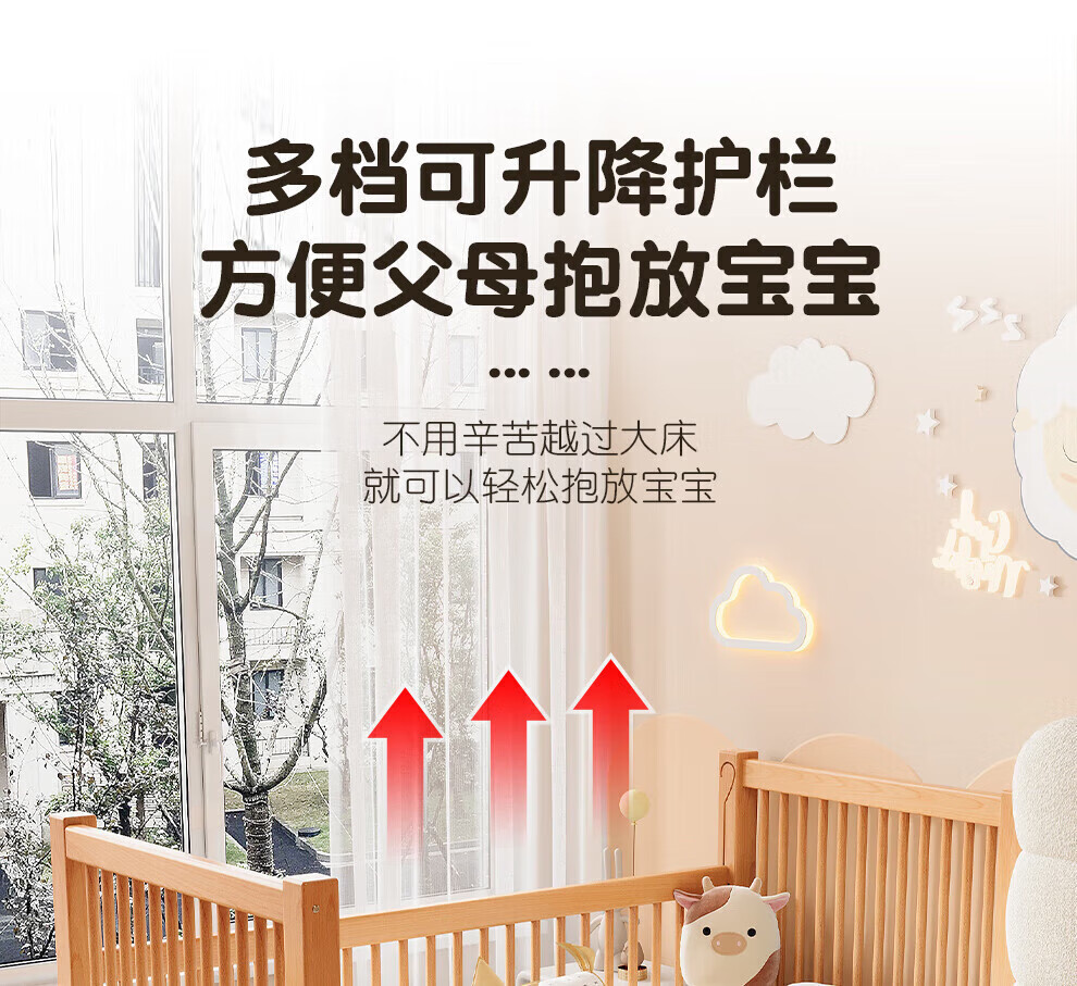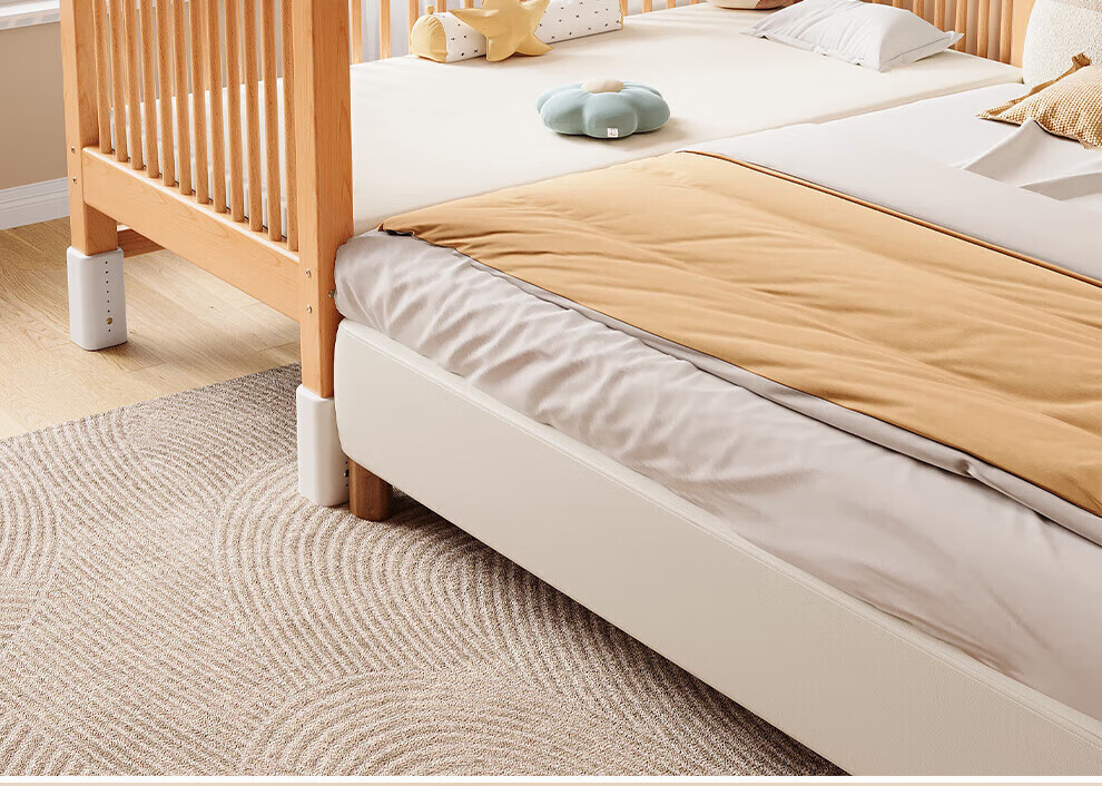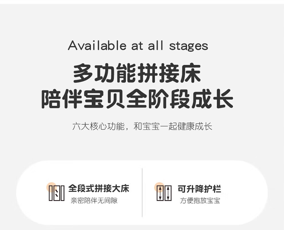 秋莹可升降榉木拼接床实木儿童床婴儿床加宽拼接大床小孩床边床拼接床 三护栏+5cm椰棕床垫(高度可调节) 可升降长200宽60高35【60护栏】