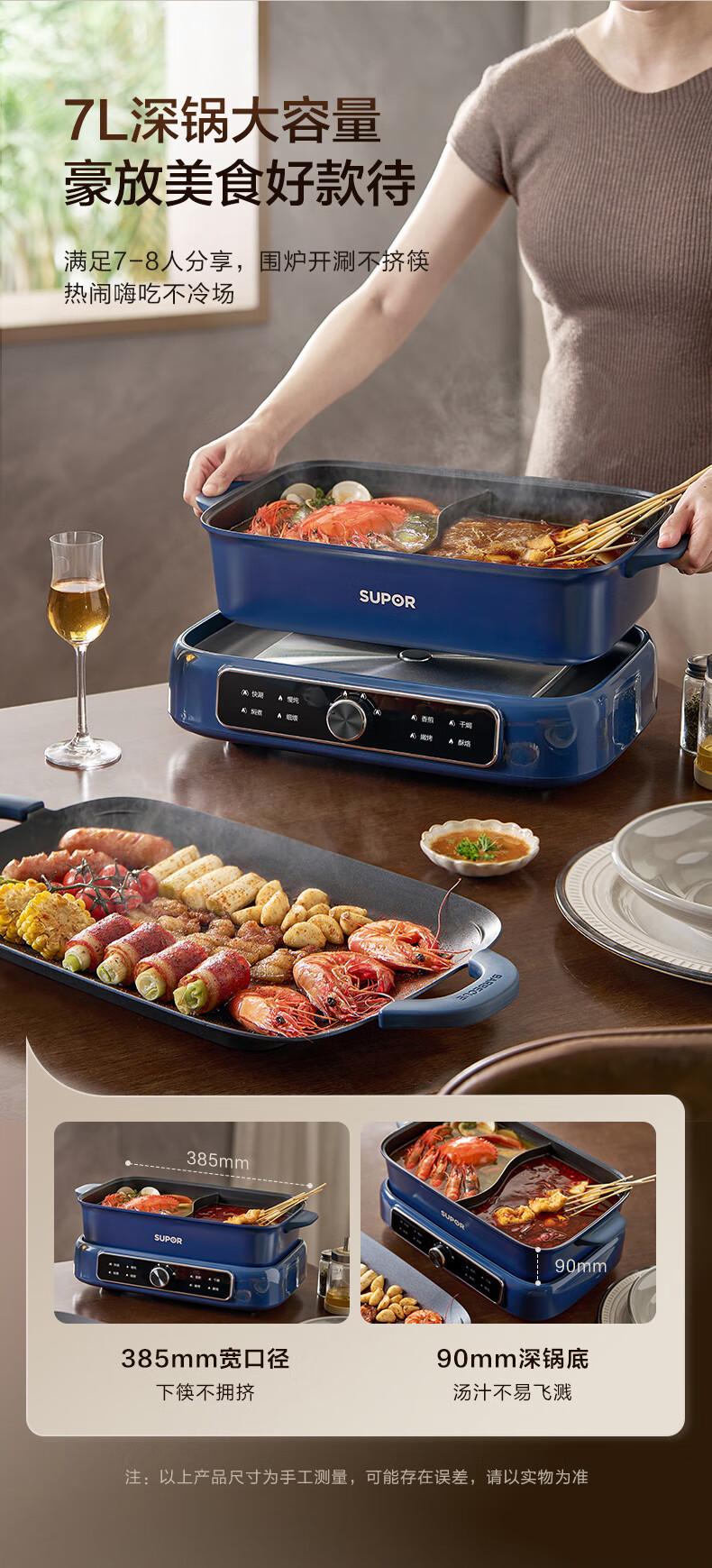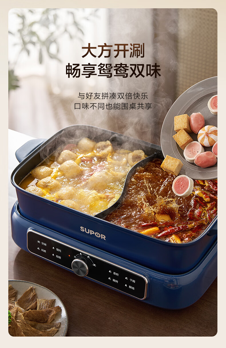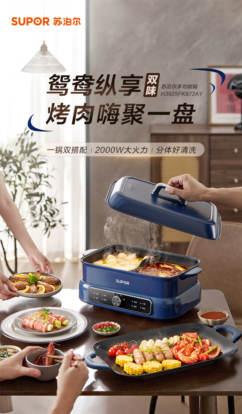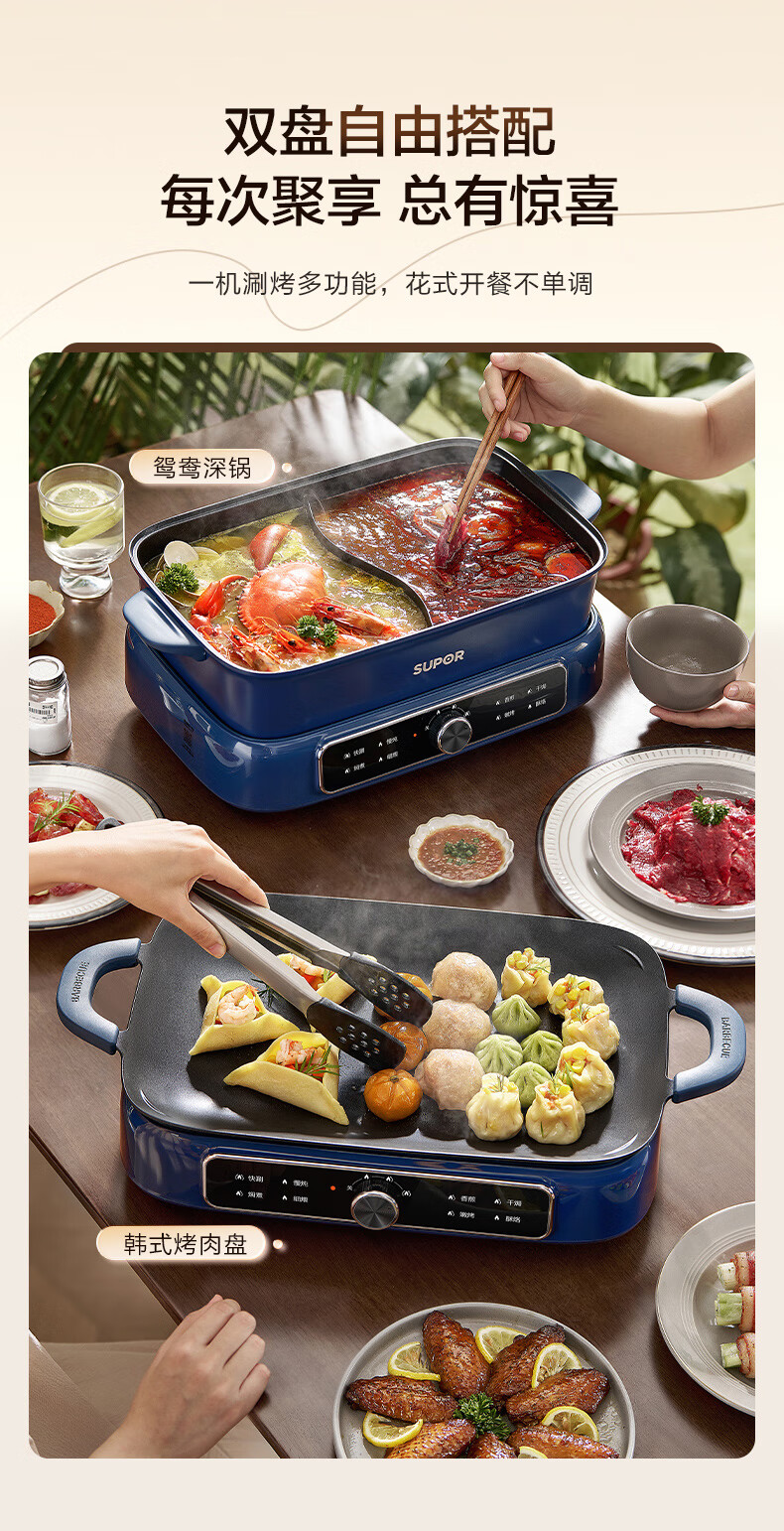 苏泊尔(SUPOR)鸳鸯电火锅 多功能电烤盘烤肉锅 火锅专用锅 分体家用涮肉电煮锅 7L多用途H3925FK872AY