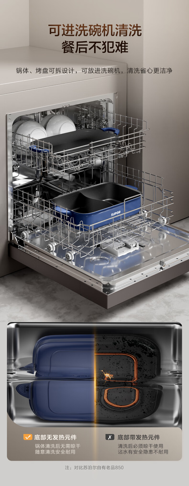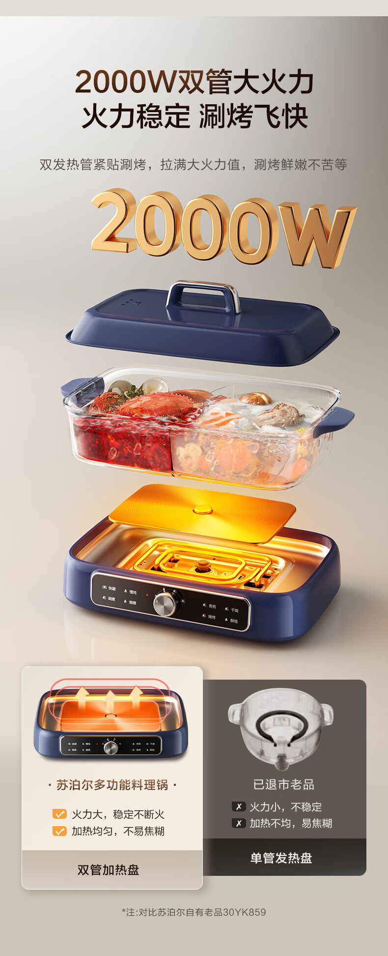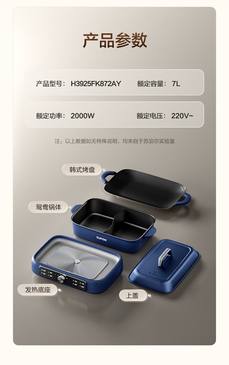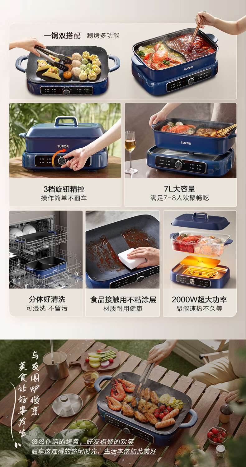 苏泊尔(SUPOR)鸳鸯电火锅 多功能电烤盘烤肉锅 火锅专用锅 分体家用涮肉电煮锅 7L多用途H3925FK872AY