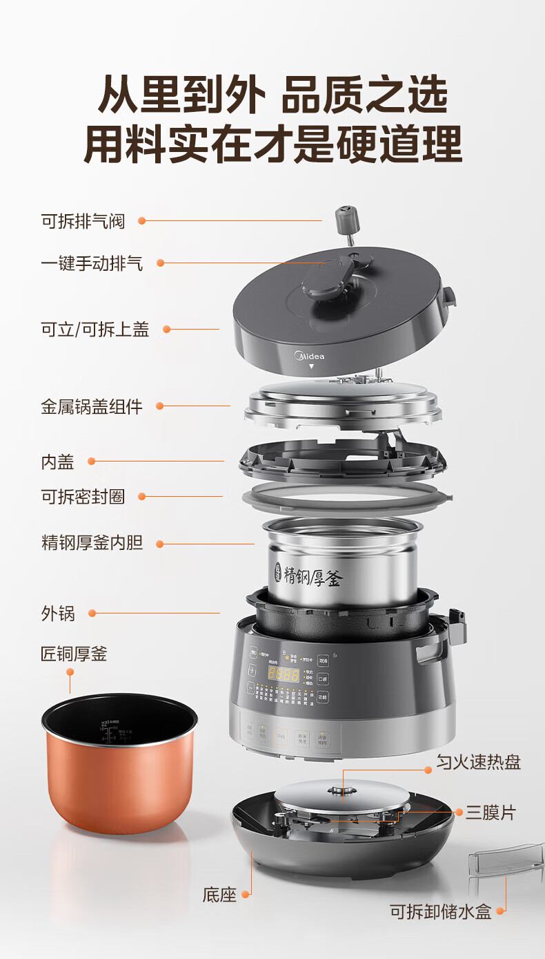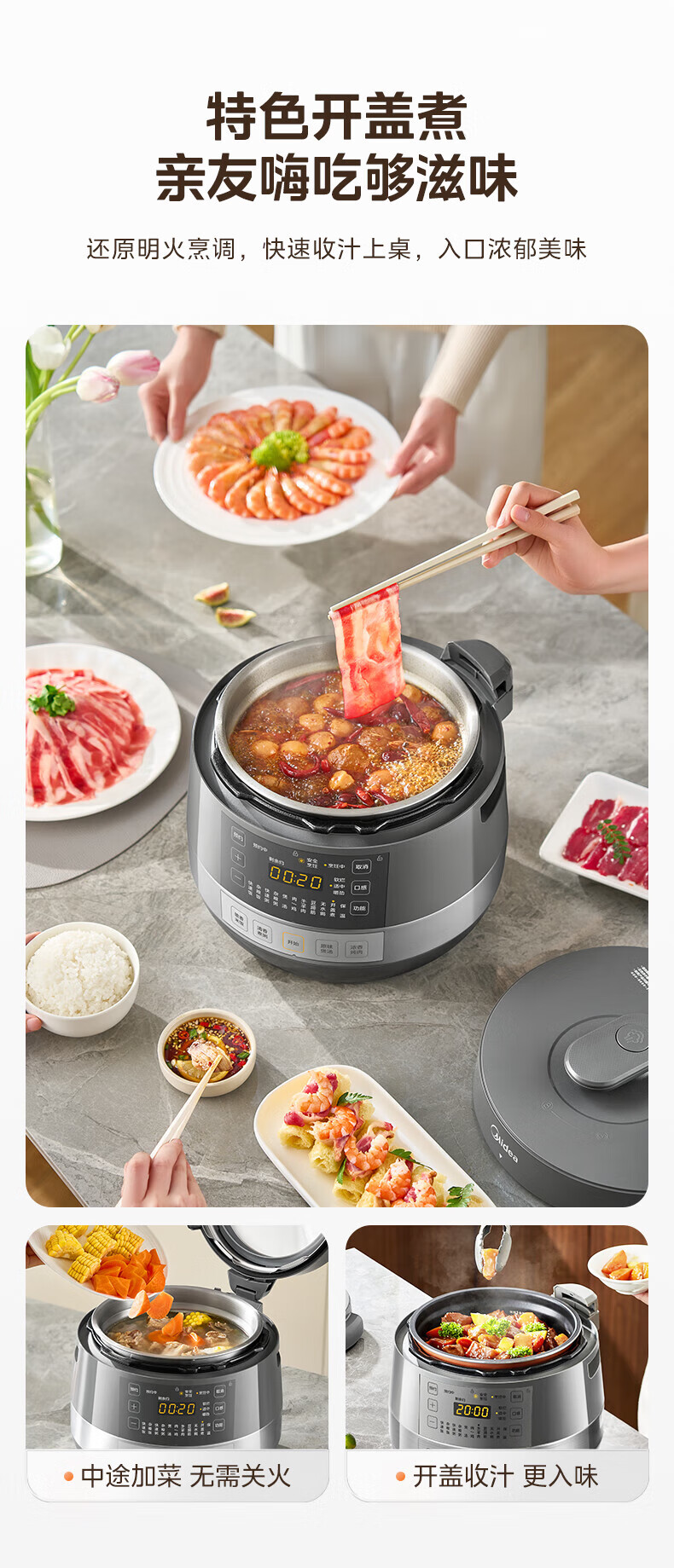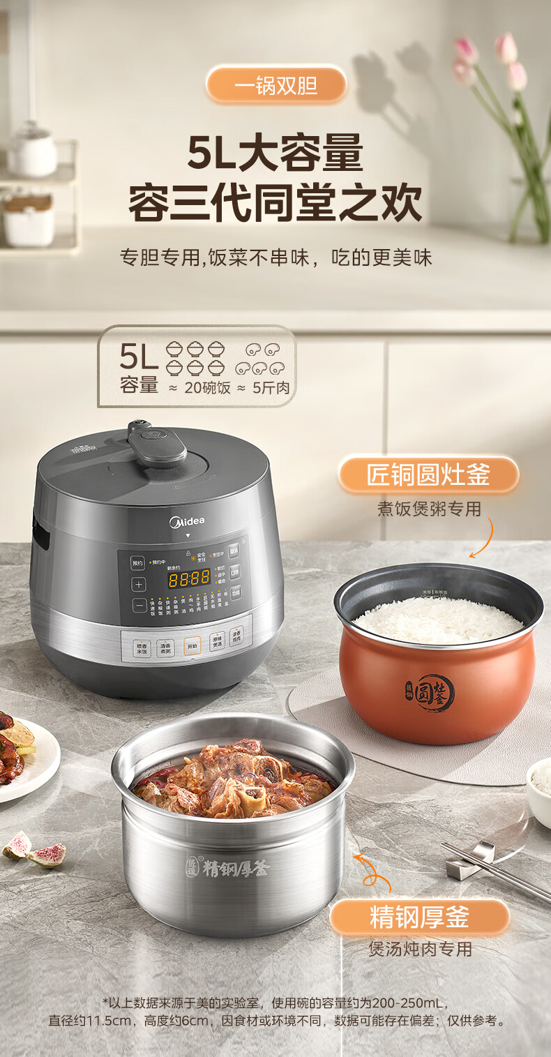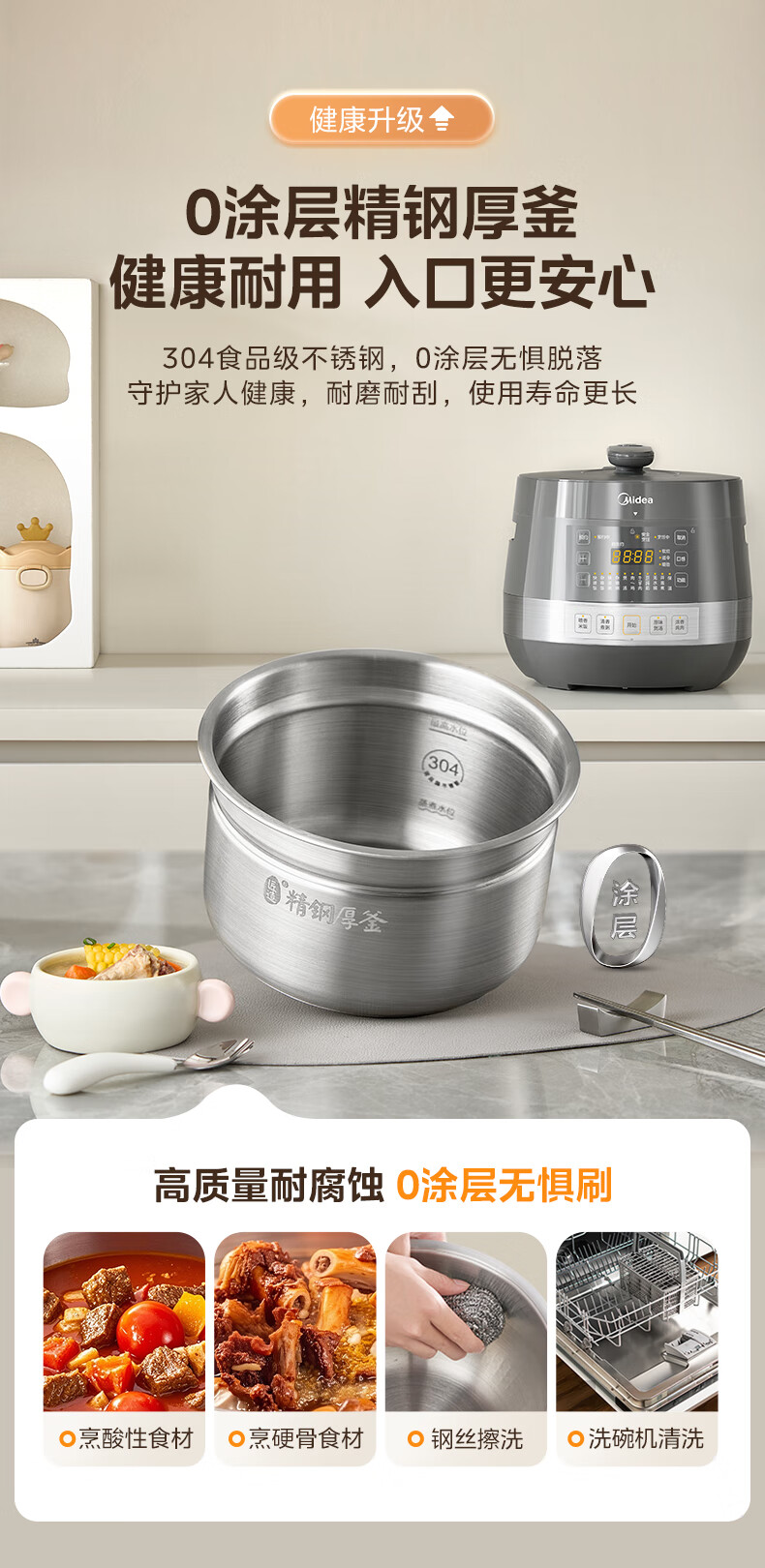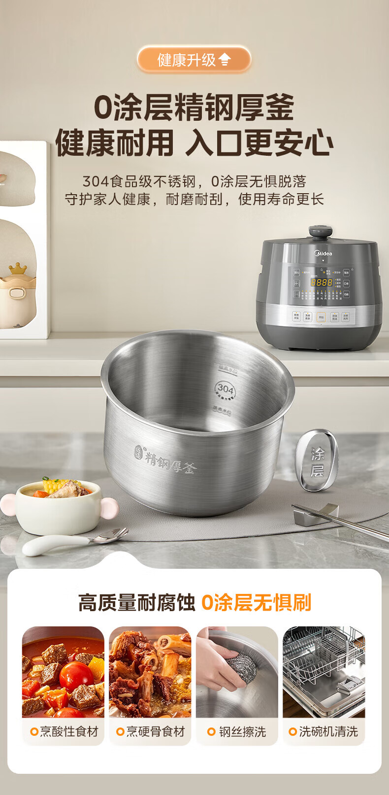 美的(Midea)电压力锅0涂层系列304不锈钢内胆电高压锅双胆 电饭煲稳定控压技术高压电饭锅 【精钢厚釜】0涂层 健康煮 5L