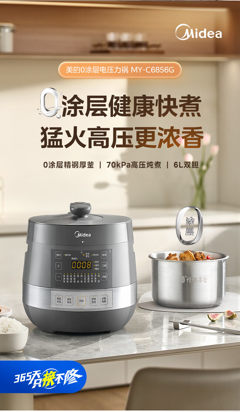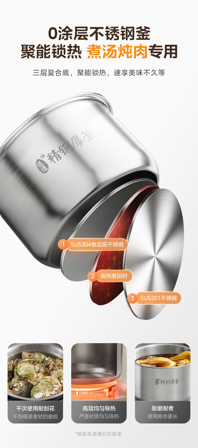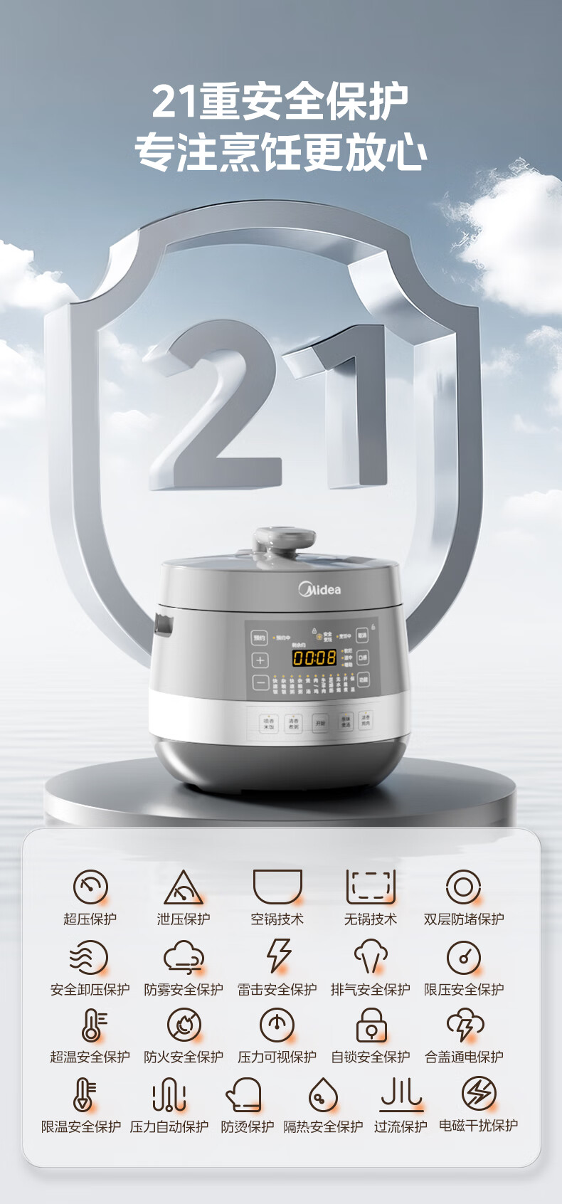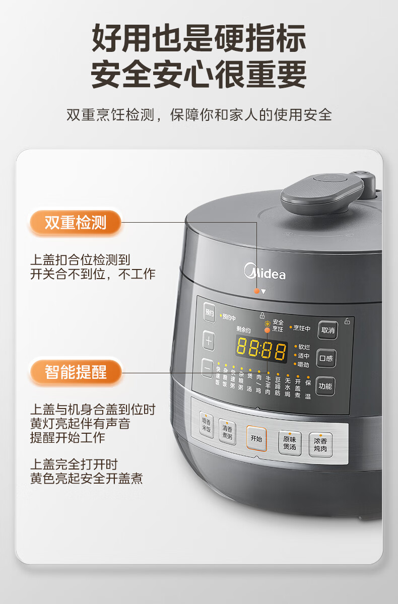 美的(Midea)电压力锅0涂层系列304不锈钢内胆电高压锅双胆 电饭煲稳定控压技术高压电饭锅 【精钢厚釜】0涂层 健康煮 5L