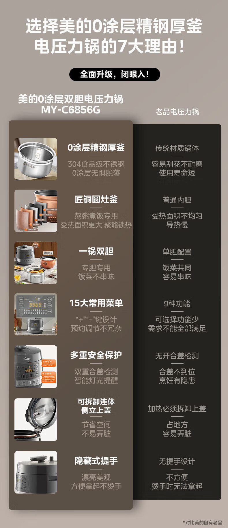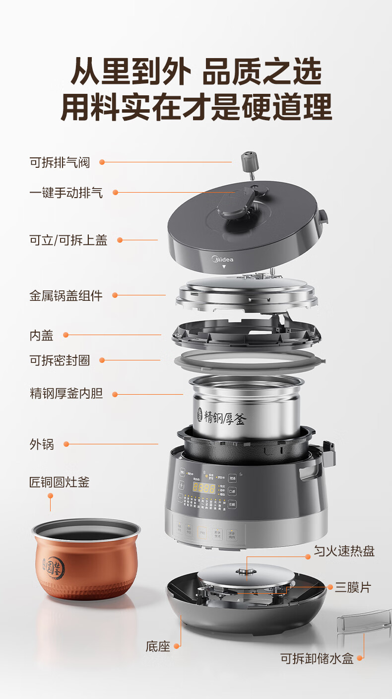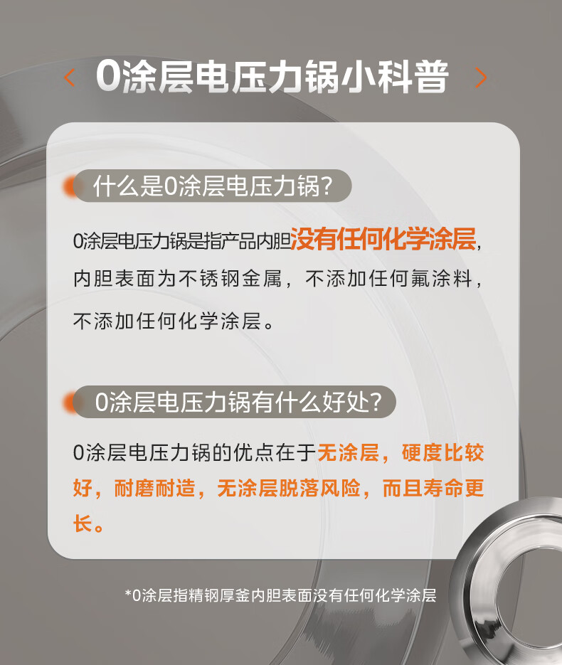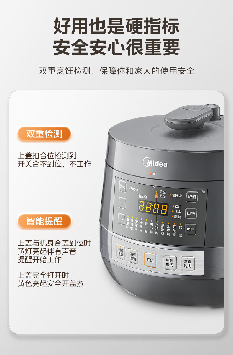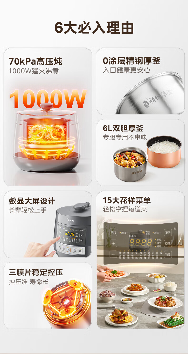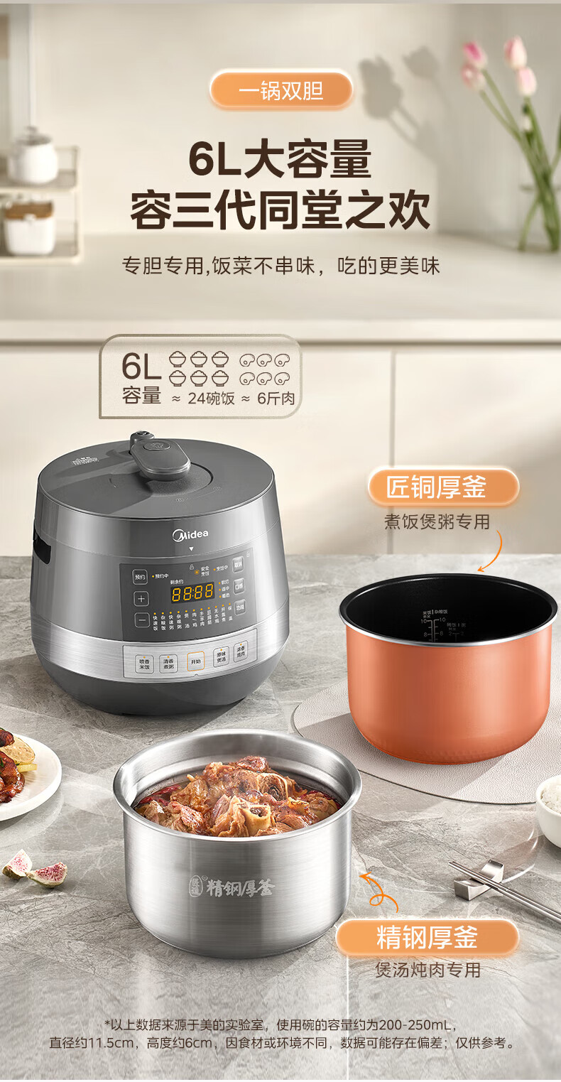 美的(Midea)电压力锅0涂层系列304不锈钢内胆电高压锅双胆 电饭煲稳定控压技术高压电饭锅 【精钢厚釜】0涂层 健康煮 5L
