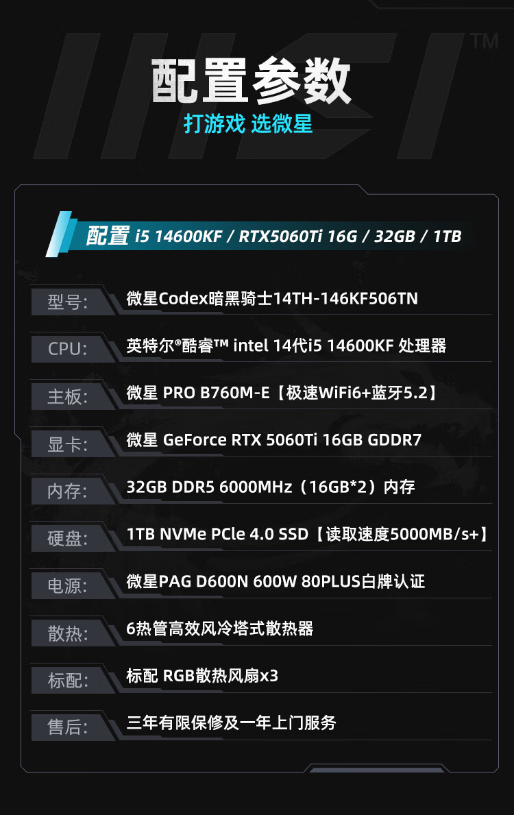 微星(MSI)暗黑骑士MAG 14代i5 14600KF/RTX5060Ti 16G/32G/1T 电竞游戏设计师台式电脑主机整机