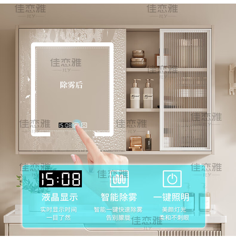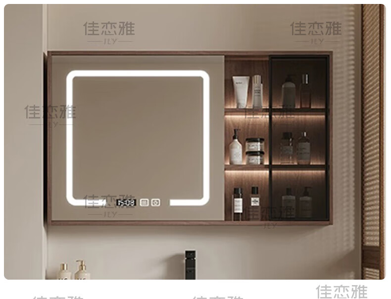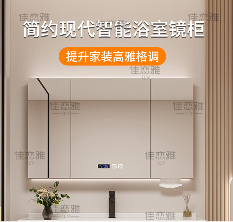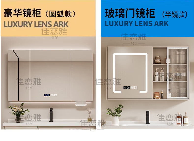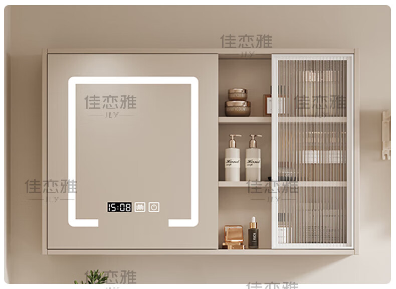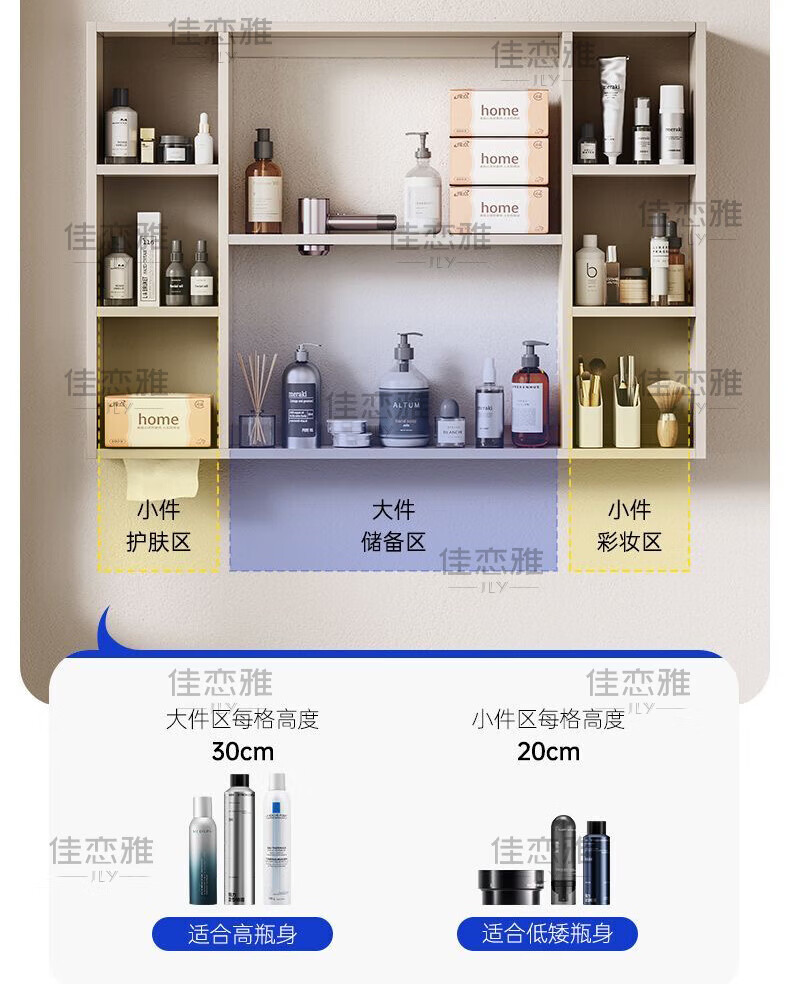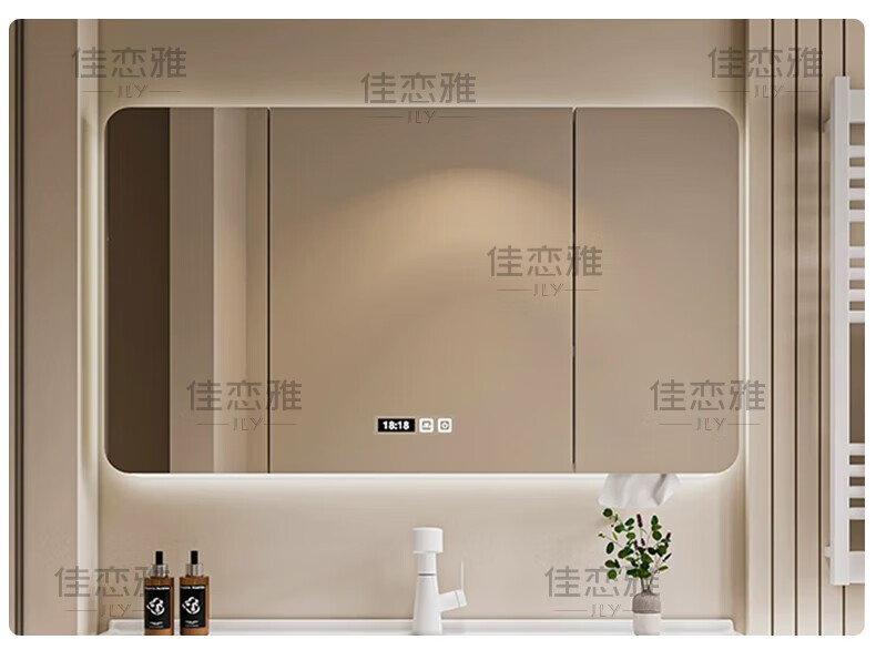佳恋雅(JIALIANYA)奶油风挂墙式浴室柜智能多层实木镜柜高清镜子壁挂收纳置物单镜柜 85cm圆弧智能镜柜-卡其色