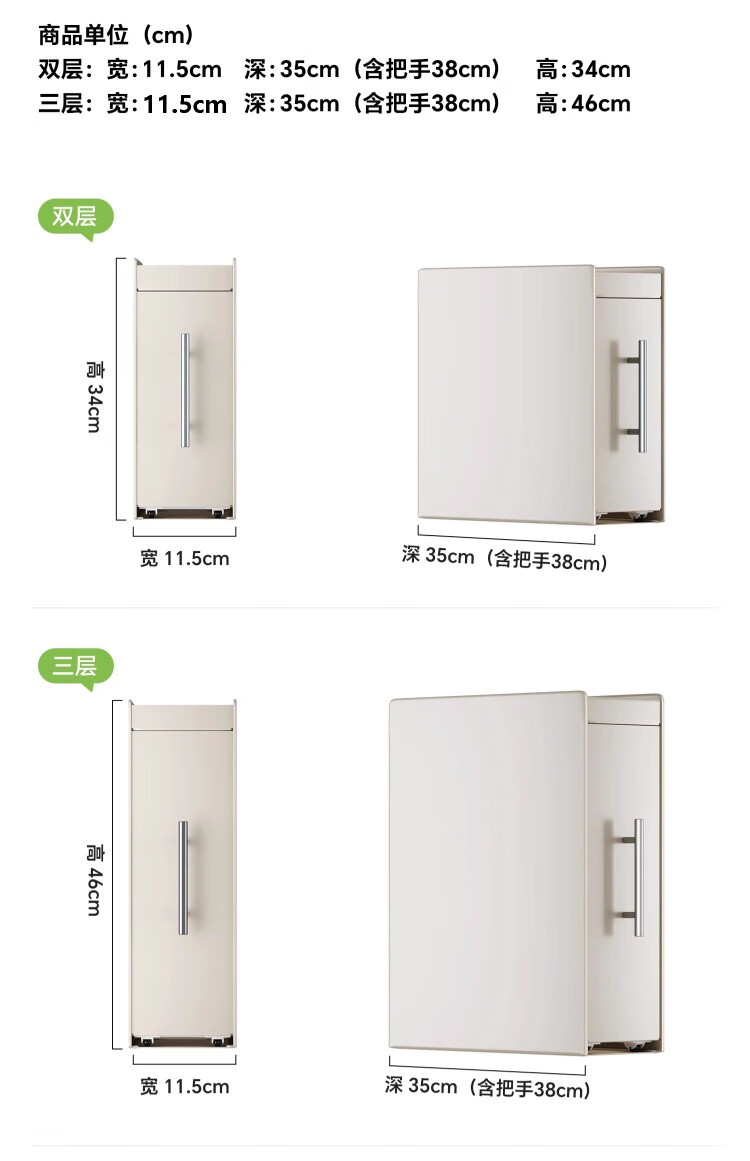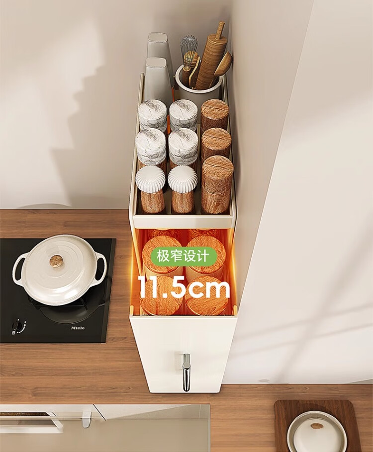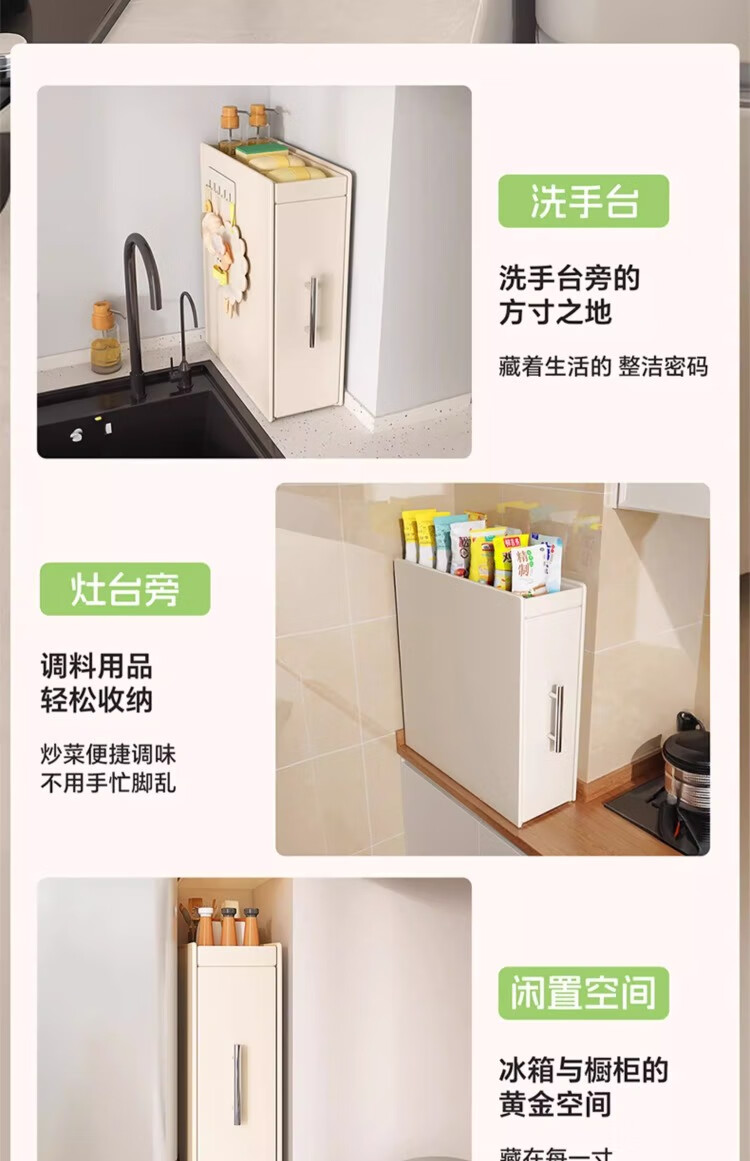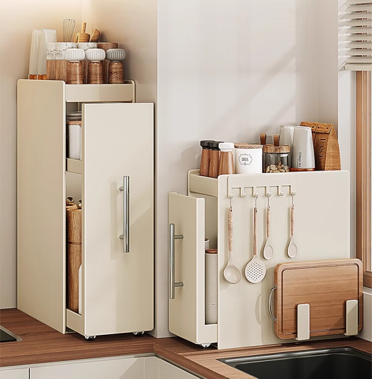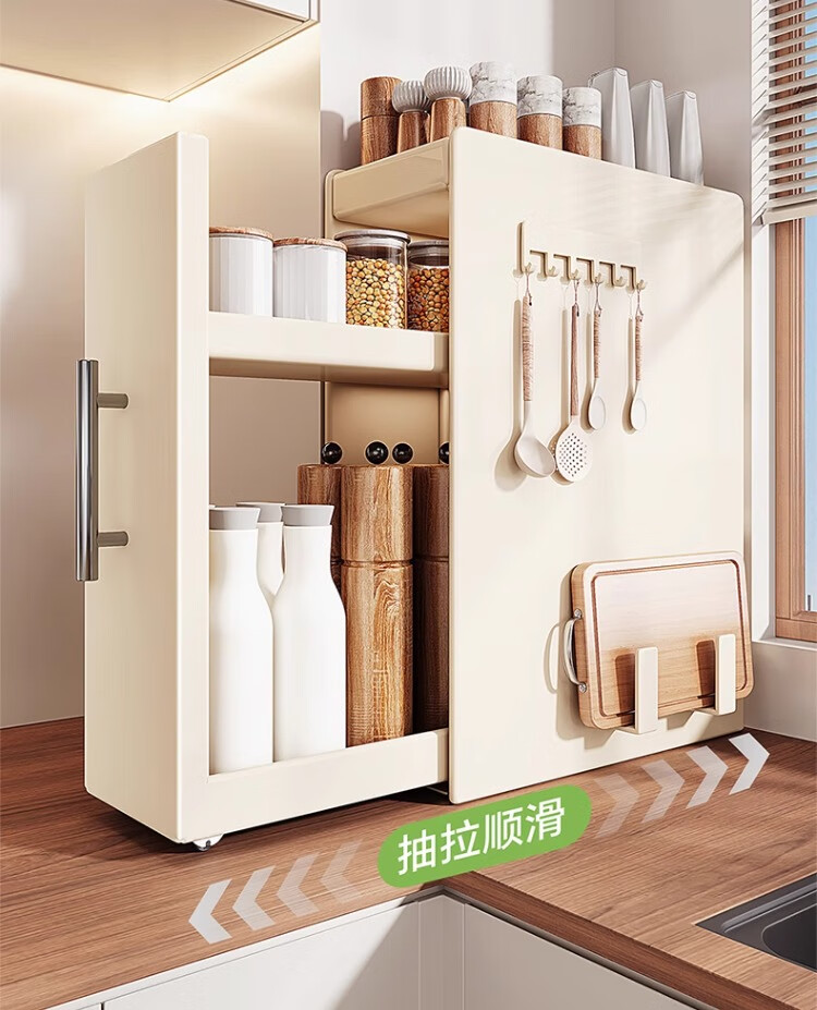 衣炫防尘抽拉式调料品置物架厨房多功能调味料台面收纳柜架子盒窄边 奶油白-三层小号(带磁吸挂钩+砧板架)