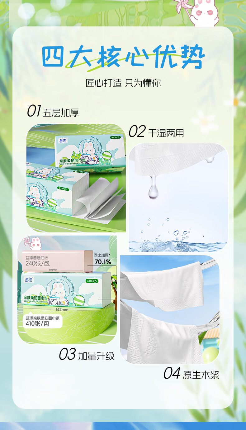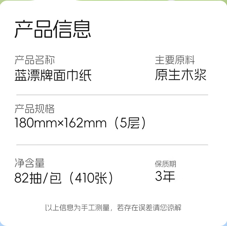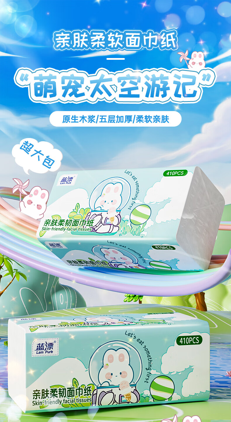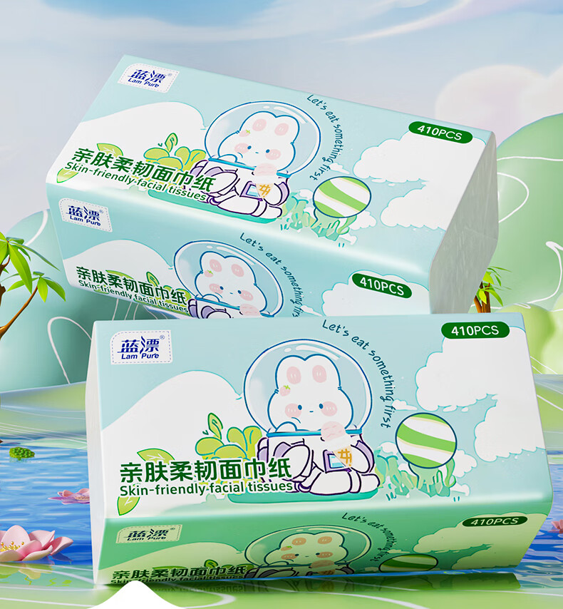 蓝漂大包抽纸纸巾大尺寸餐巾纸面巾纸家用卫生纸原木纸抽纸 5层 410张*6包 【体验装】