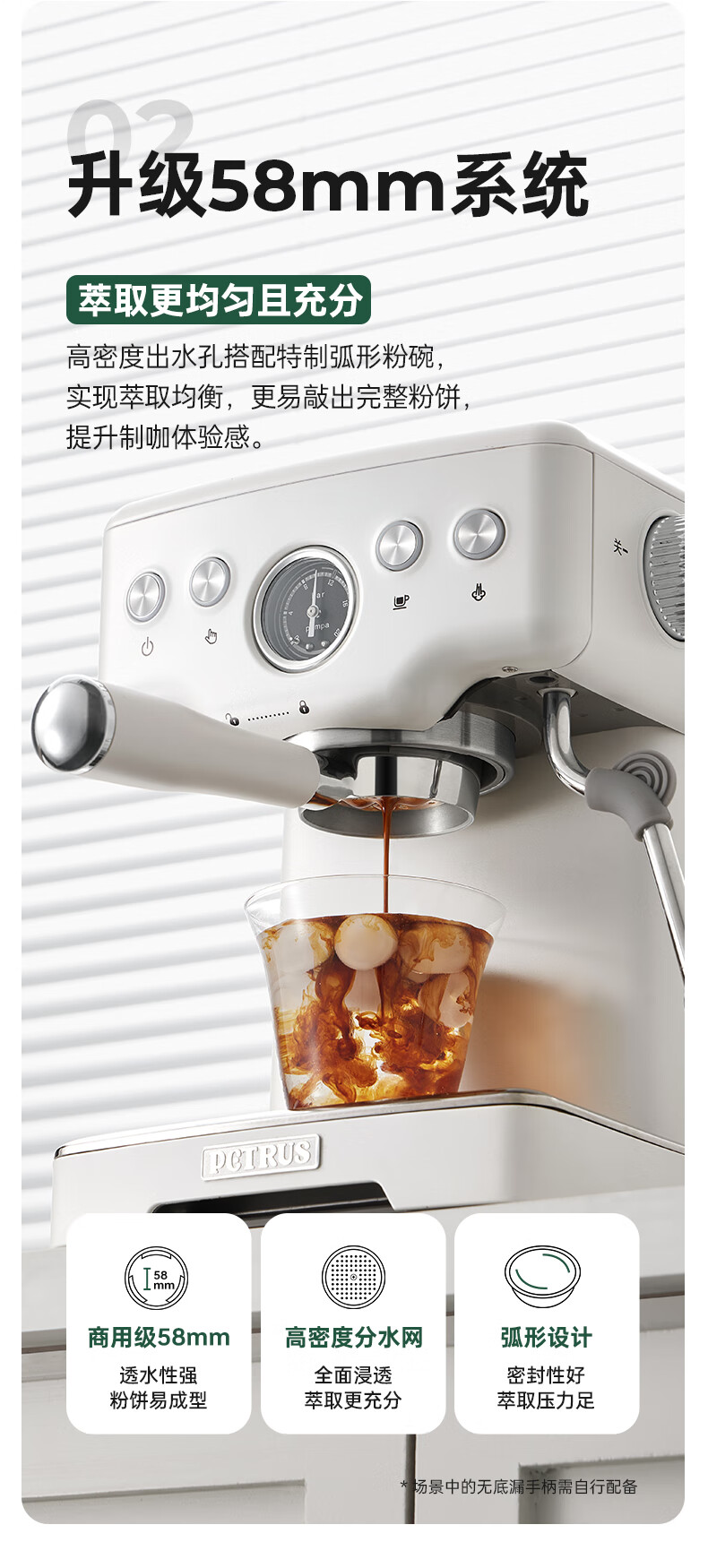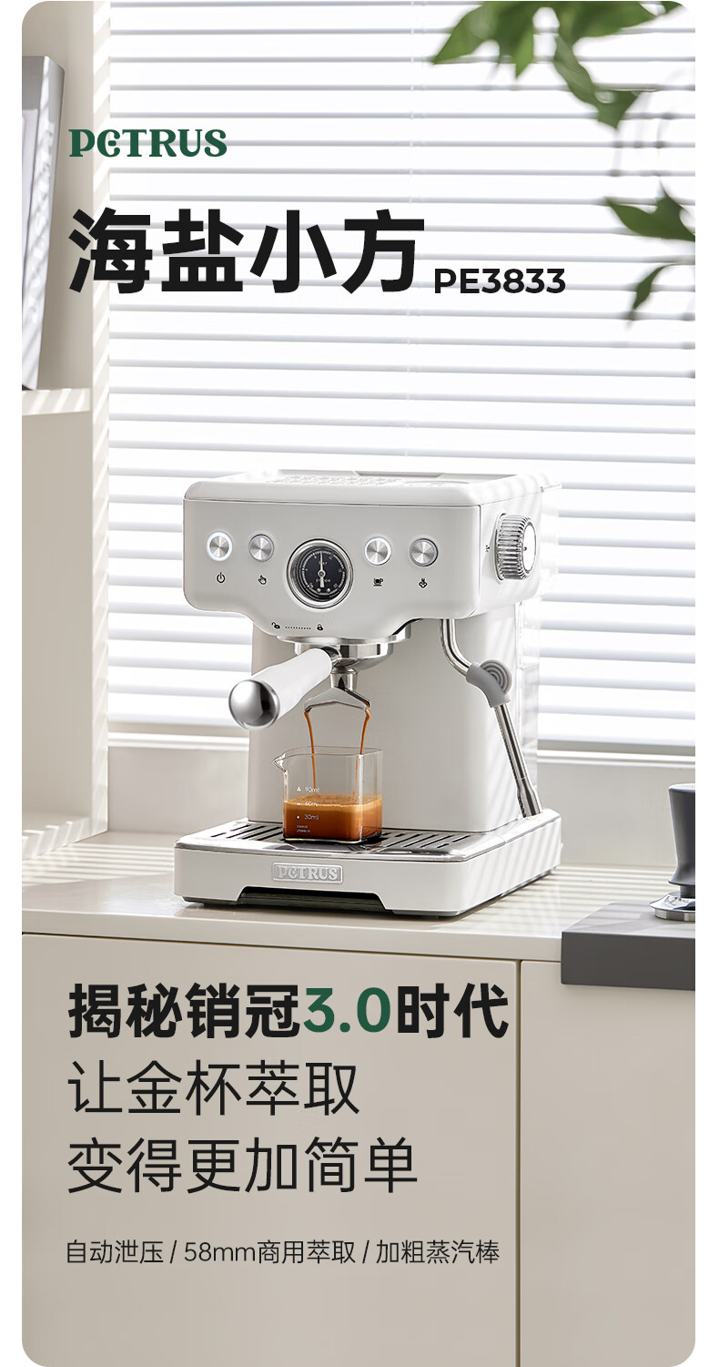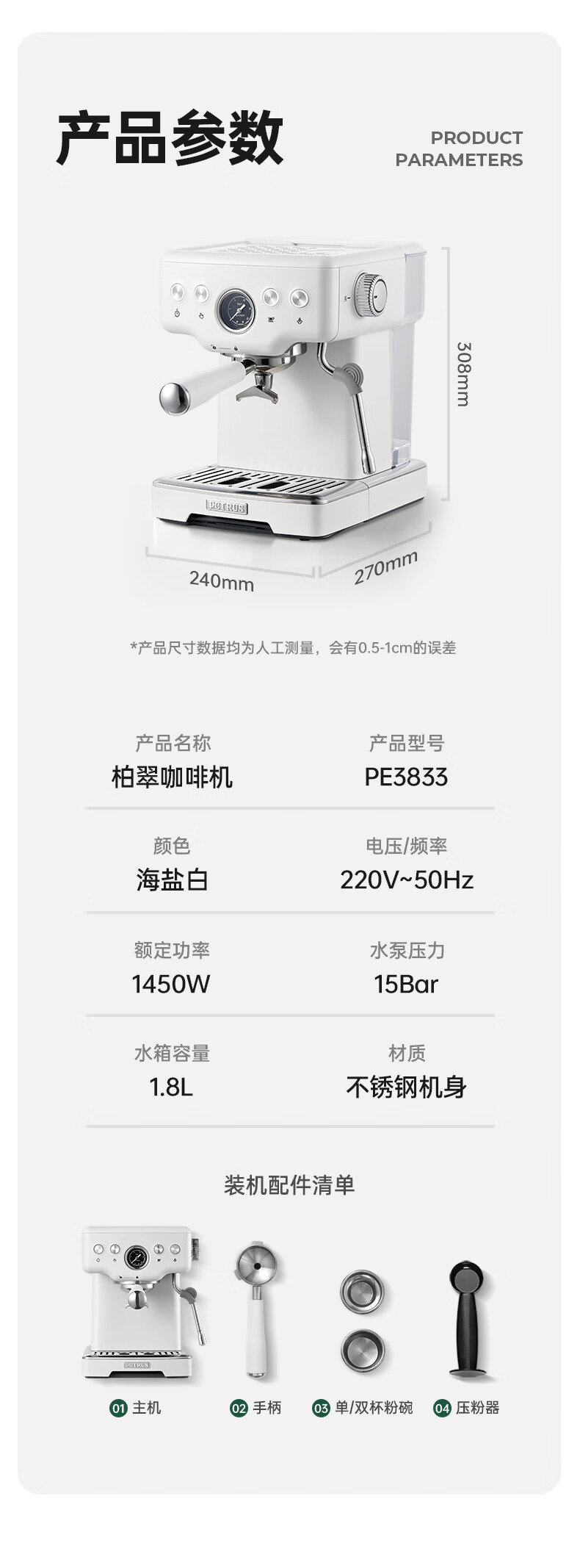 柏翠意式咖啡机浓缩家用小型58mm全半自动咖啡机蒸汽打奶泡精准控温海盐小方 PE3833 节日送礼物 3833+PE3788磨豆机套装