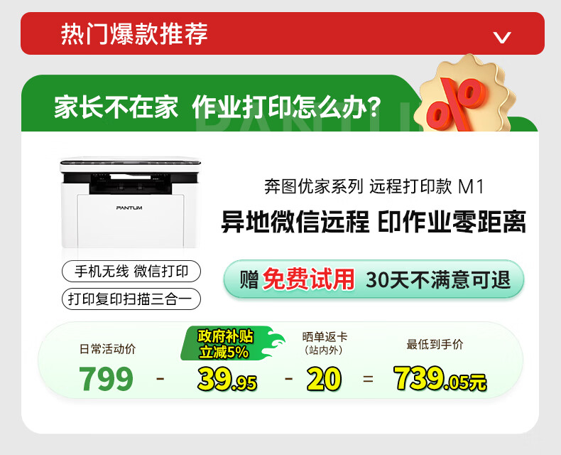 奔图(PANTUM)M1 lite激光打印机家用办公三合一 学生作业手机无线打印打卷子 办公室打印复印扫描一体机