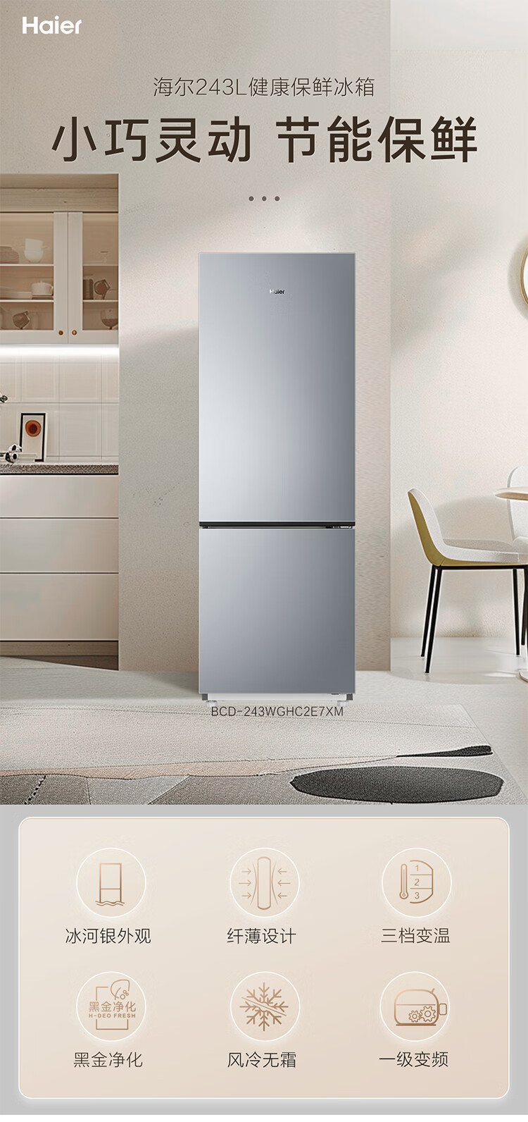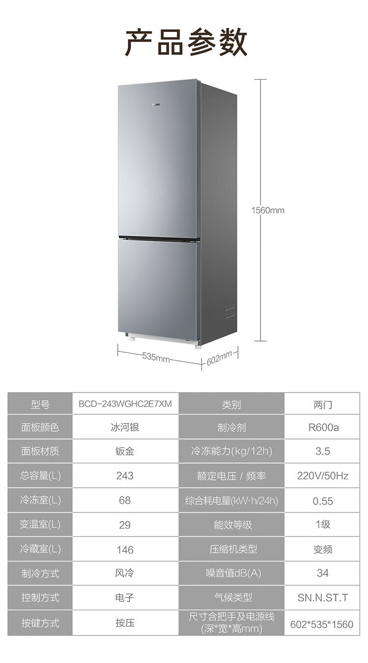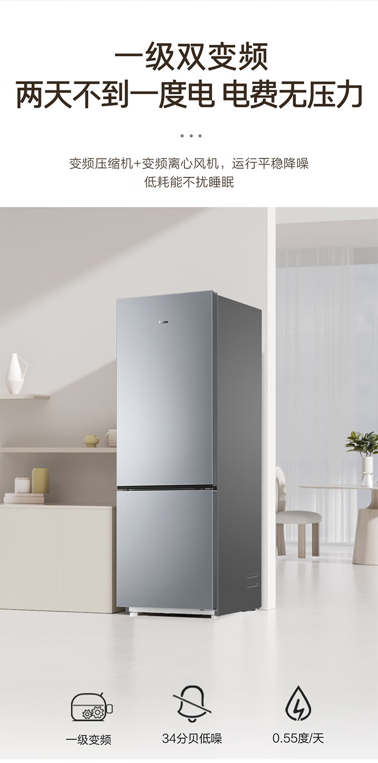 海尔(Haier)冰箱243升双开门两门风冷无霜一级能效小型宿舍公寓租房三档变温双变频节能家用电冰箱 小型两门+三档变温+健康黑金净化