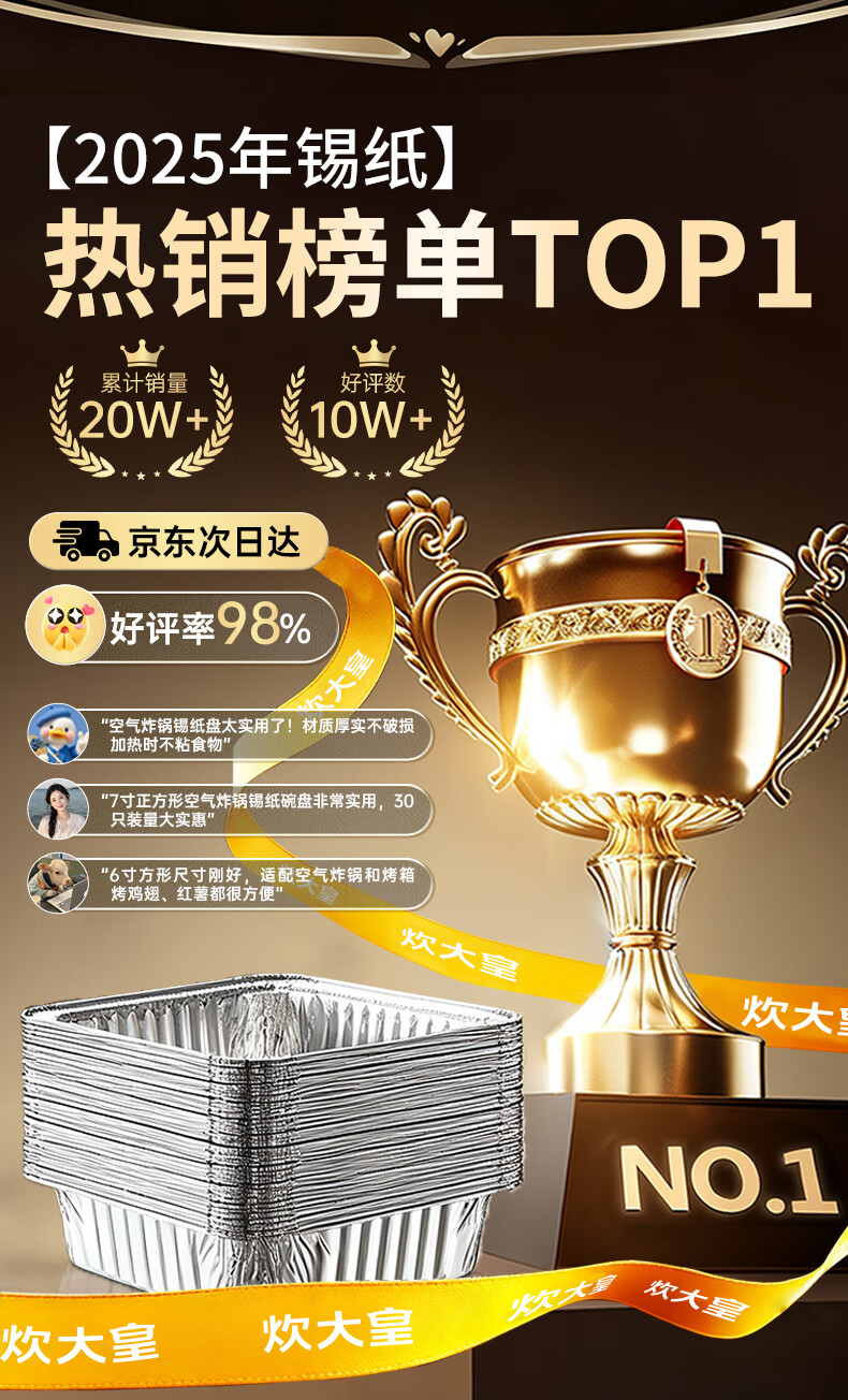 炊大皇 空气炸锅锡纸碗盘8寸50只正方形锡纸盒铝箔盘烧烤烤箱烤盘