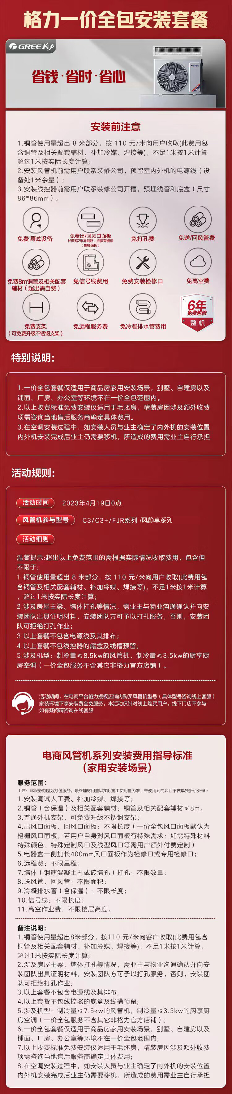格力(GREE)K+风静享 中央空调 风管机一拖一 1级能效 一价全包 全直流变频 格力精工安装 3匹 一级能效