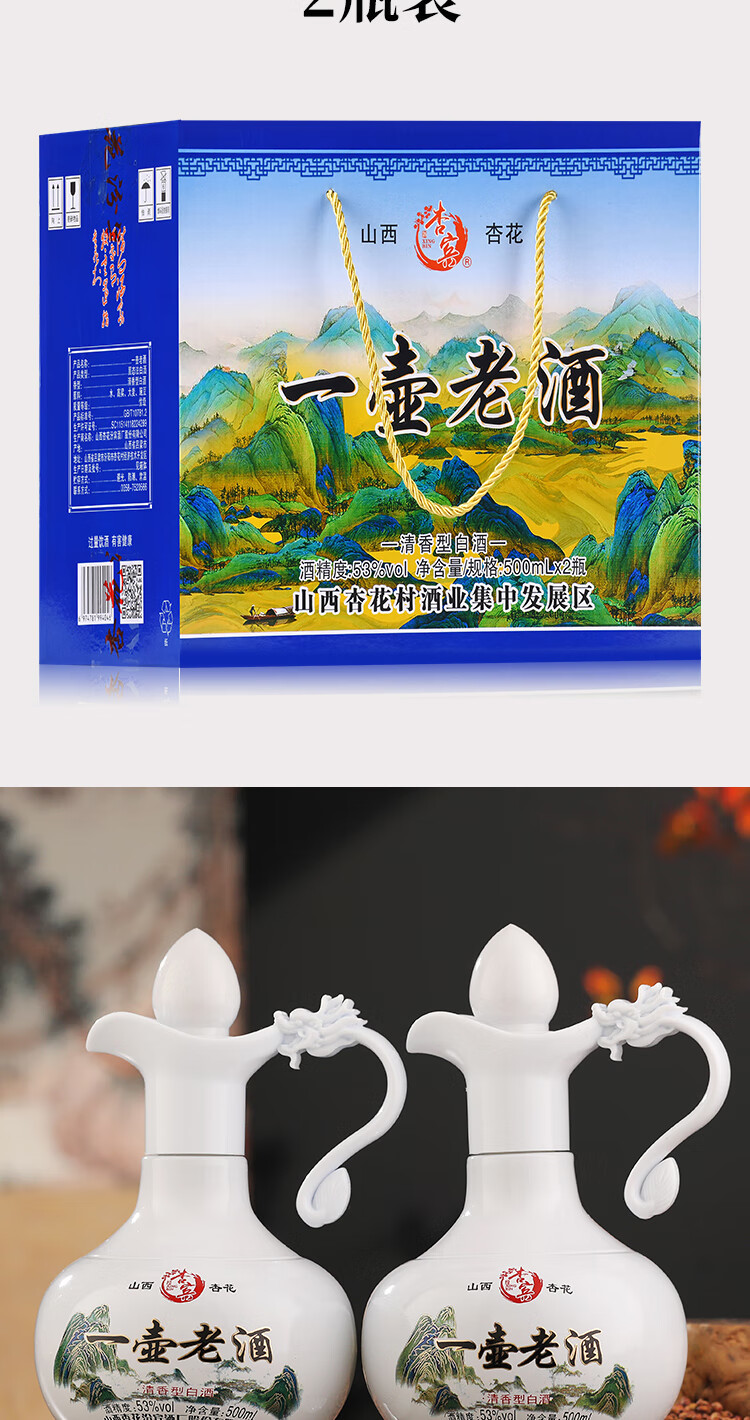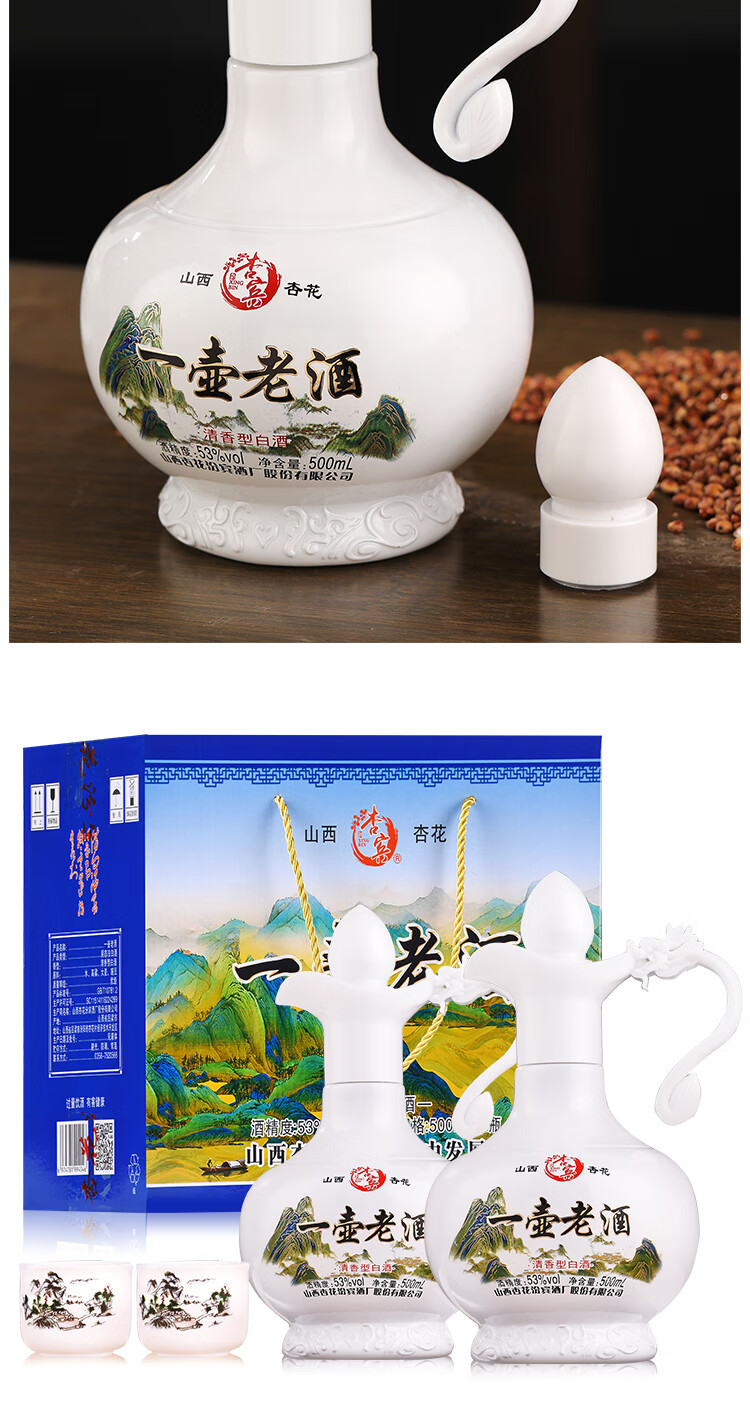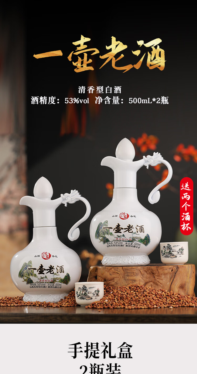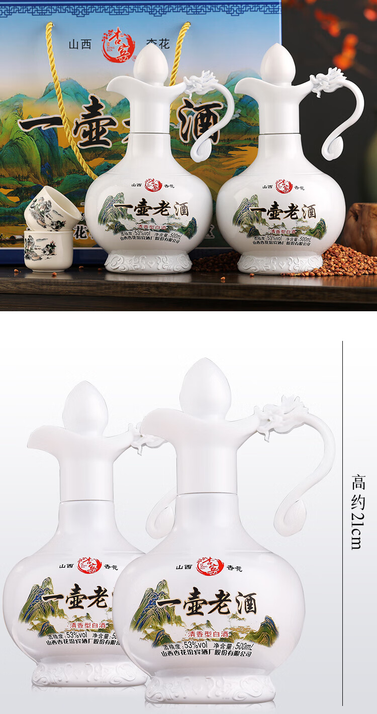 杏宾山西杏花村原产地53度清香型一壶老酒 53度 500mL 2瓶 礼盒装+2酒杯