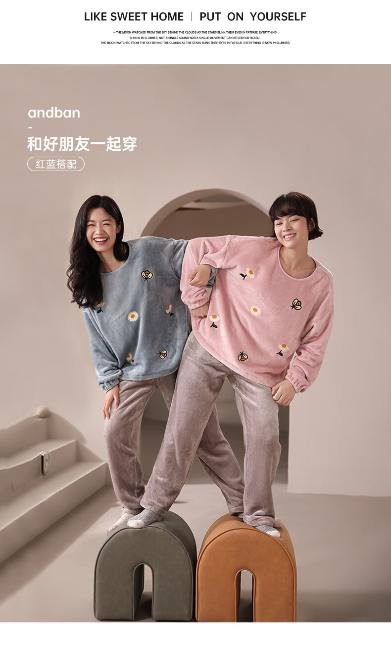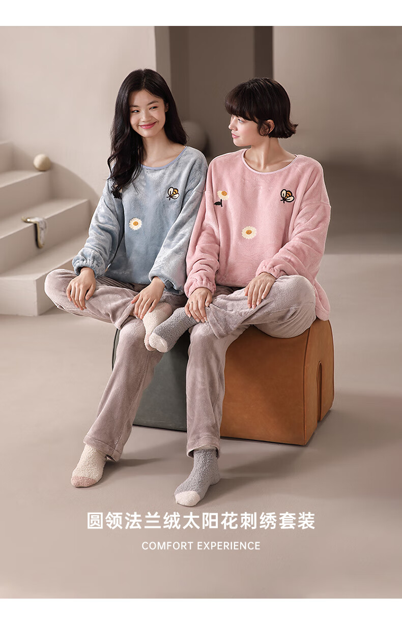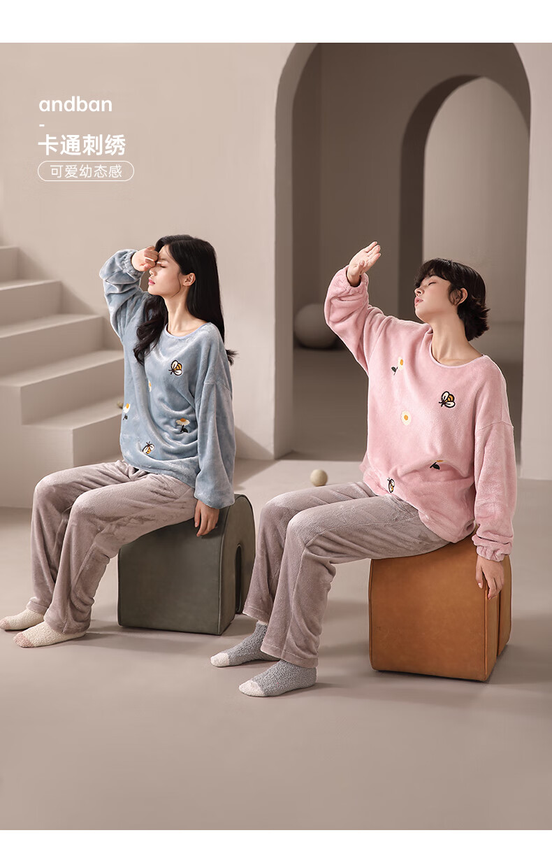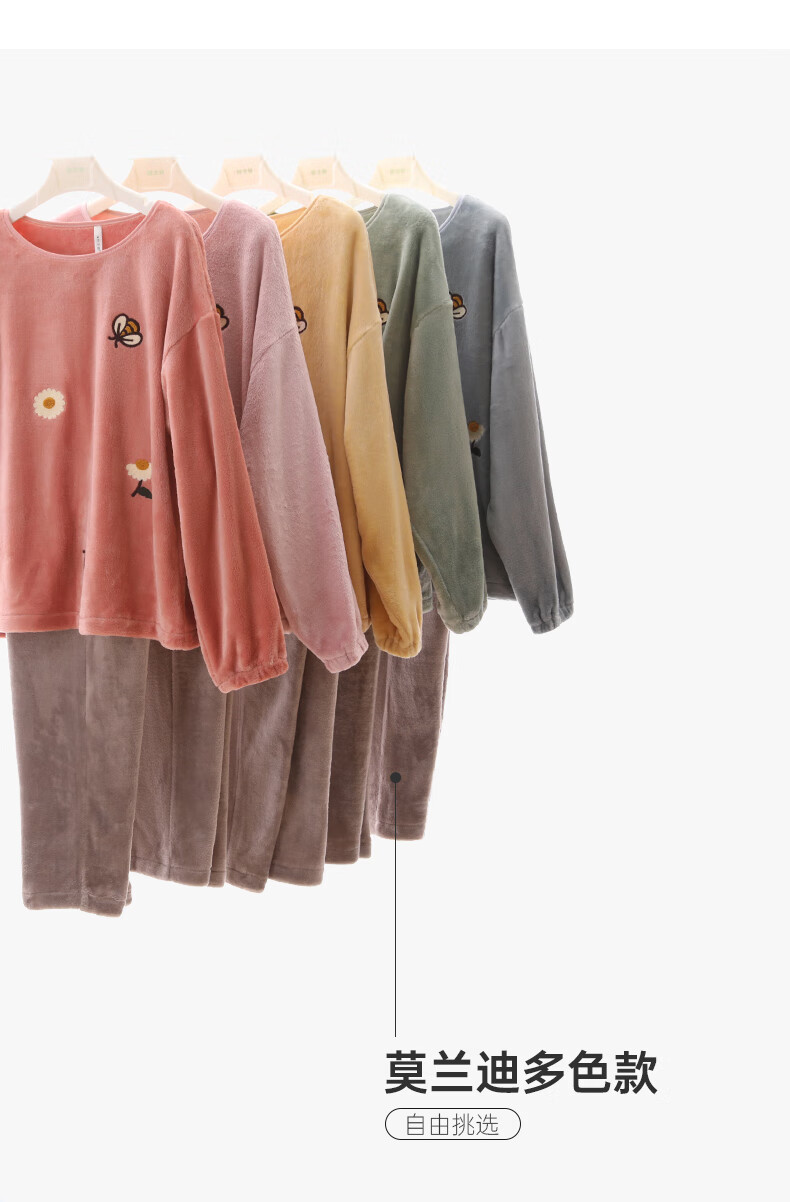 安之伴睡衣女秋冬法兰绒长袖套头圆领卡通多色保暖舒适可外穿家居服套装 冰兰(法兰绒锁温又柔软) L