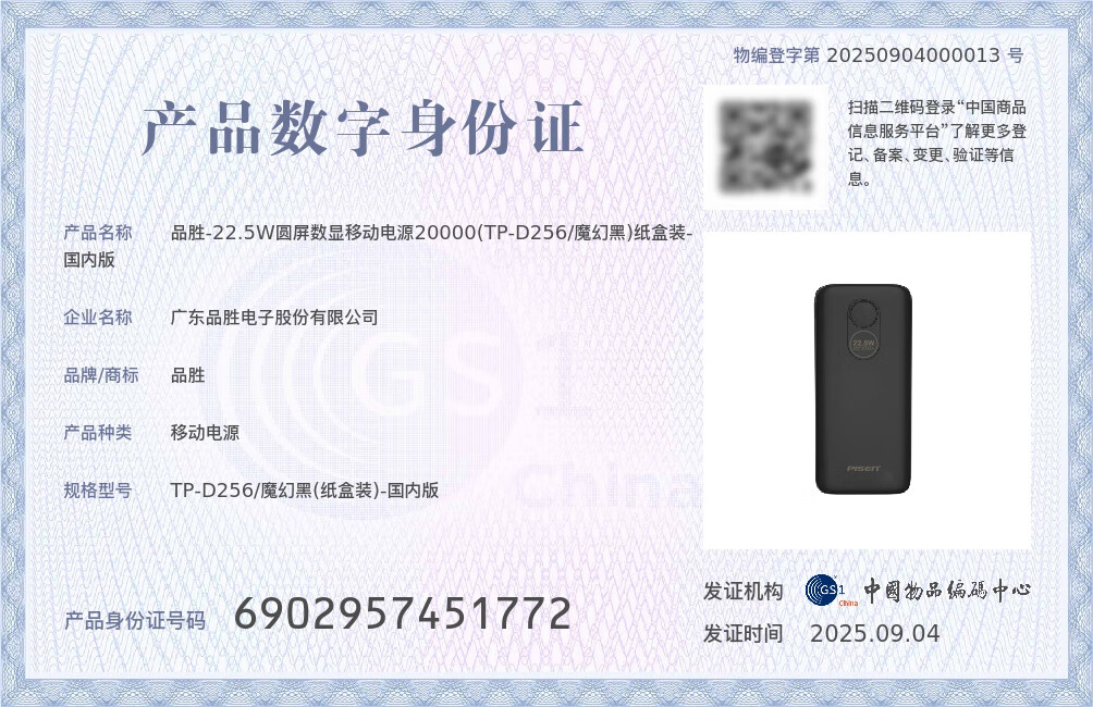 品胜【3C认证】22.5W超级快充20000mAh大容量充电宝可上飞机便携移动电源适用苹果17promax小米华为黑