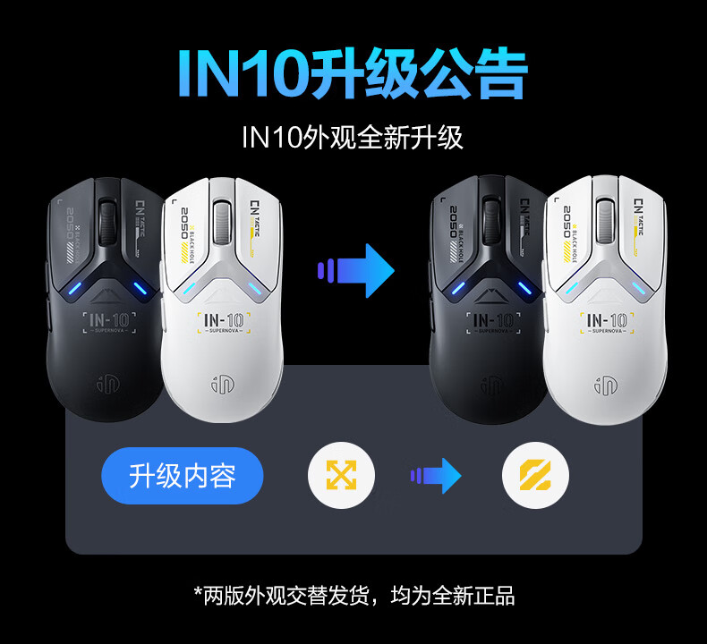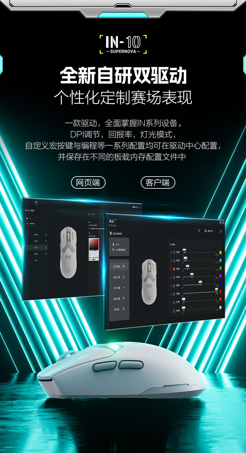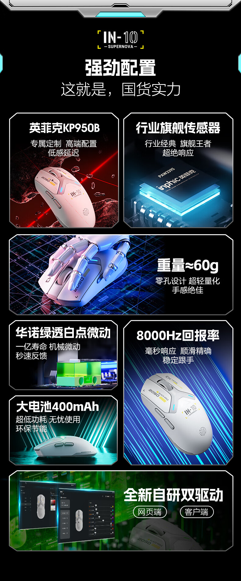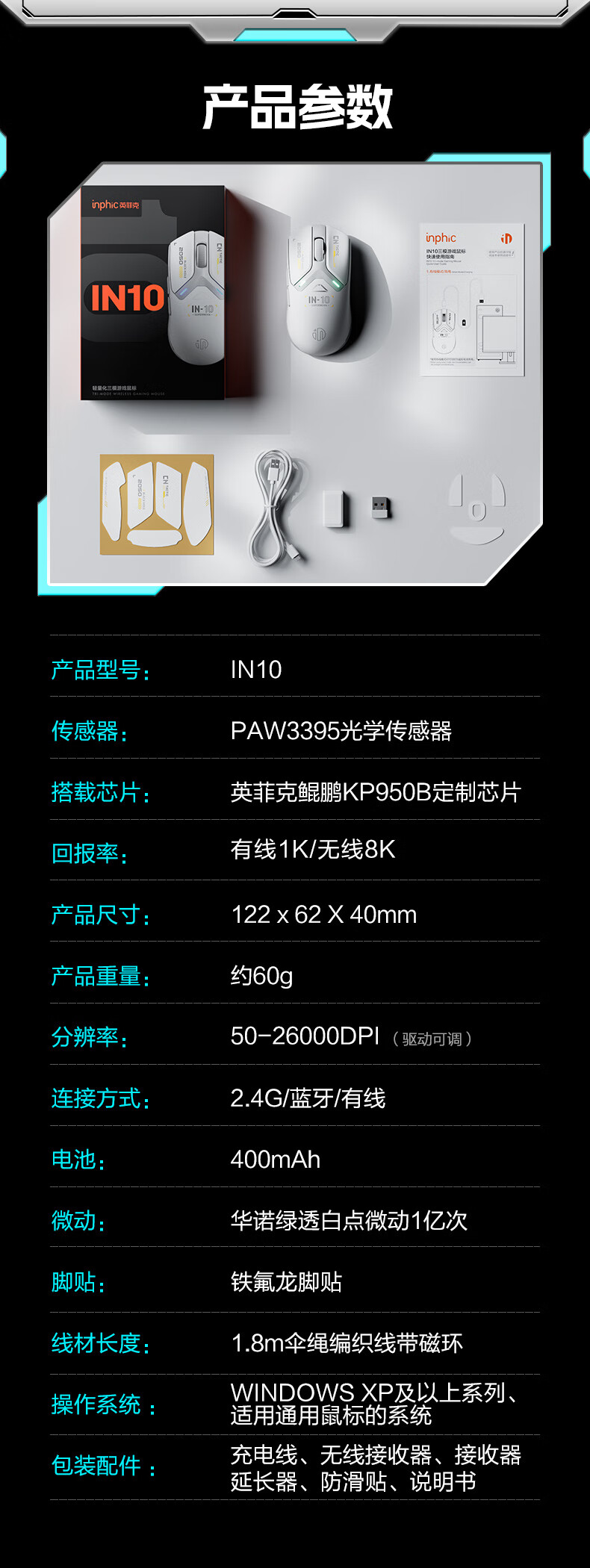 英菲克(INPHIC)IN10无线游戏鼠标有线蓝牙三模PAW3395电竞轻量化2.6万DPI/8K回报率/1亿次微动 星辉白