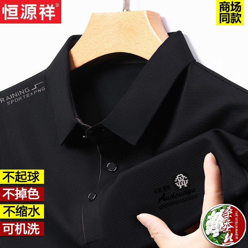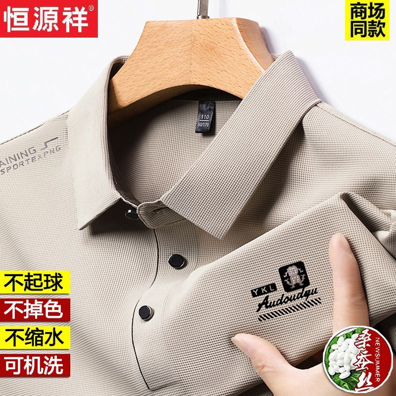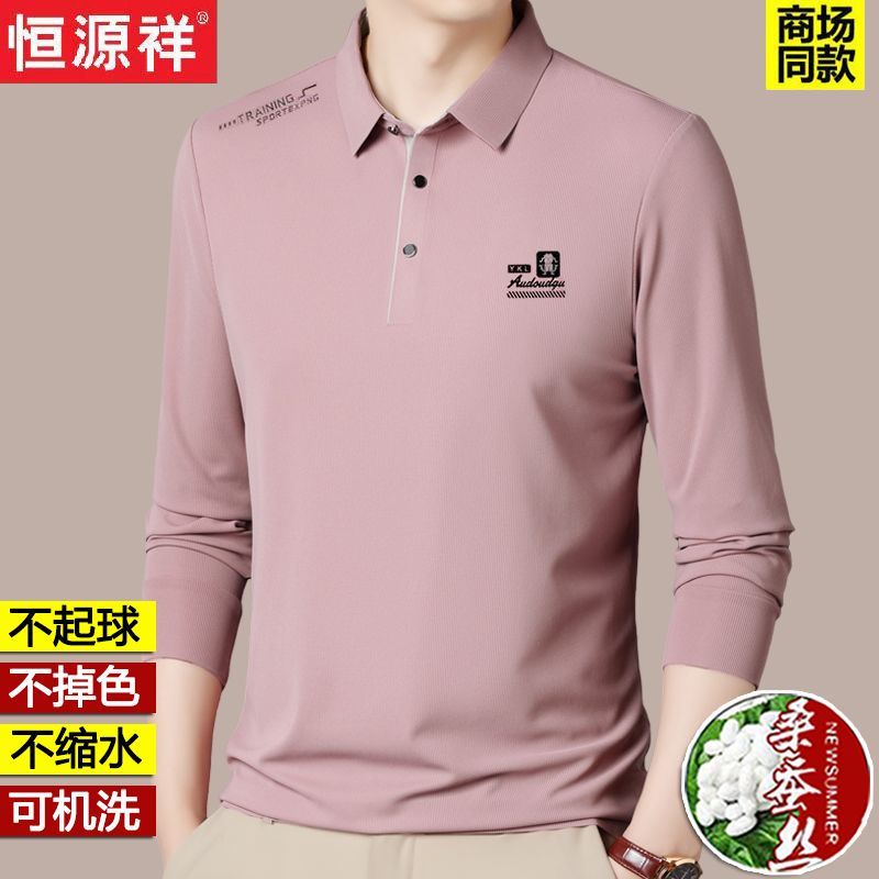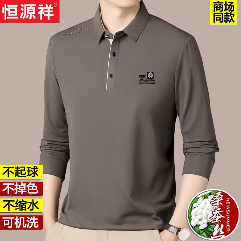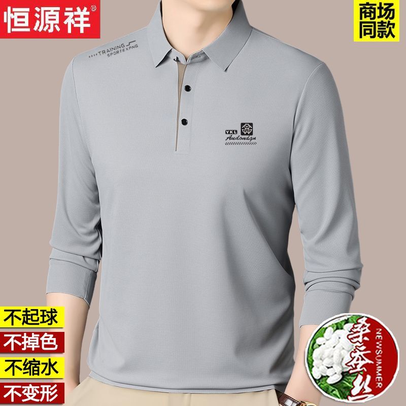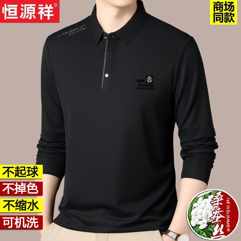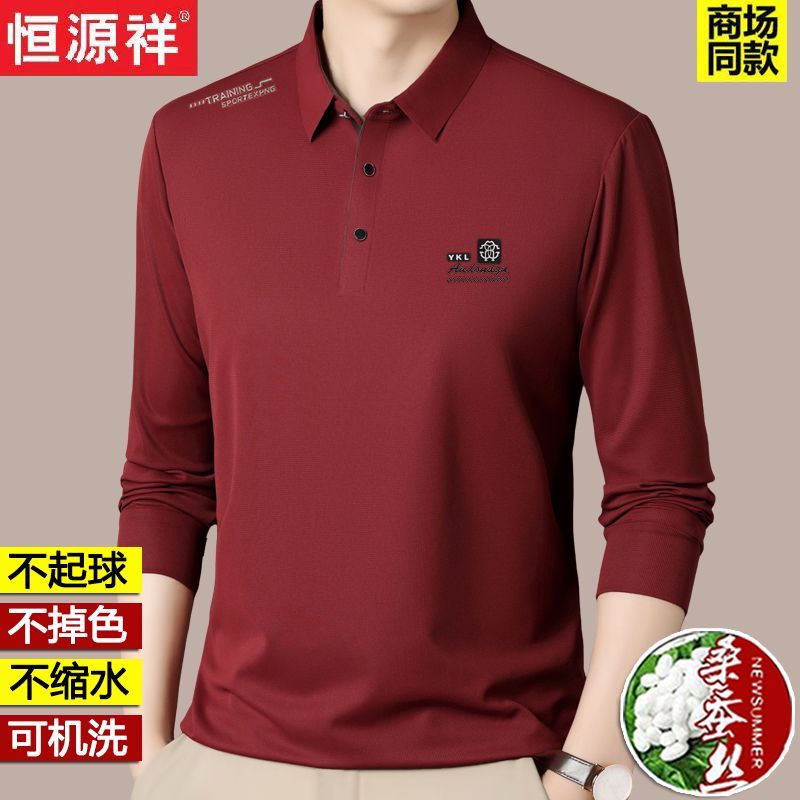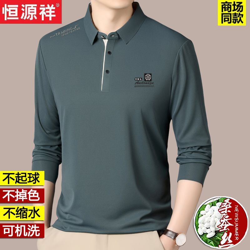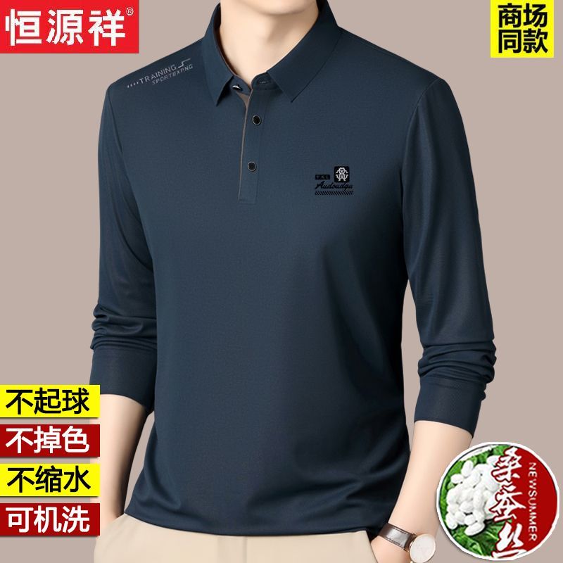 正品恒源祥桑蚕丝男士春秋季长袖T恤中年休闲宽松大码翻领POLO衫