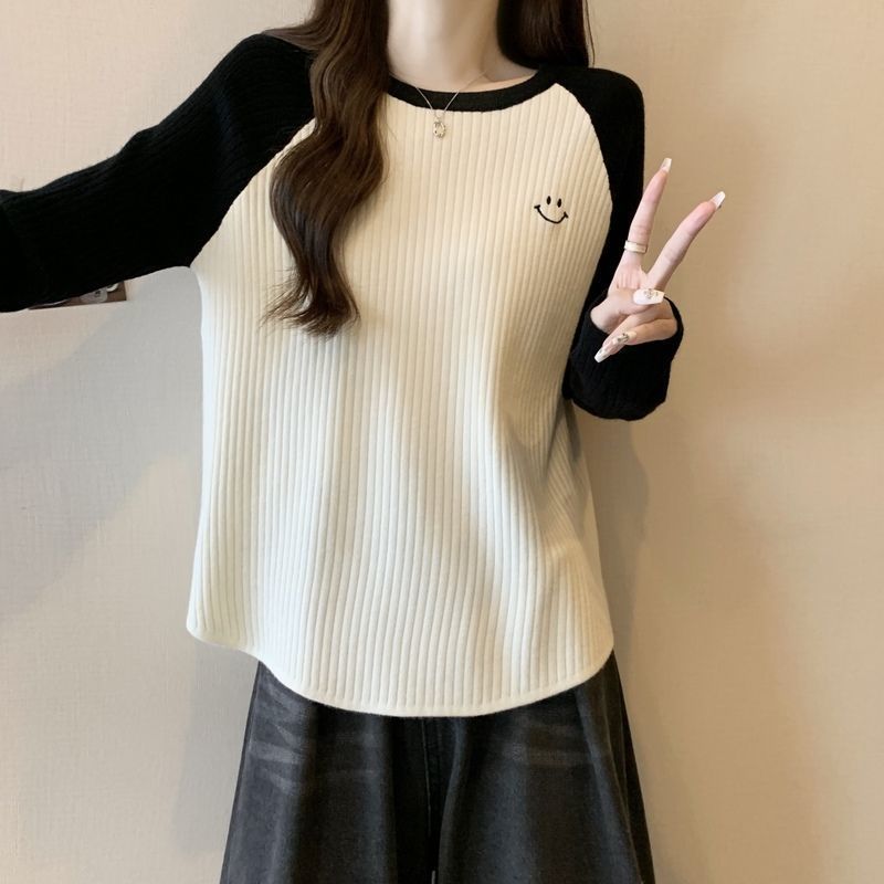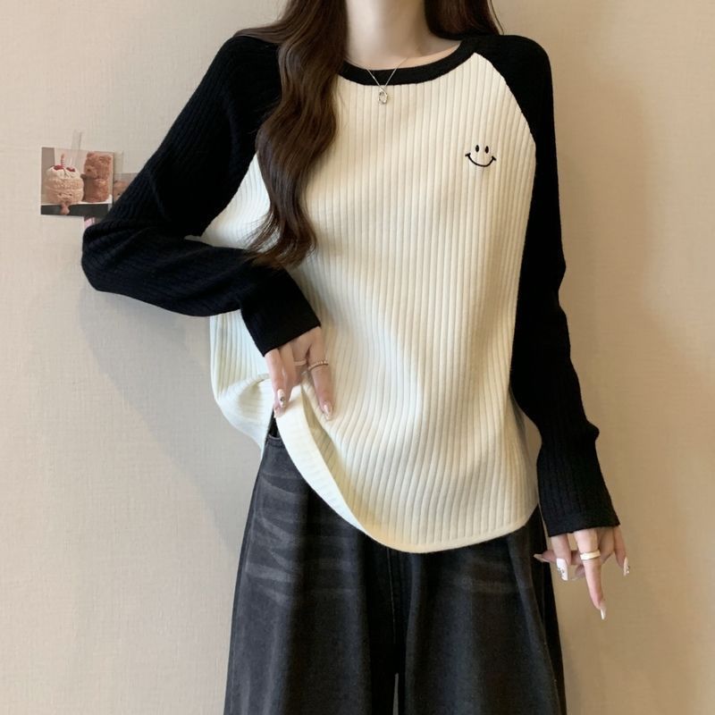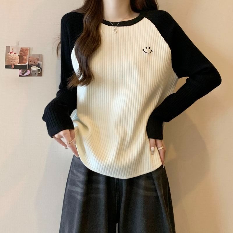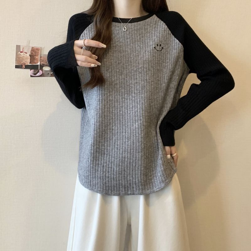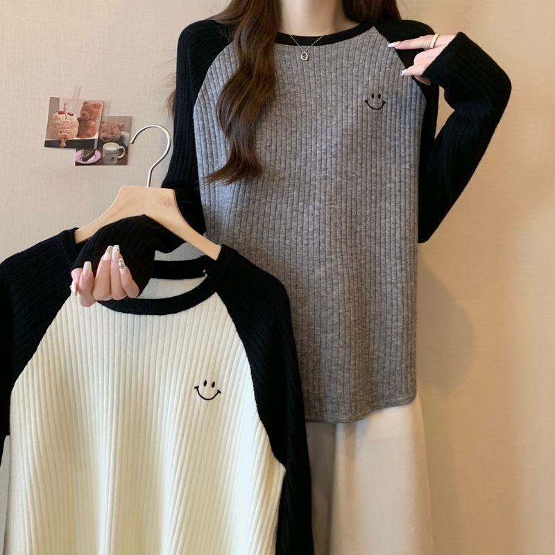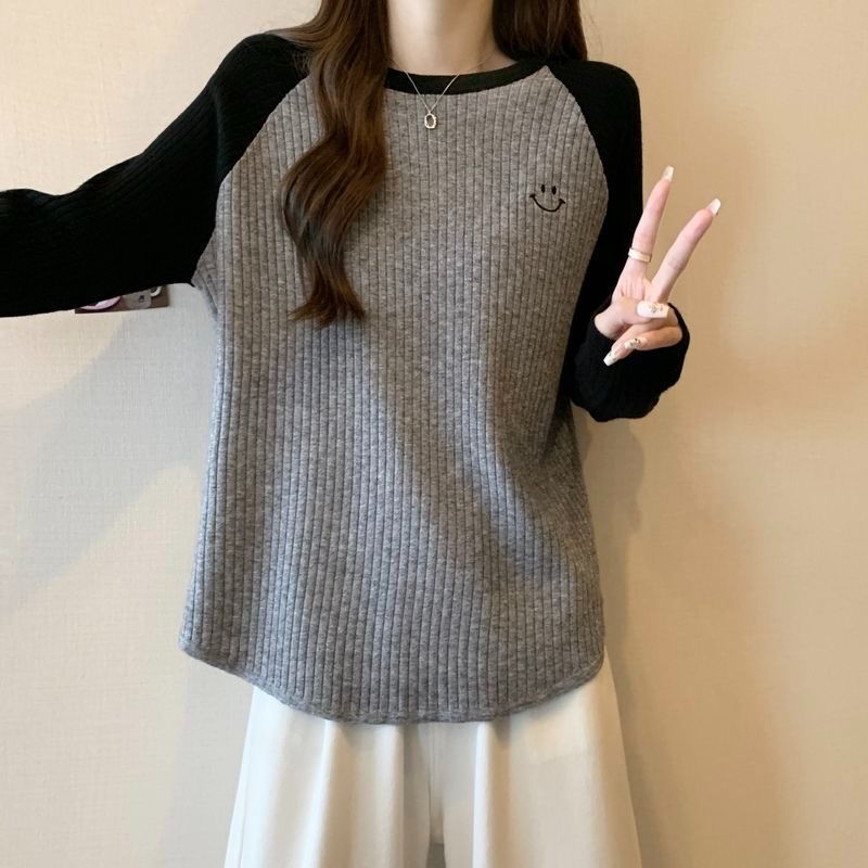 大码重磅加厚坑条撞色打底衫女秋冬季新款宽松显瘦保暖长袖上衣女