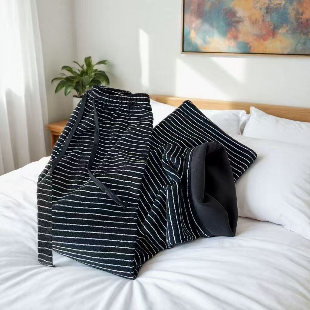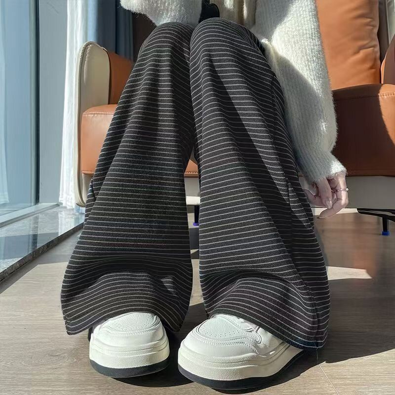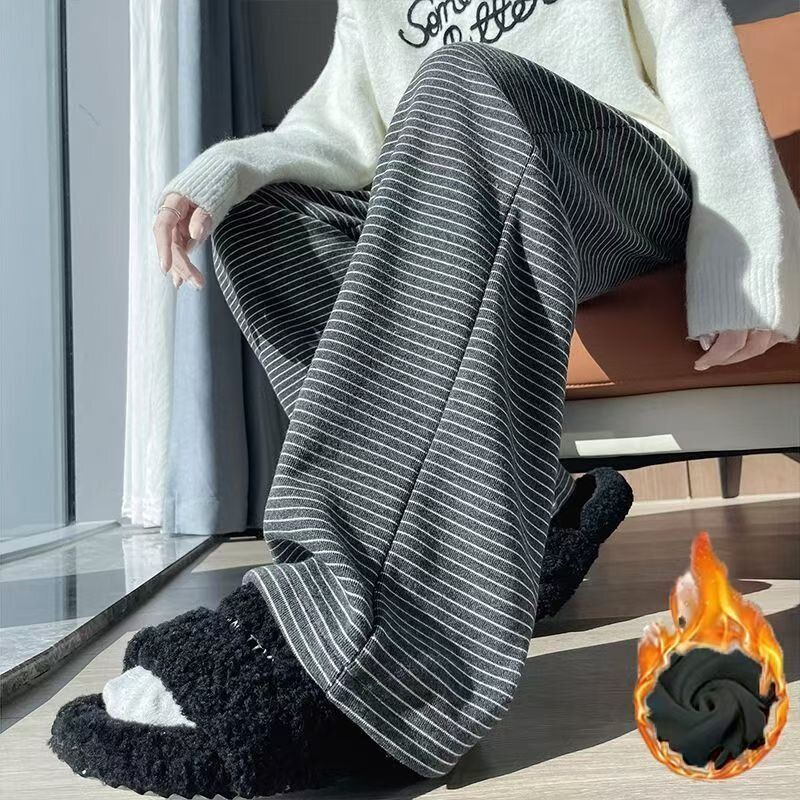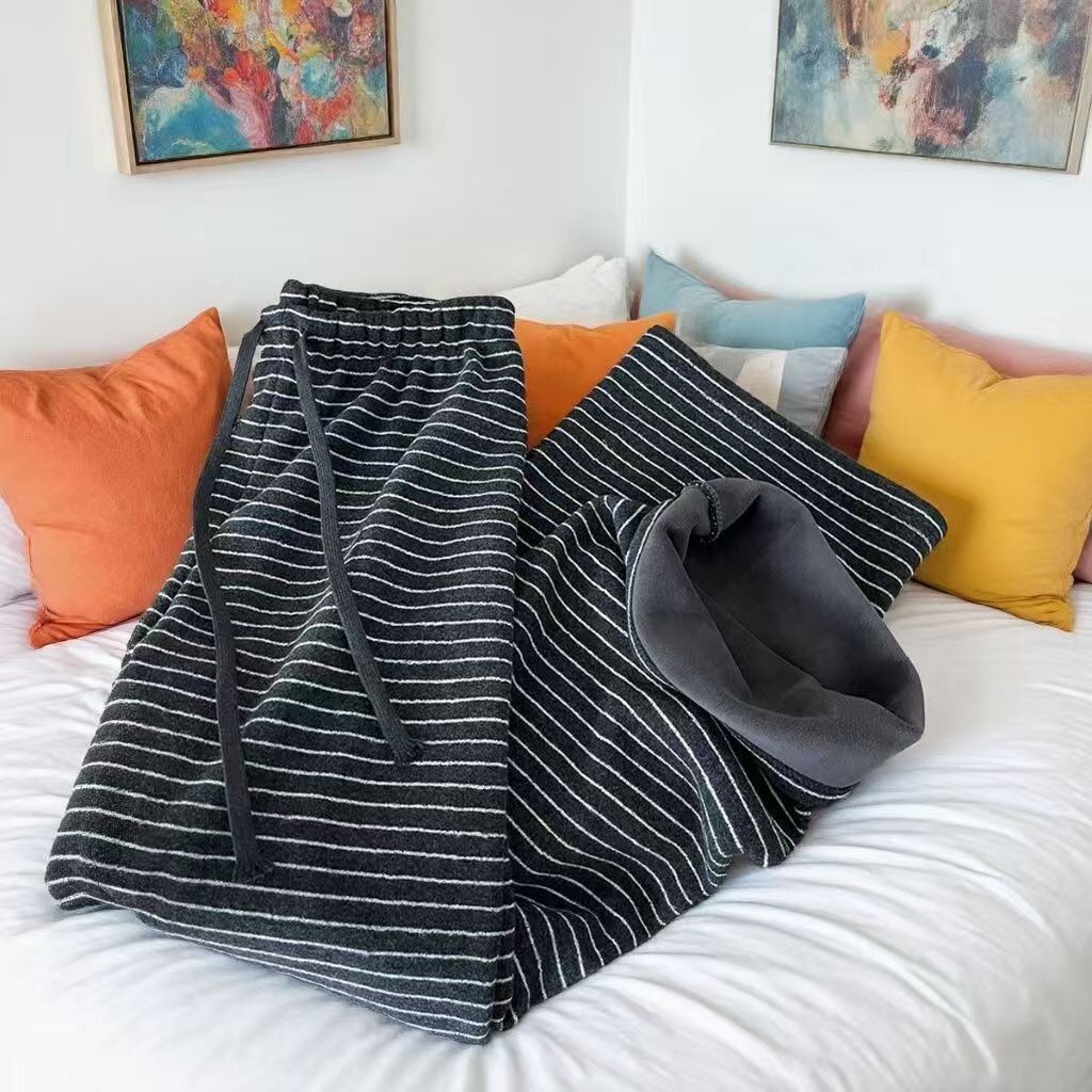 秋冬慵懒加绒加厚显瘦条纹休闲裤休闲阔腿冬季新款梨形拖地女裤