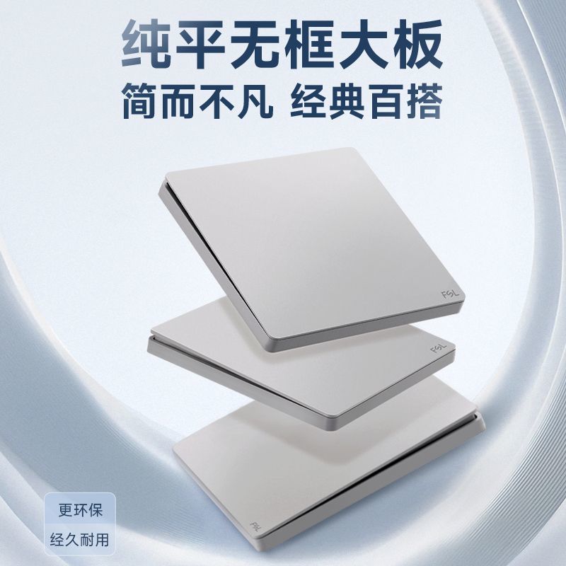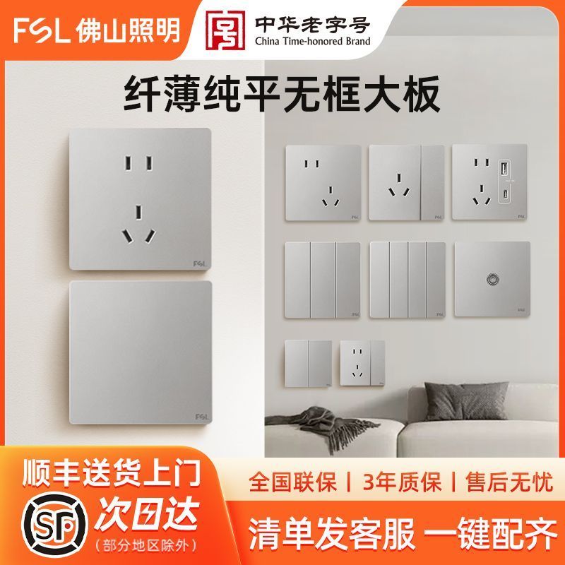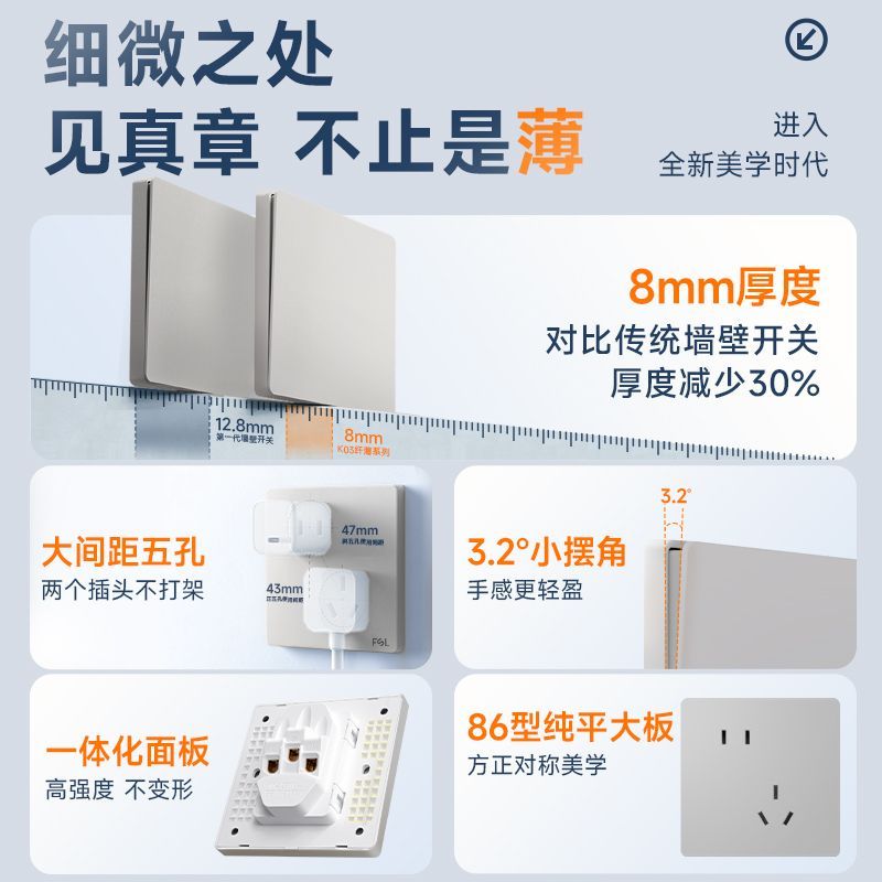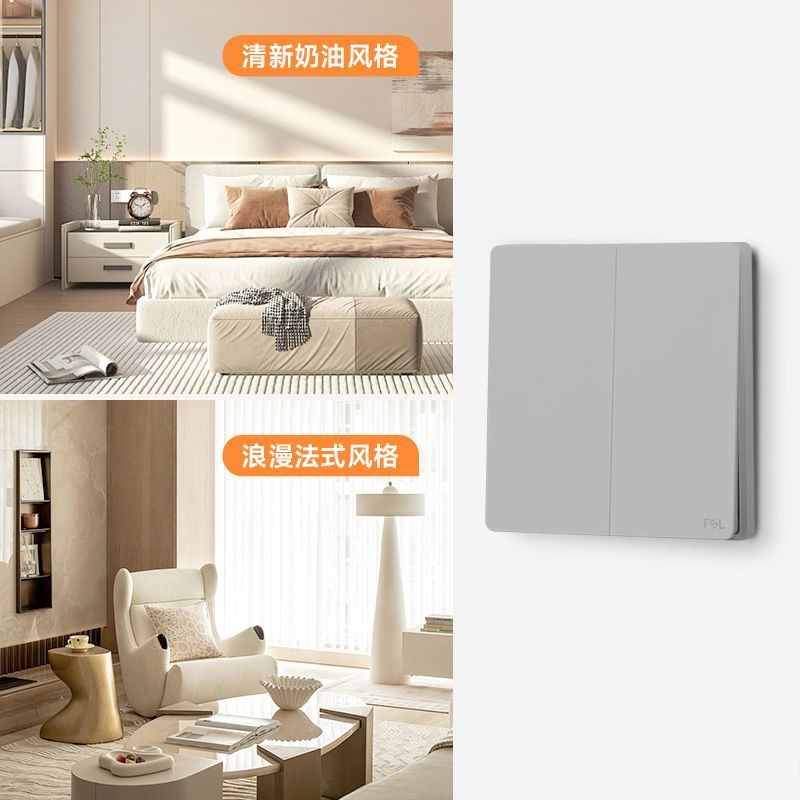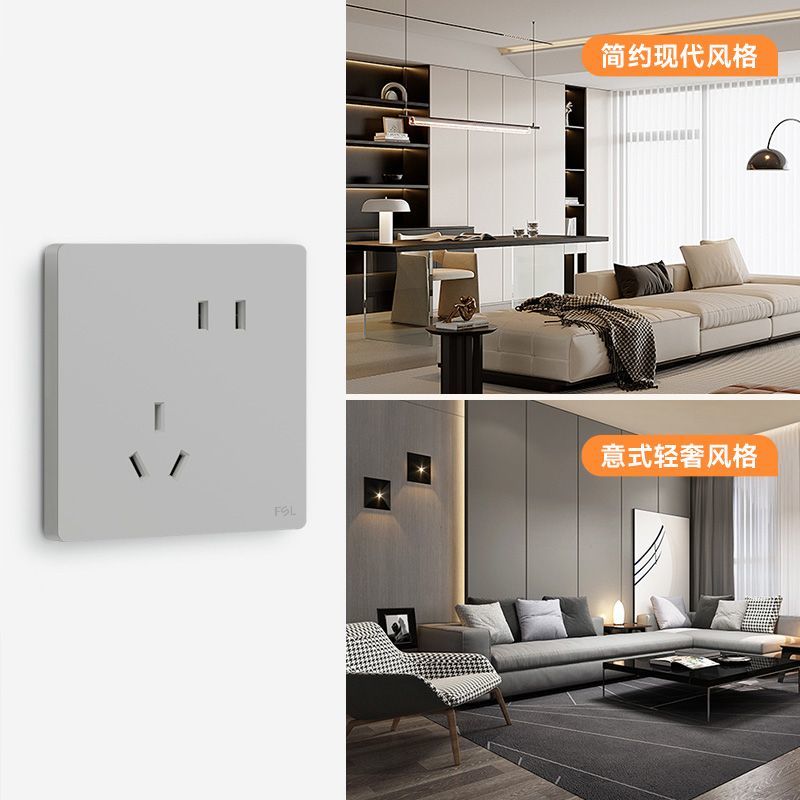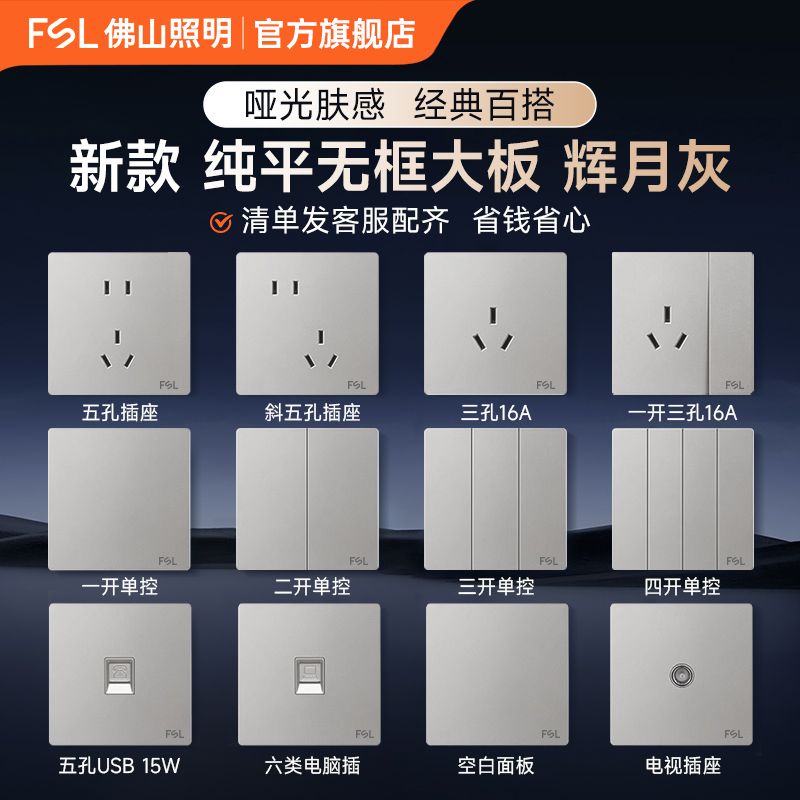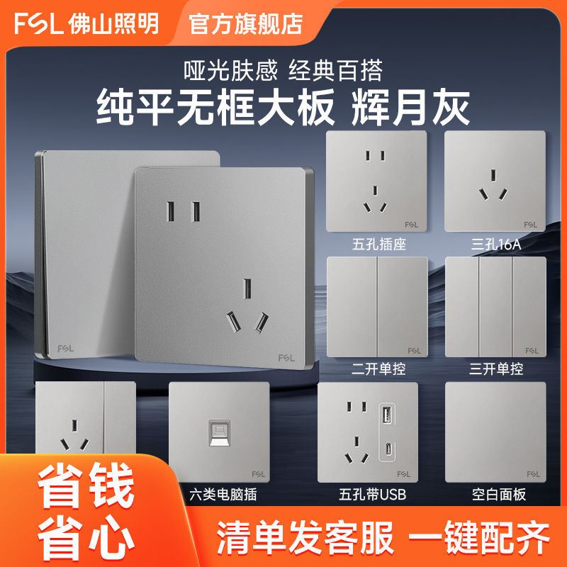 佛山照明开关插座86型面板墙壁暗装超薄大面板肤感一开五孔悦享灰