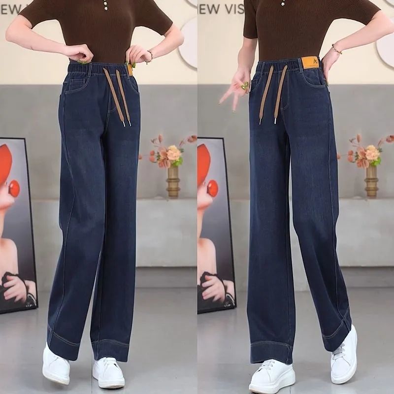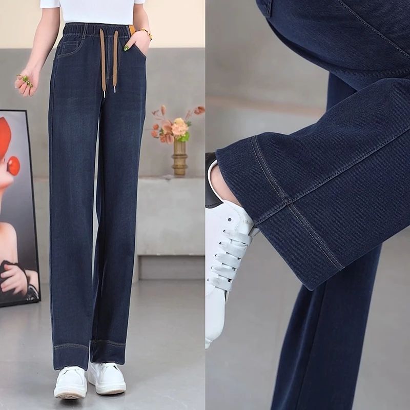 春秋新款宽松中年妈妈松紧腰牛仔裤女弹力高腰阔腿显瘦百搭裤子女